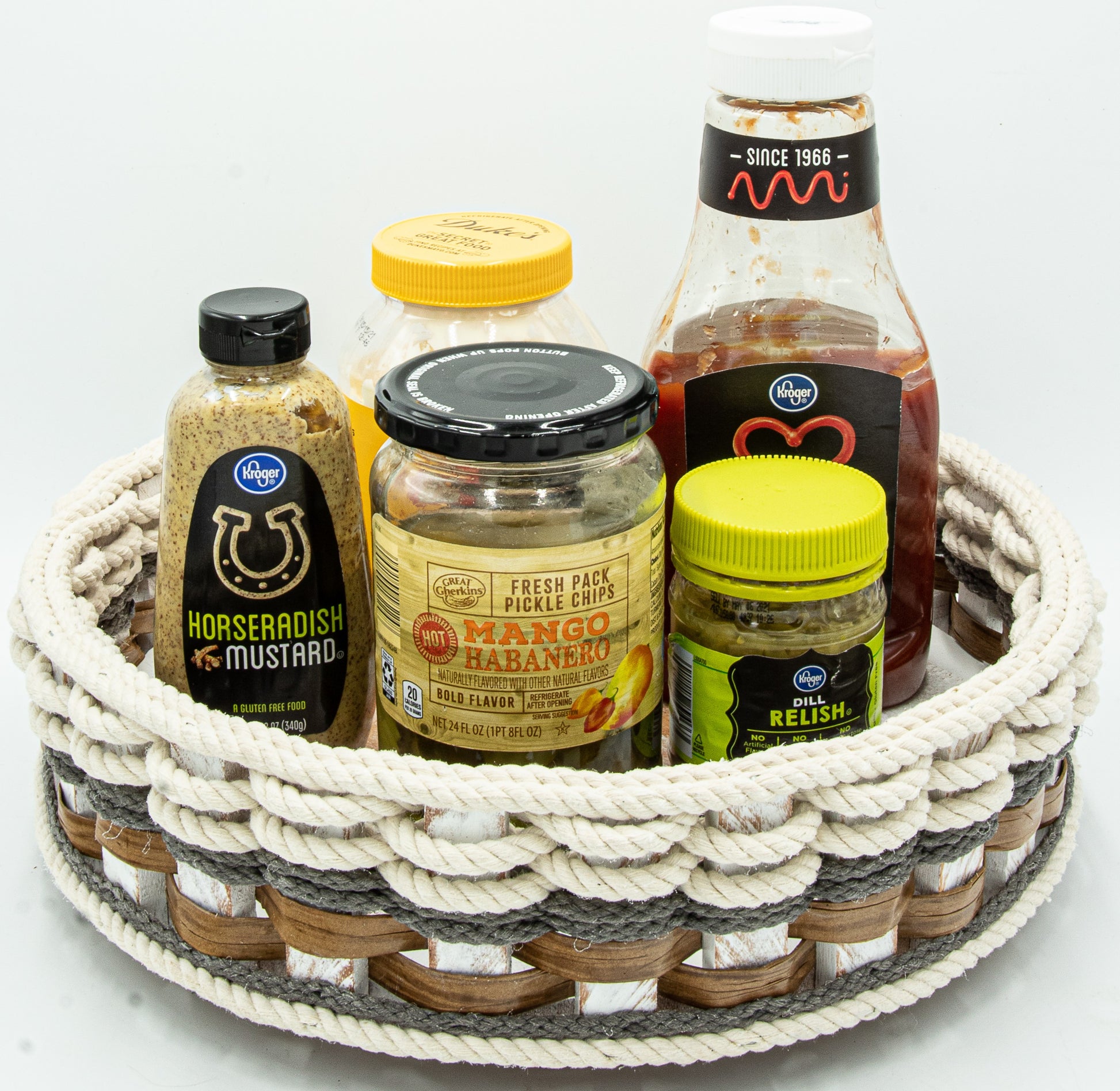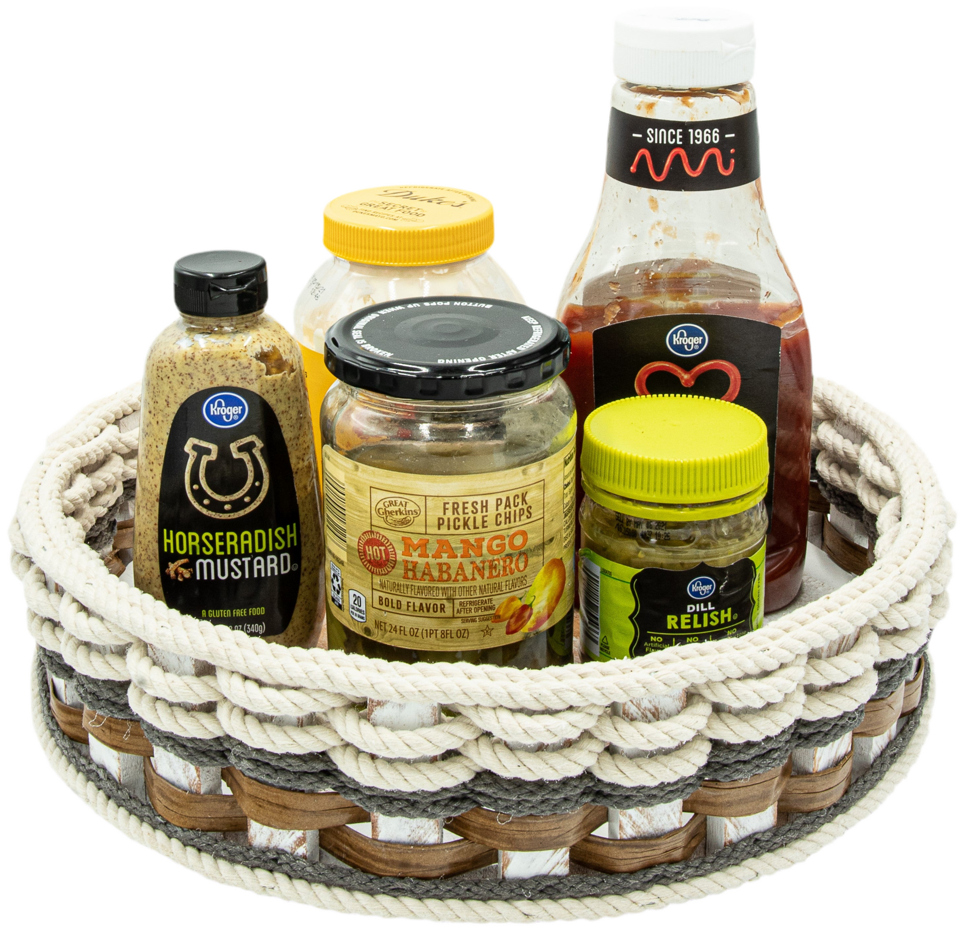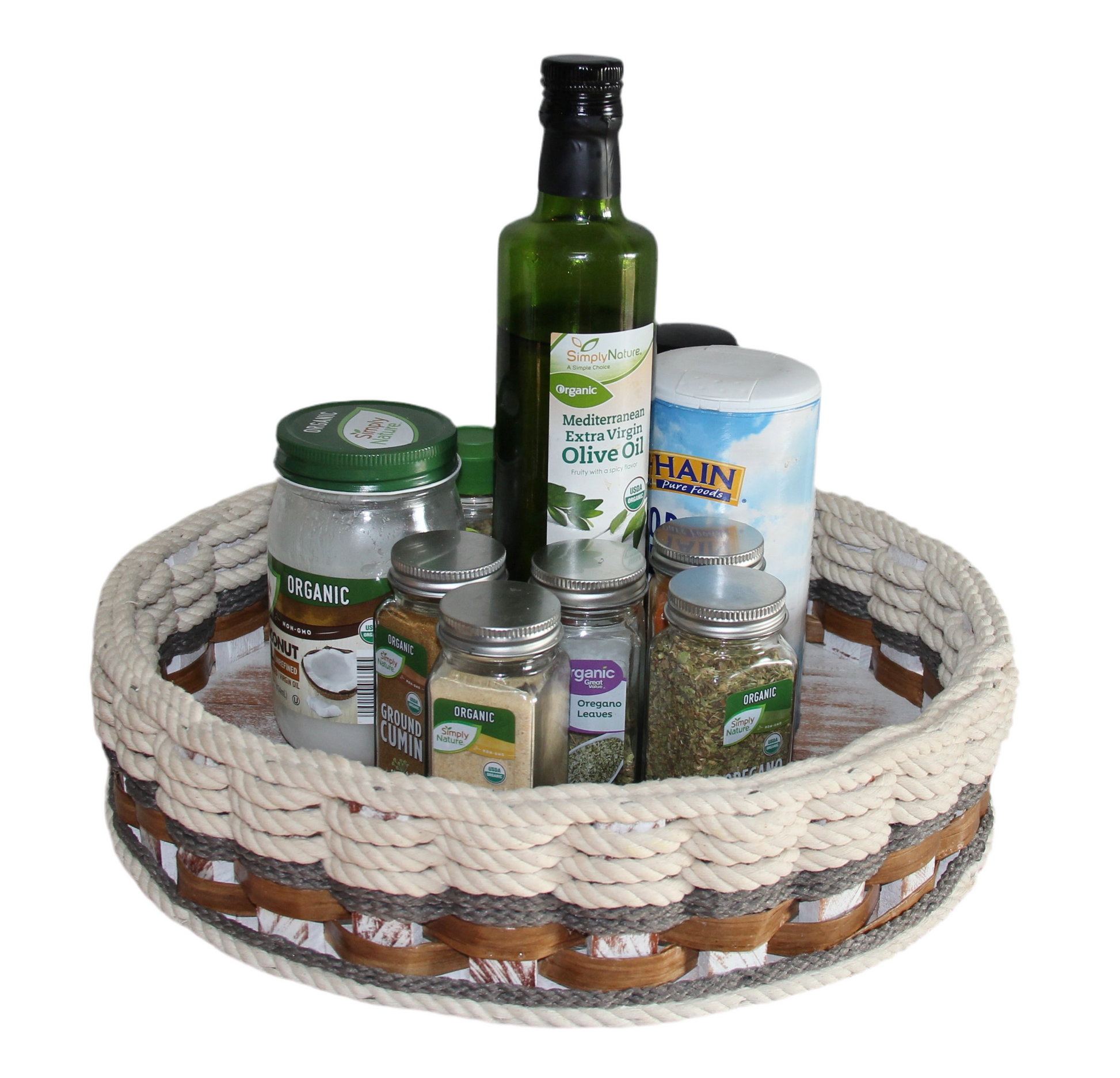 Our 13 inch Lazy Susan will create so many different looks and can be used for multiple uses. It looks great in your kitchen for cooking oils and spices! Or it could be used for your fresh fruit. Also looks great when entertaining for all your condiments or simply put in a 12 inch serving dish inside the basket, this could be a plastic chip and dip round tray or a low 12 inch serving bowl. Whatever you use it for, it will not be lazy! 13x13x4