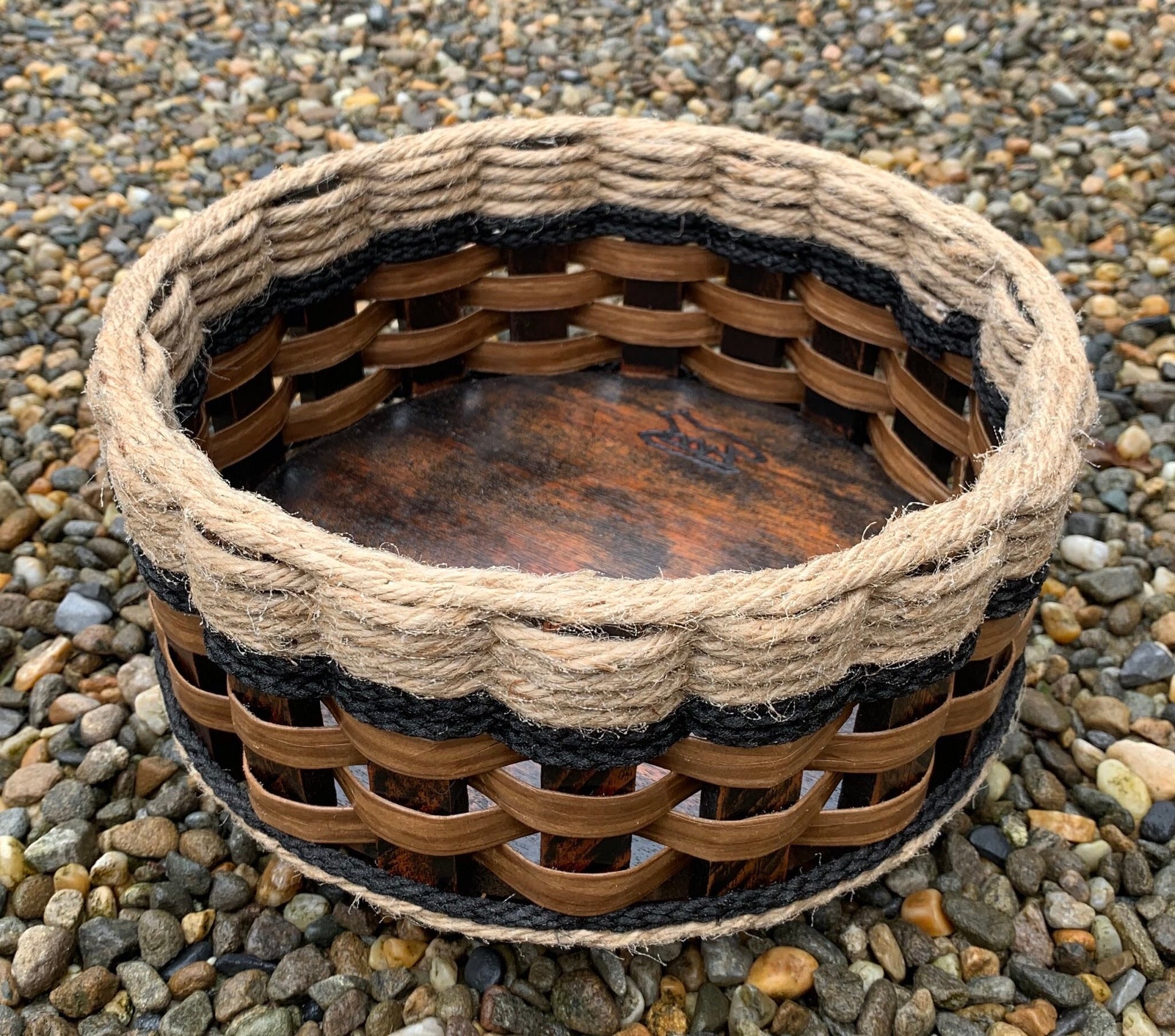 This is still one of our best selling lazy Susan’s baskets but in a more neutral look with either white washed mahogany or black distressed mahogany wood and jute and Bonnie cord. Overall size is 13 x 13 by 3 inch sides