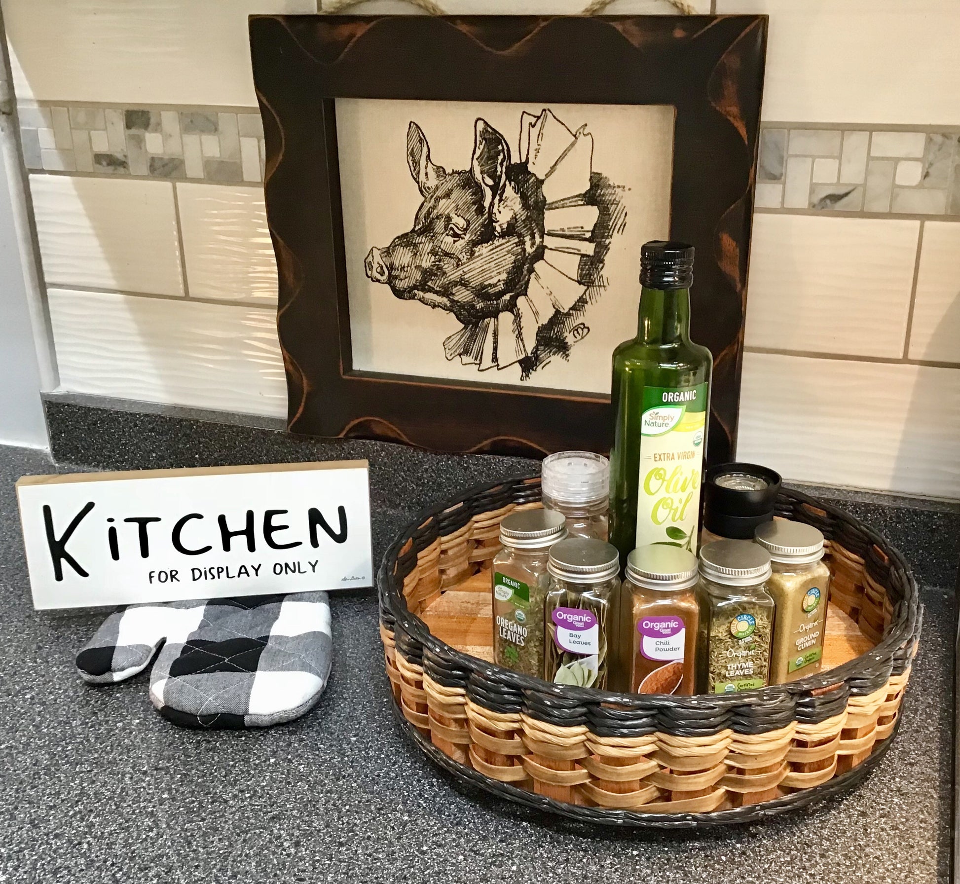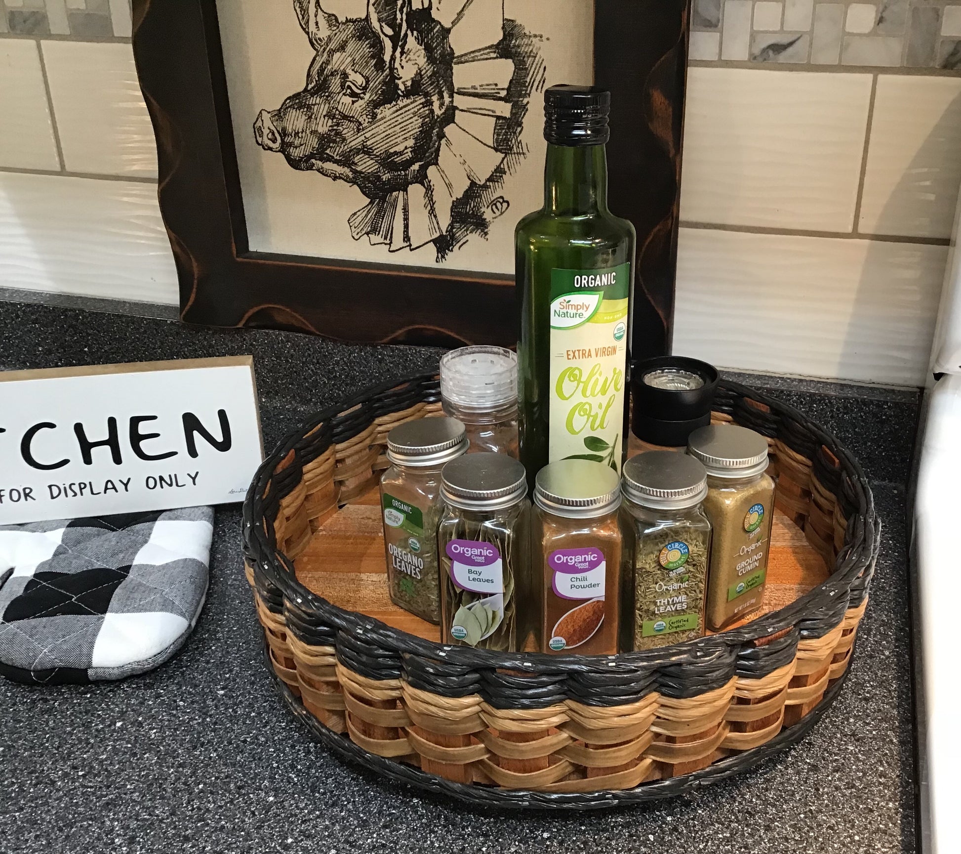 This is our 13" Lazy Susan. It can be used for fruit, condiments, spices, cooking oils, medicines, serving tray (any 12 inch serving plate or dish),mail or any number of things you can think of. 13"W x 3"H total height 3 3/4" with the lazy Susan mech.