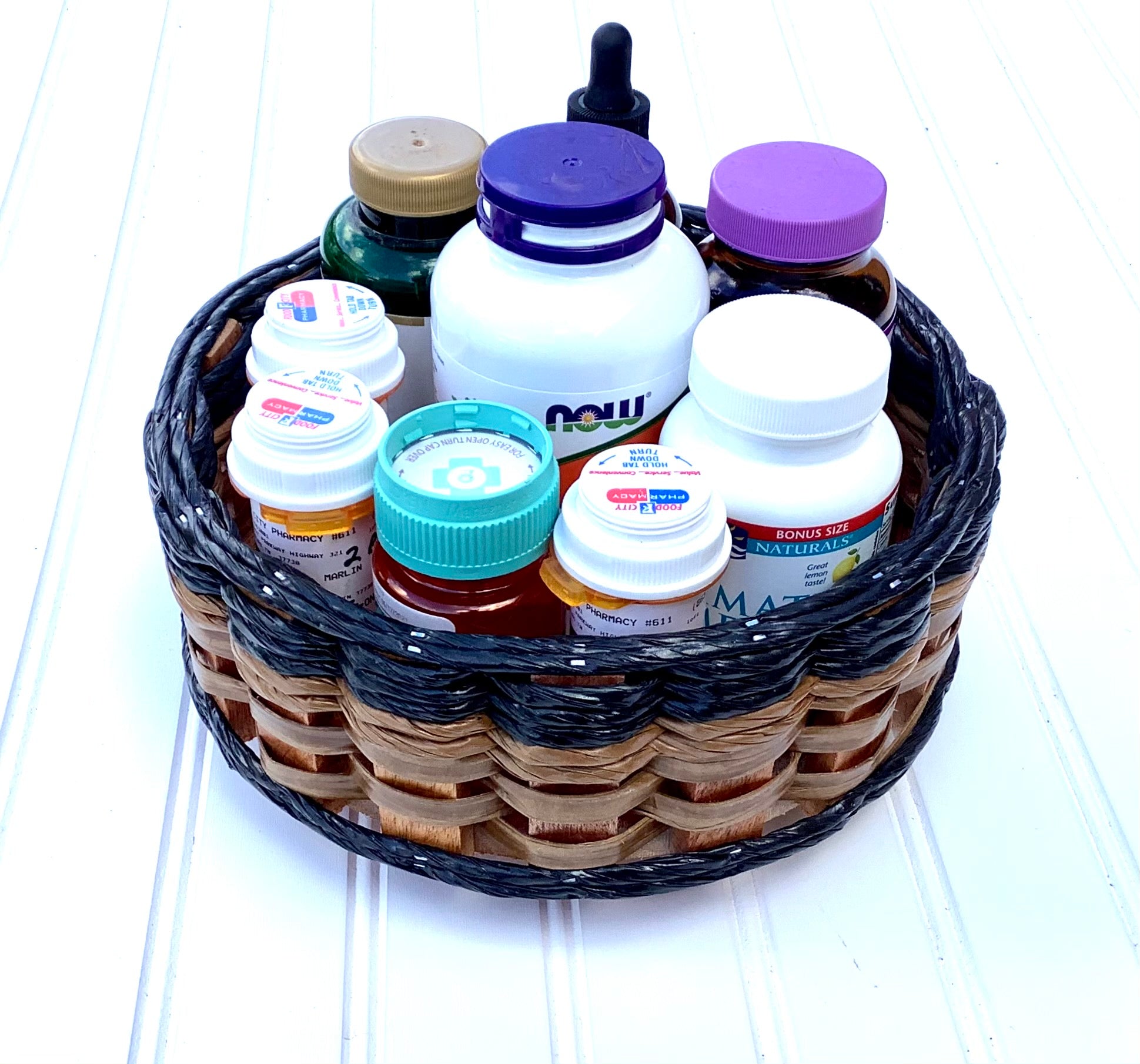Do you need a small basket beside your bed on your nightstand for pills, oils, or lotion? This small 8 inch lazy Susan basket will help your nightstand look less cluttered and organized. Plus it spins. The size of this basket is 8 by 8 by 3 3/4 inches tall with lazy Susan mechanism.