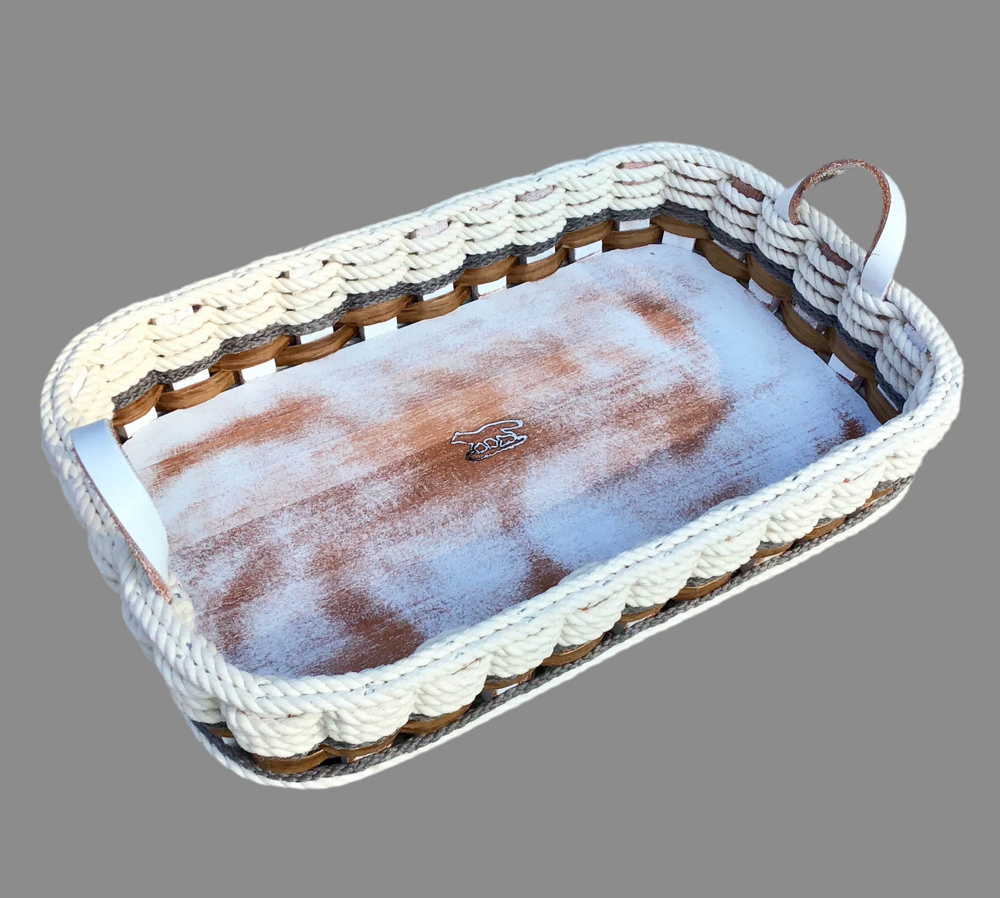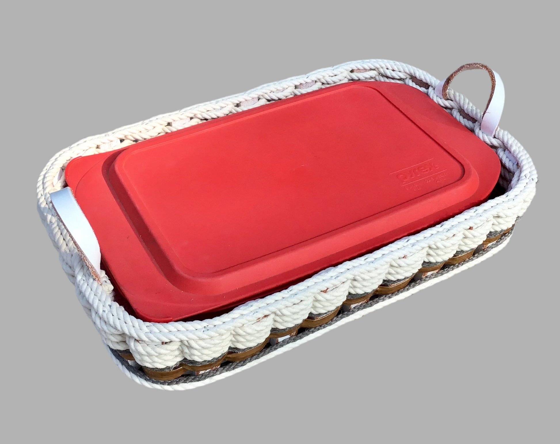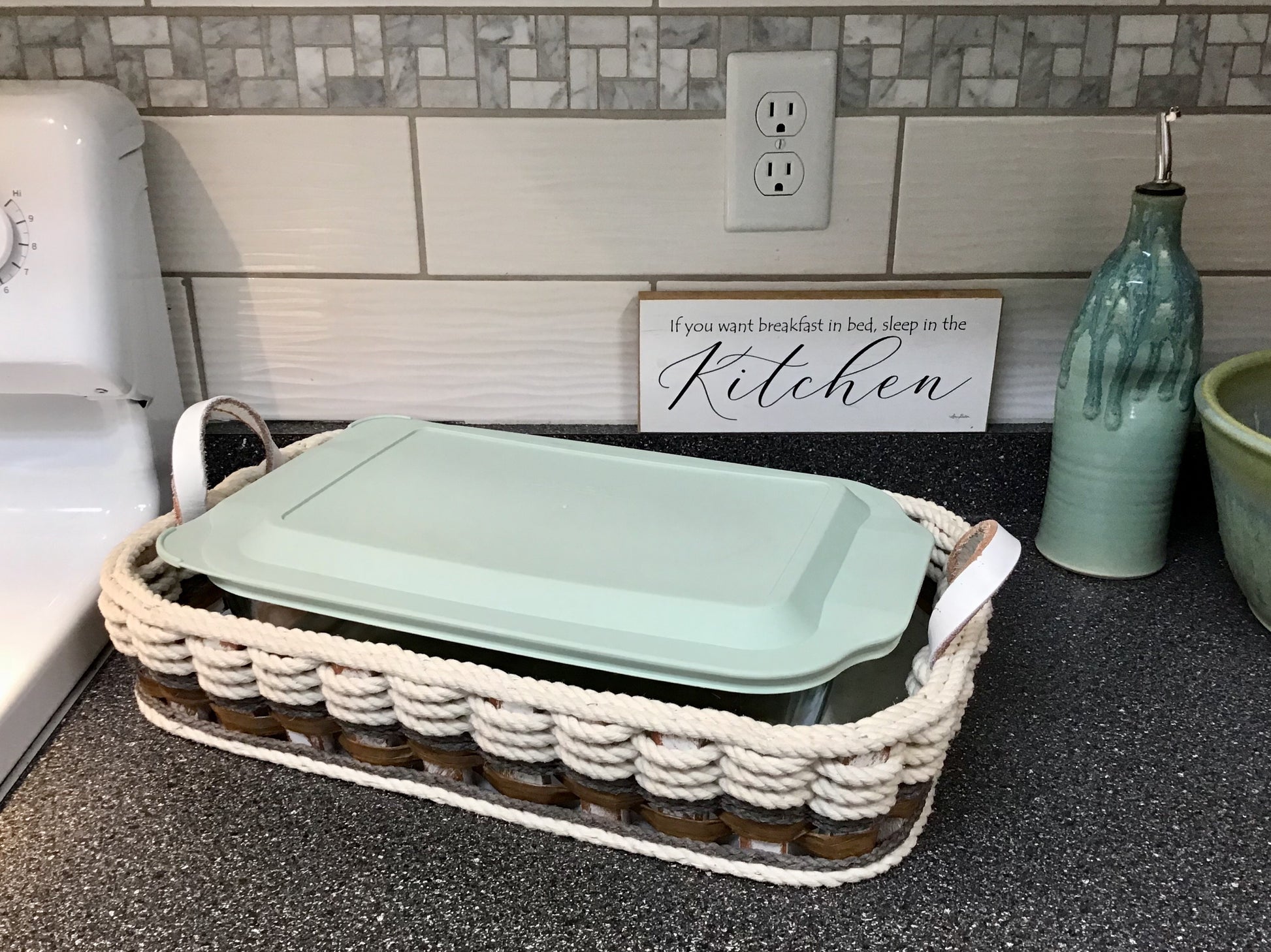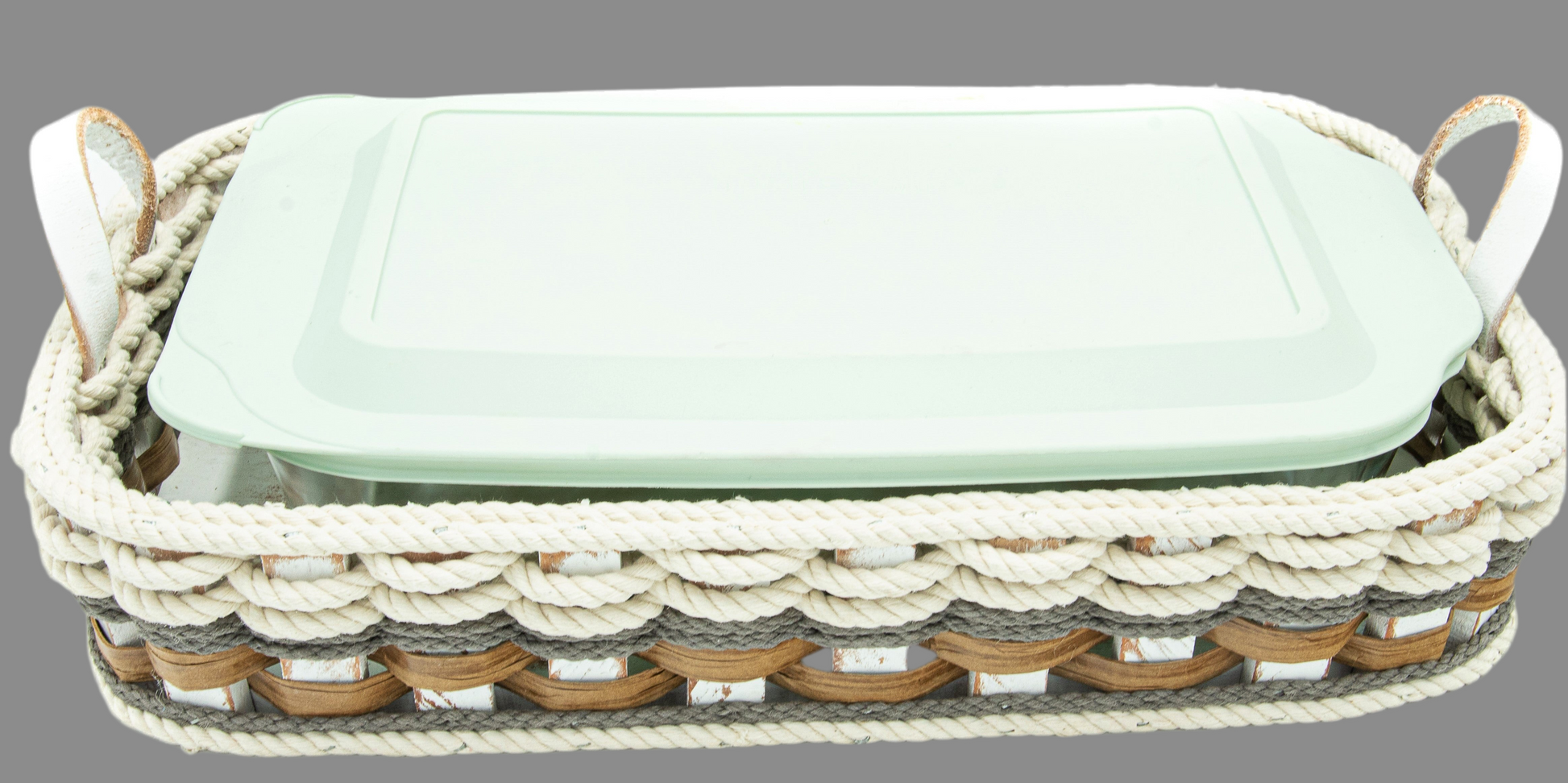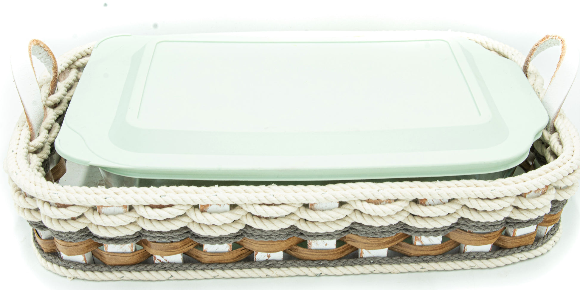 Carry your casserole in style with our Cottage Grey Casserole Basket. This lovely basket keeps your dish from sliding around in your car while traveling to friends or families house. Also this basket can double as a tray to entertain with. Impress all your family and friends with our Cottage Grey Casserole Tray Basket! You can also use this basket to organize or display items that you want to keep out on a dresser, chest, or table. Or try hanging this basket on the wall to add charm to your kitchen. The 1/2 inch thick solid mahogany bottom of this basket is stained with a white stain and sanded so it is distressed which allows the mahogany wood to show through. Our 9x13 basket fits the newer Pyrex 9x13 with lids.