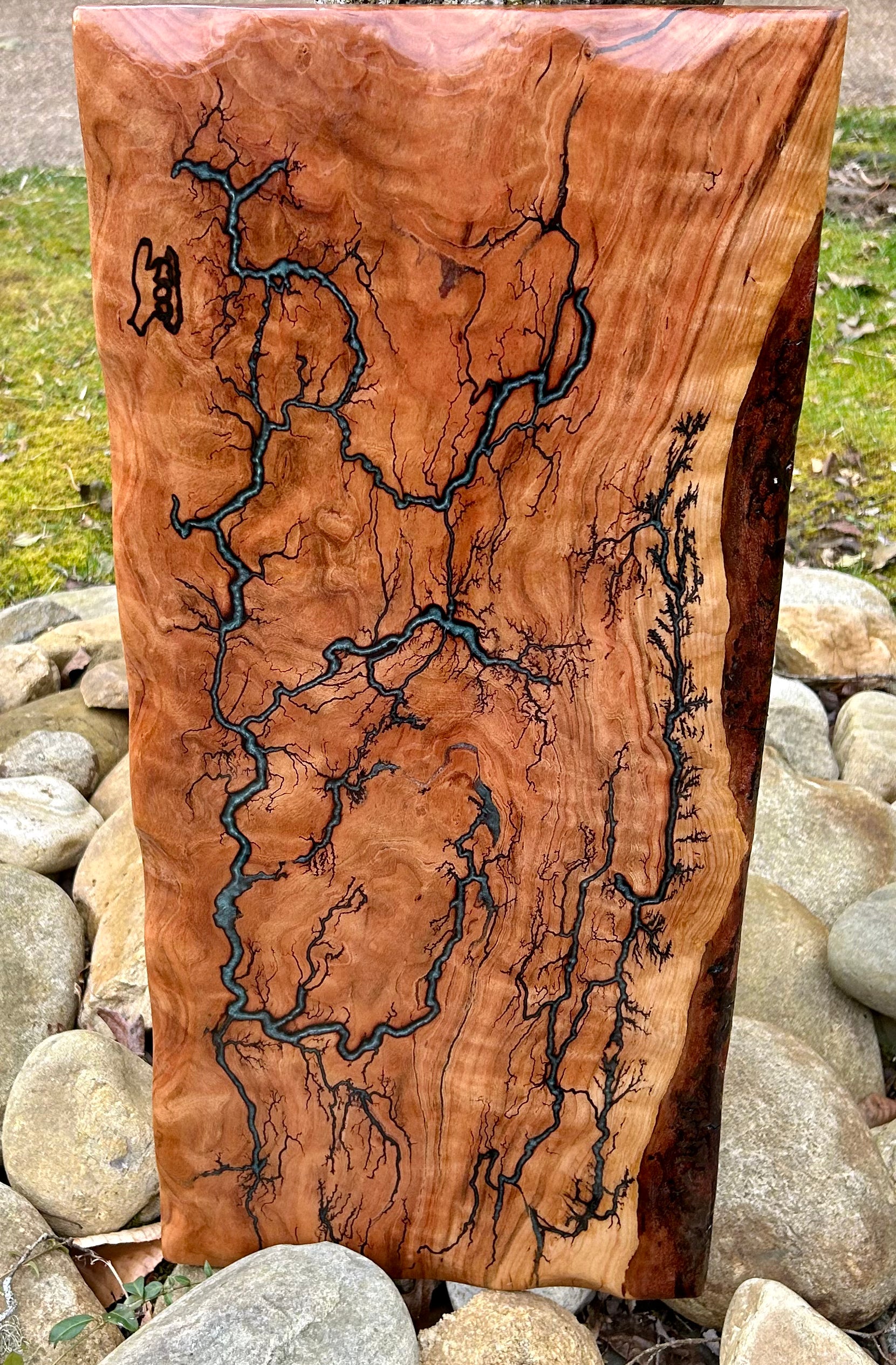This 28 inch long solid cherry live edge charcuterie board has fractal burn filled with blue epoxy and then a top coat of clear epoxy on the board as well. It looks like rivers going all through the board. So beautiful, it could even be a piece of art for your wall to sit on a shelf or metal brackets.