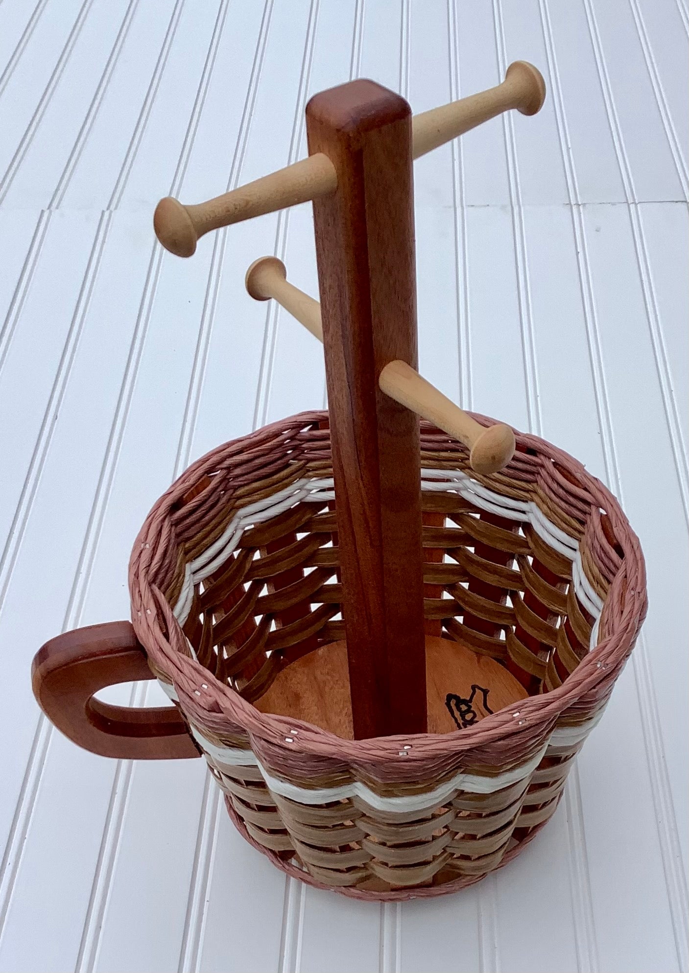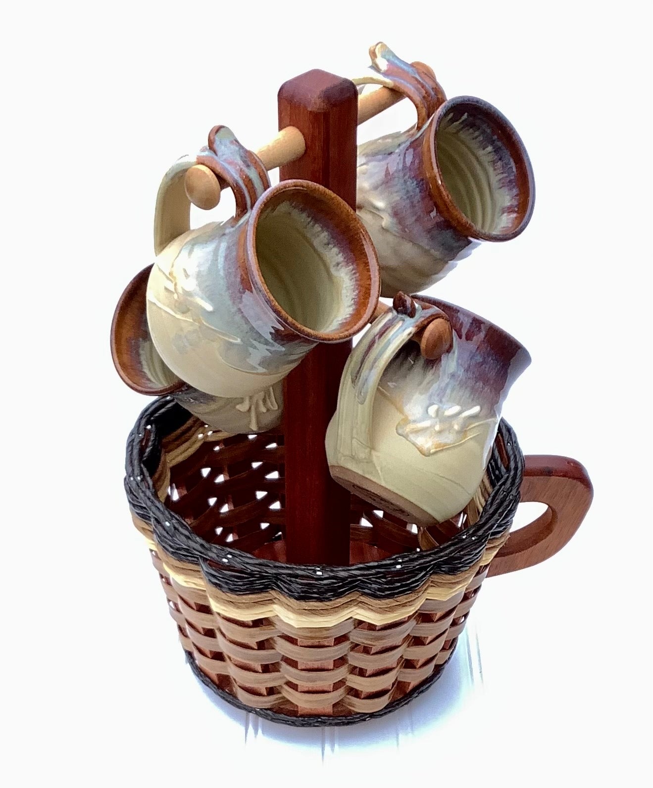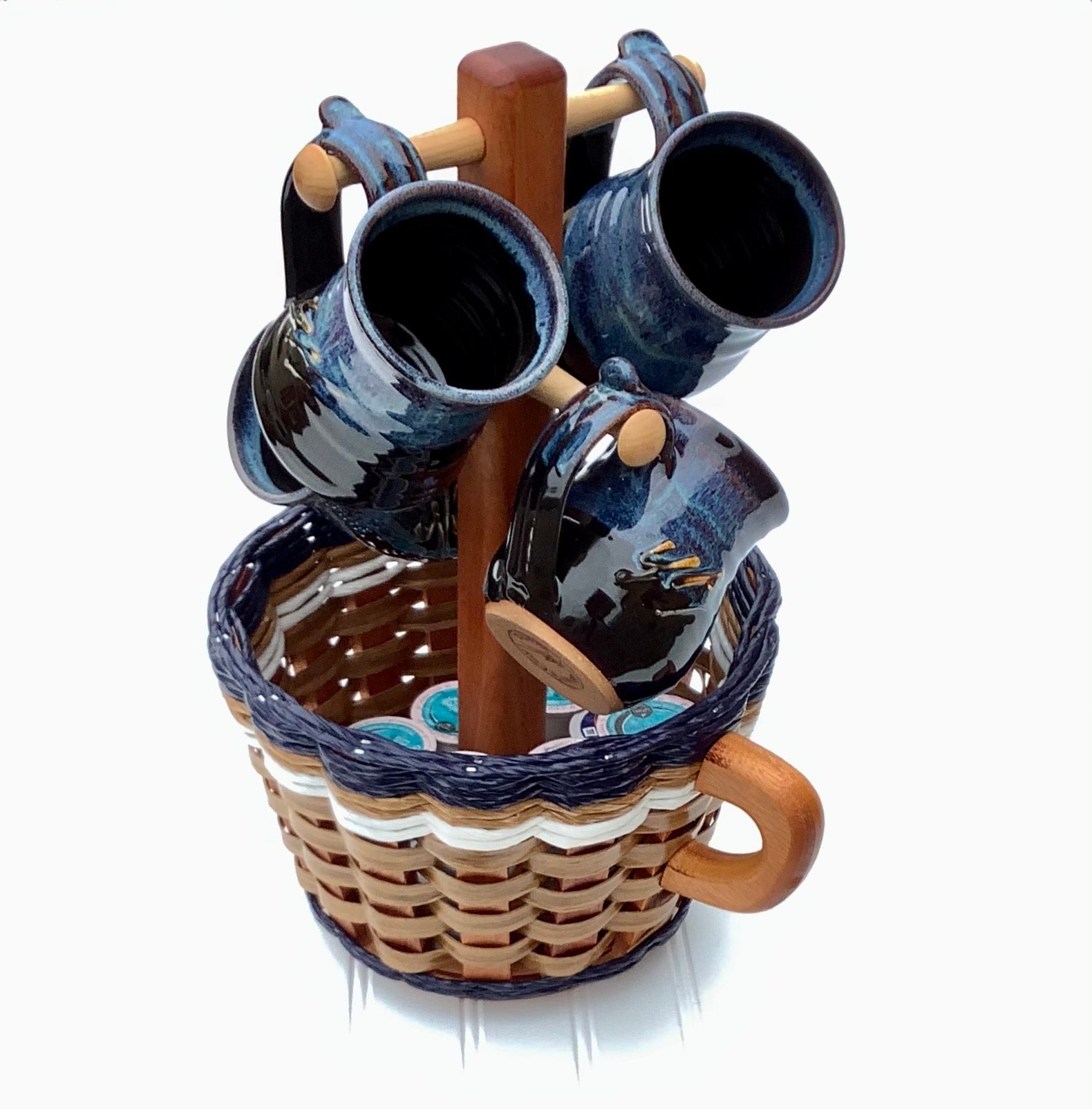 Our Coffee Mug Basket is so unique but very purposeful! It holds 4 of your favorite mugs plus your K-cup coffees, teas or whatever you happen to drink in small packs or 1 lb bags. Has a lazy-susan on the bottom, so it does spin! This has became one of our top sellers at the craft shows. If you drink coffee or tea you need this basket. Or if you have family or friends that drink Coffee then this basket will truly make the best gift! The dimensions are 9x9 by 15 1/2 inches tall.