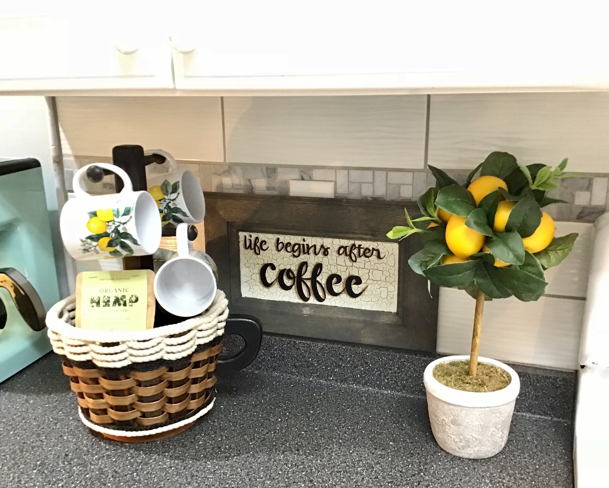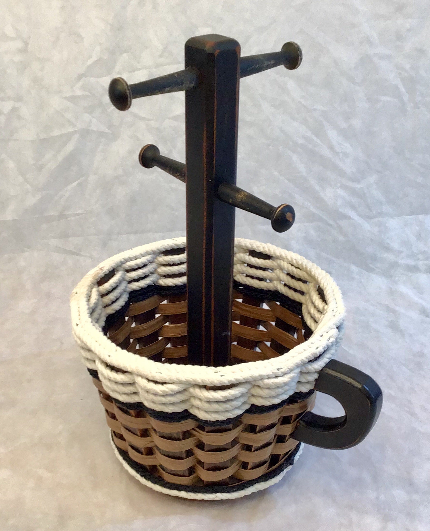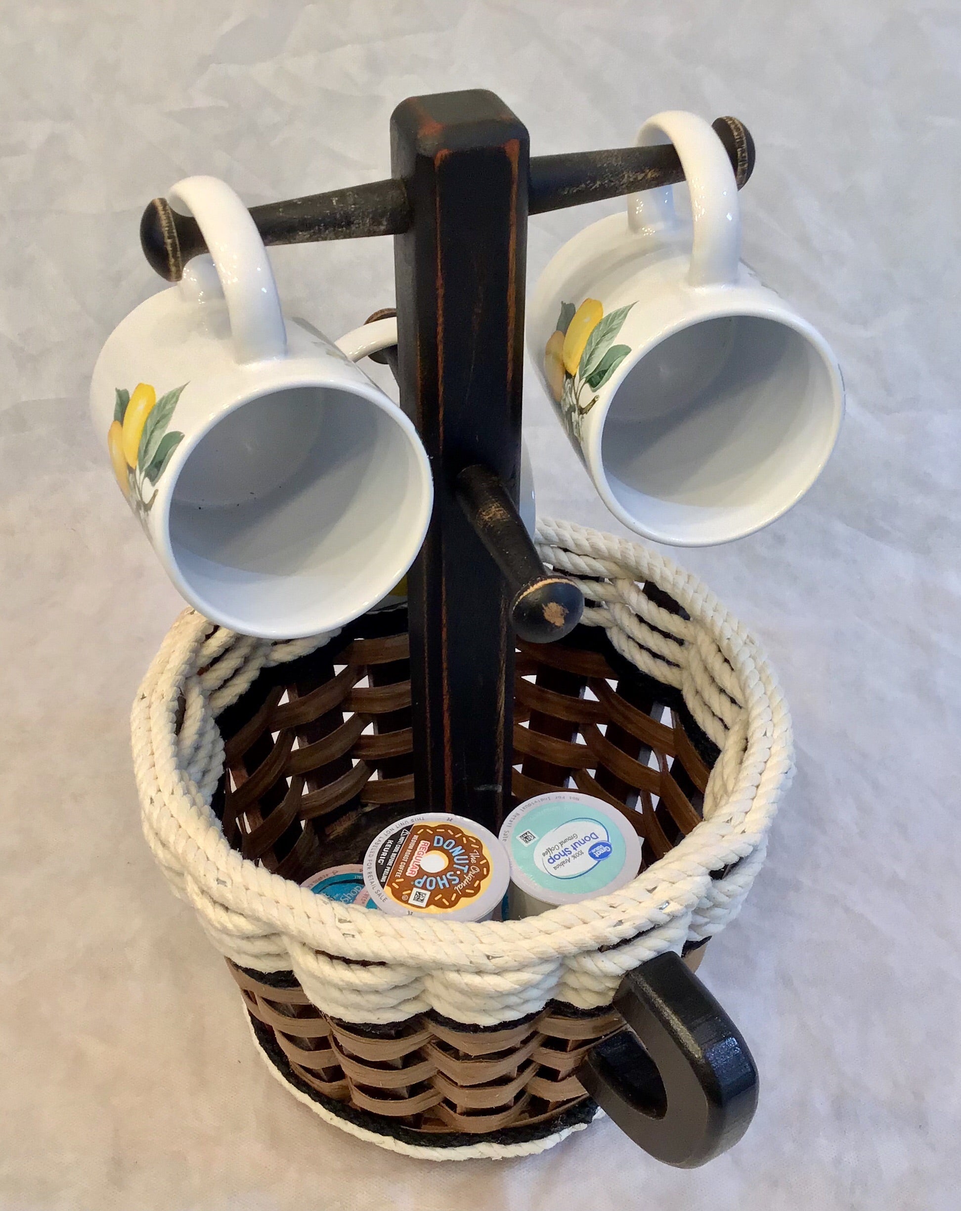 Our Coffee Mug Basket will hold all of your K-cups or 4- 1lb Coffee bags. And this basket that actually looks like a coffee mug spins! This is such a unique and functional basket! It makes a great gift!!! It will fit under your kitchen cabinets on the counter and holds 4 of your favorite mugs. Your coffee bar will be complete with our basket.