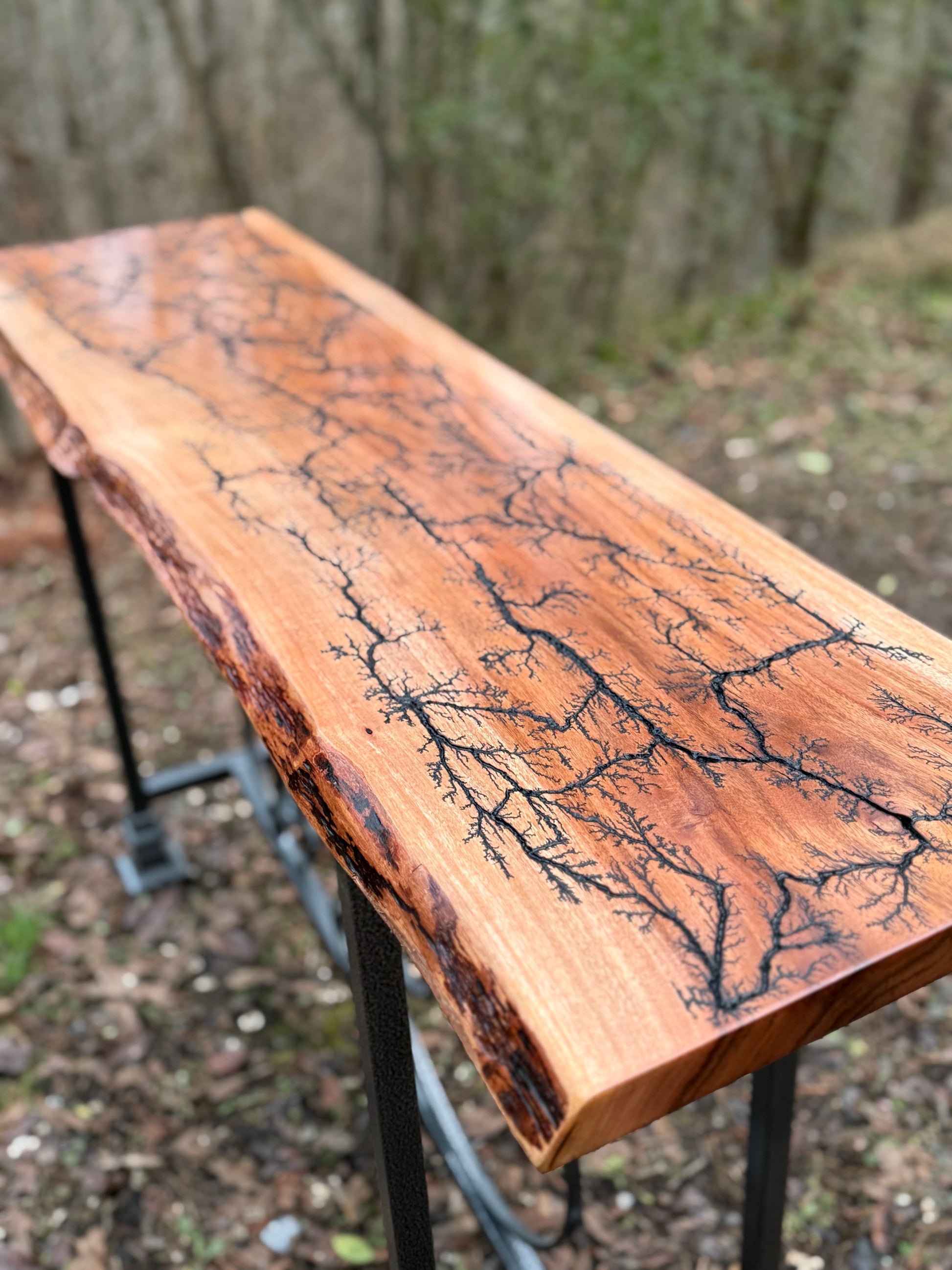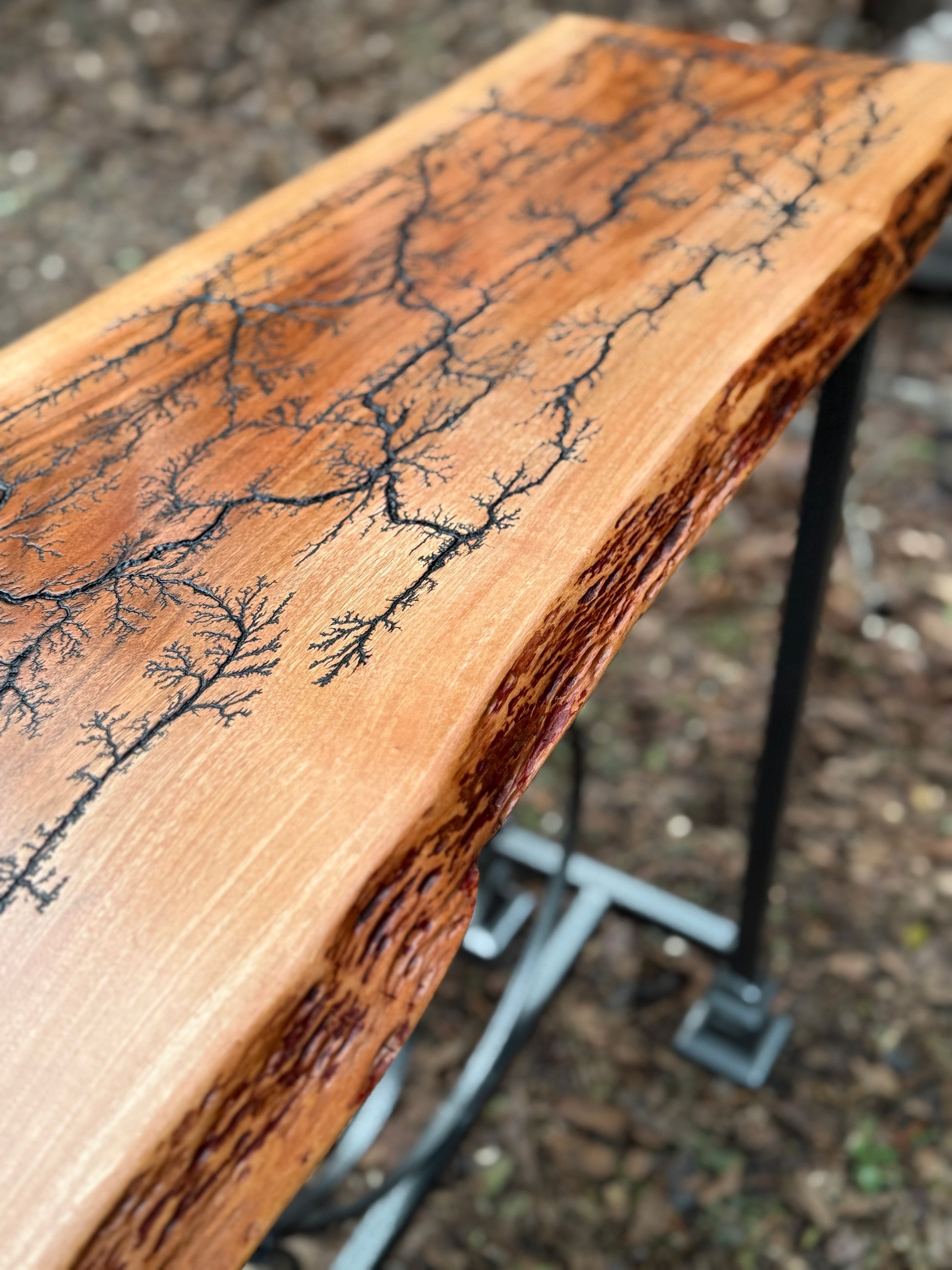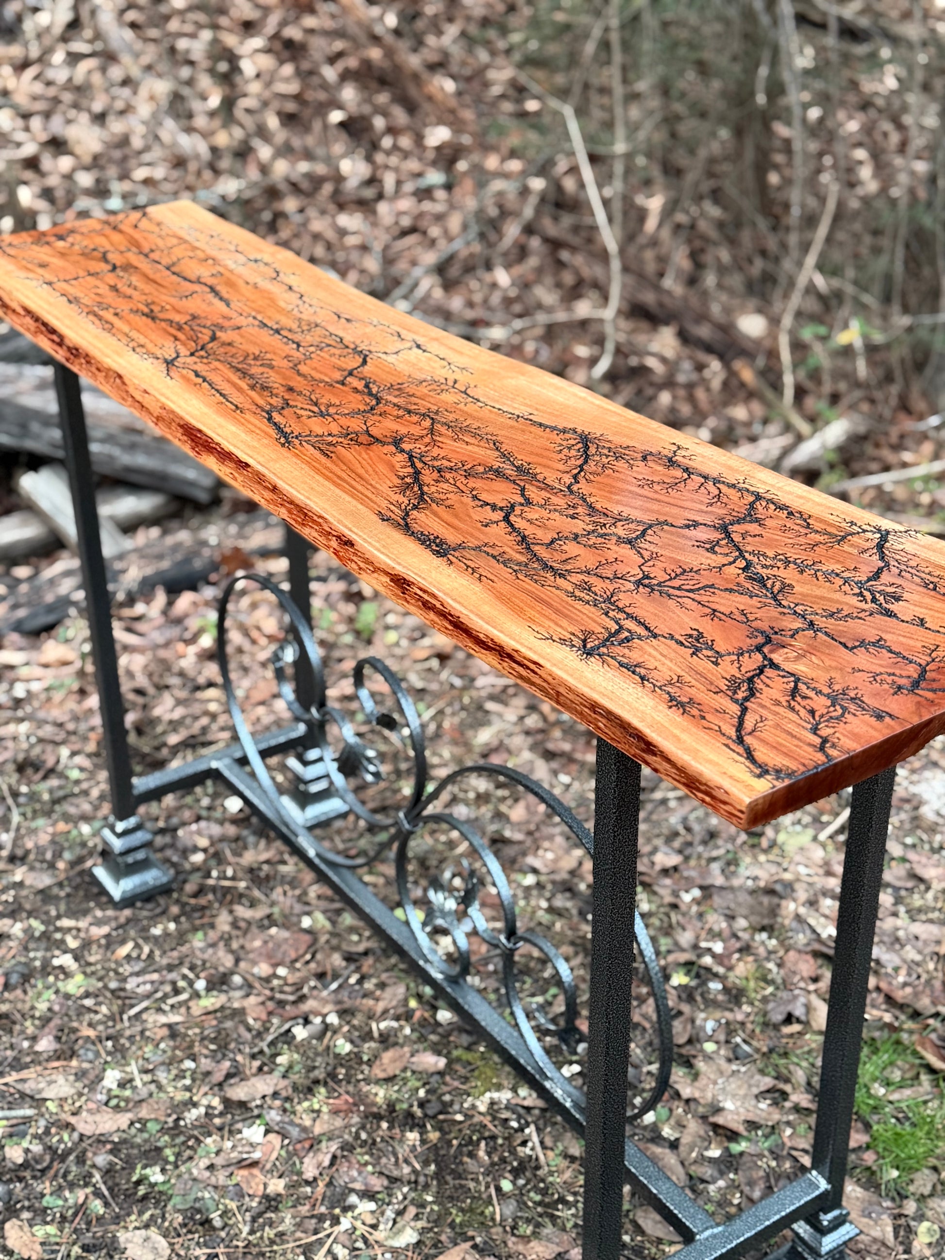 If you love the art of fractal wood burning or lichtenberg wood burning that is done with high voltage electricity on wood, then this beautiful Patagonian Rosewood table would add beauty and joy to your home. It’s skinny long and narrow size can fit just about anywhere. The uses are endless such as a sofa table, console table, desk, bar table, etc.