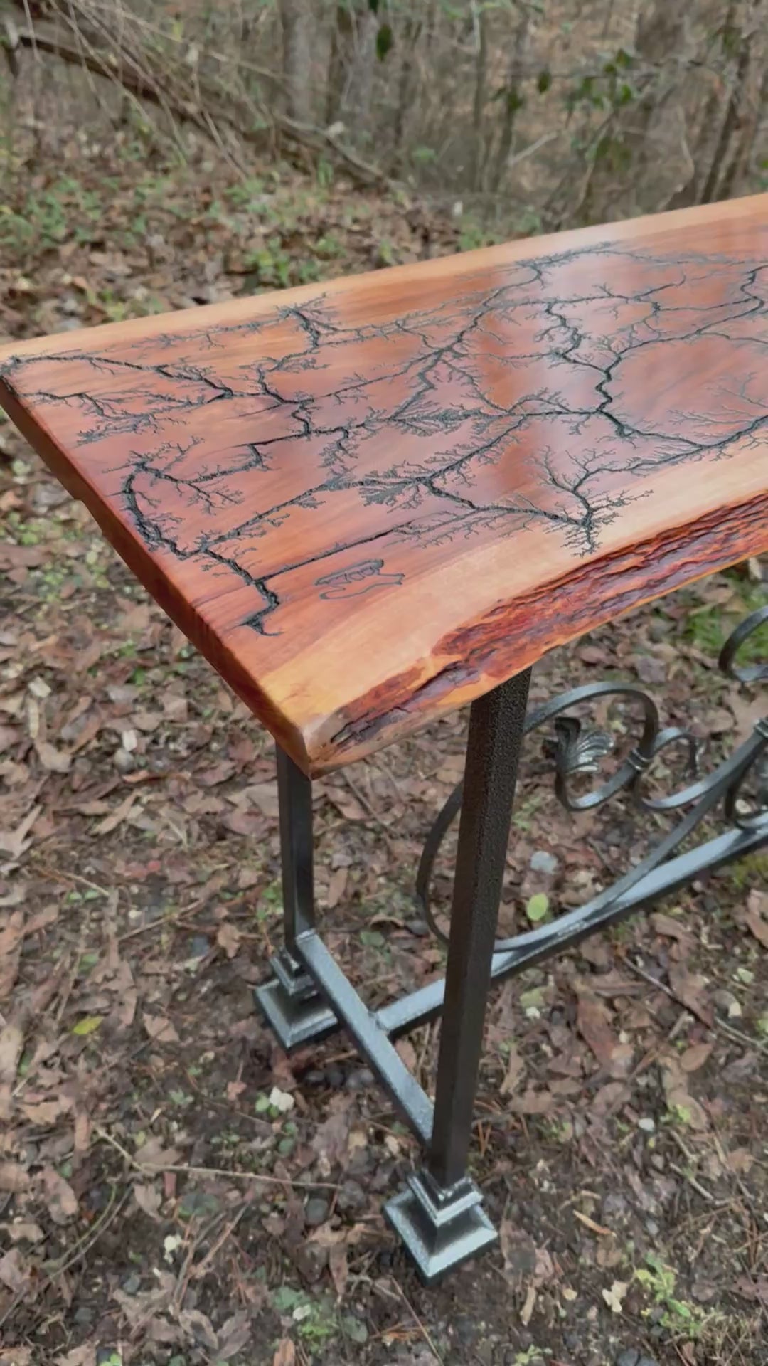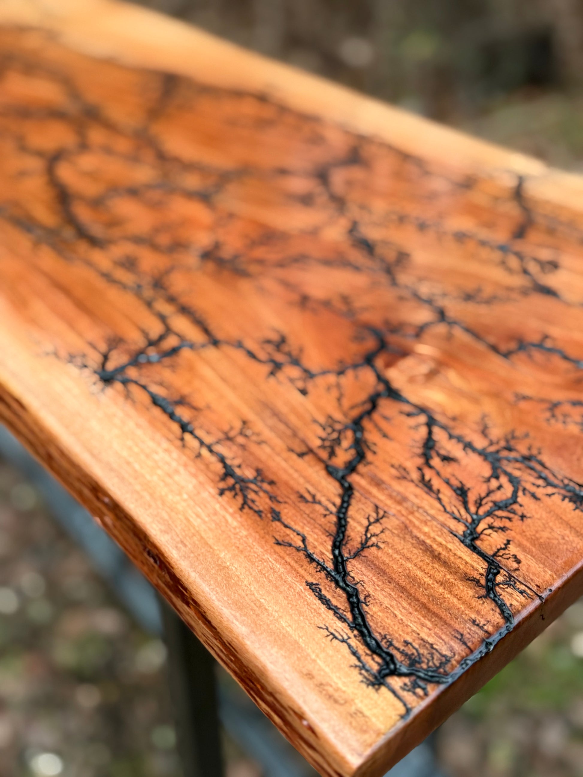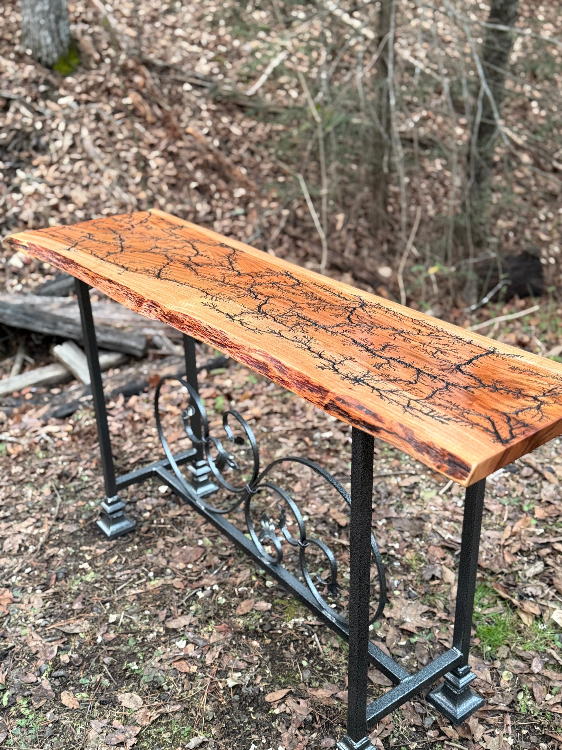 If you love the art of fractal wood burning or lichtenberg wood burning that is done with high voltage electricity on wood, then this beautiful Patagonian Rosewood table would add beauty and joy to your home. It’s skinny long and narrow size can fit just about anywhere. The uses are endless such as a sofa table, console table, desk, bar table, etc.