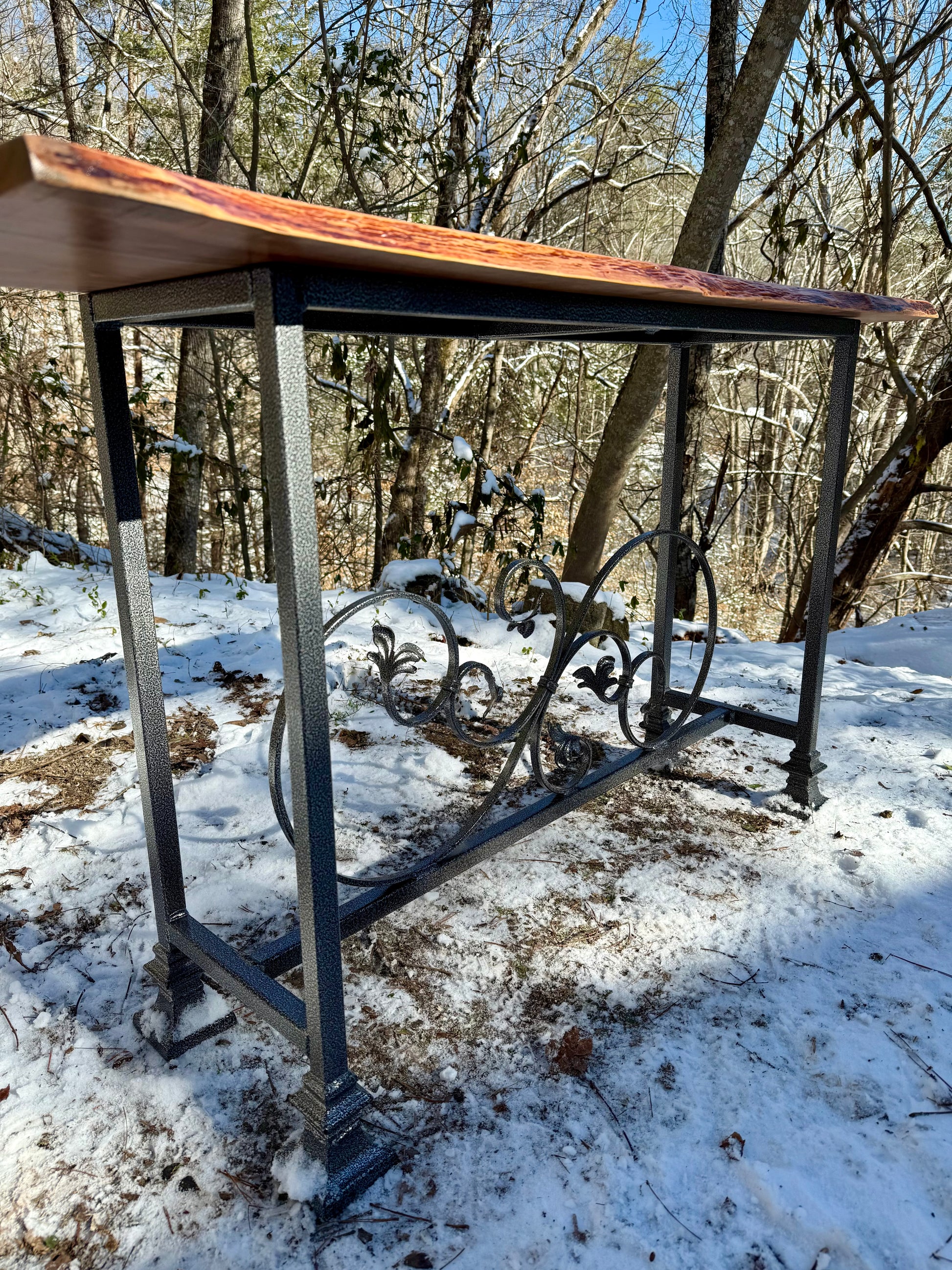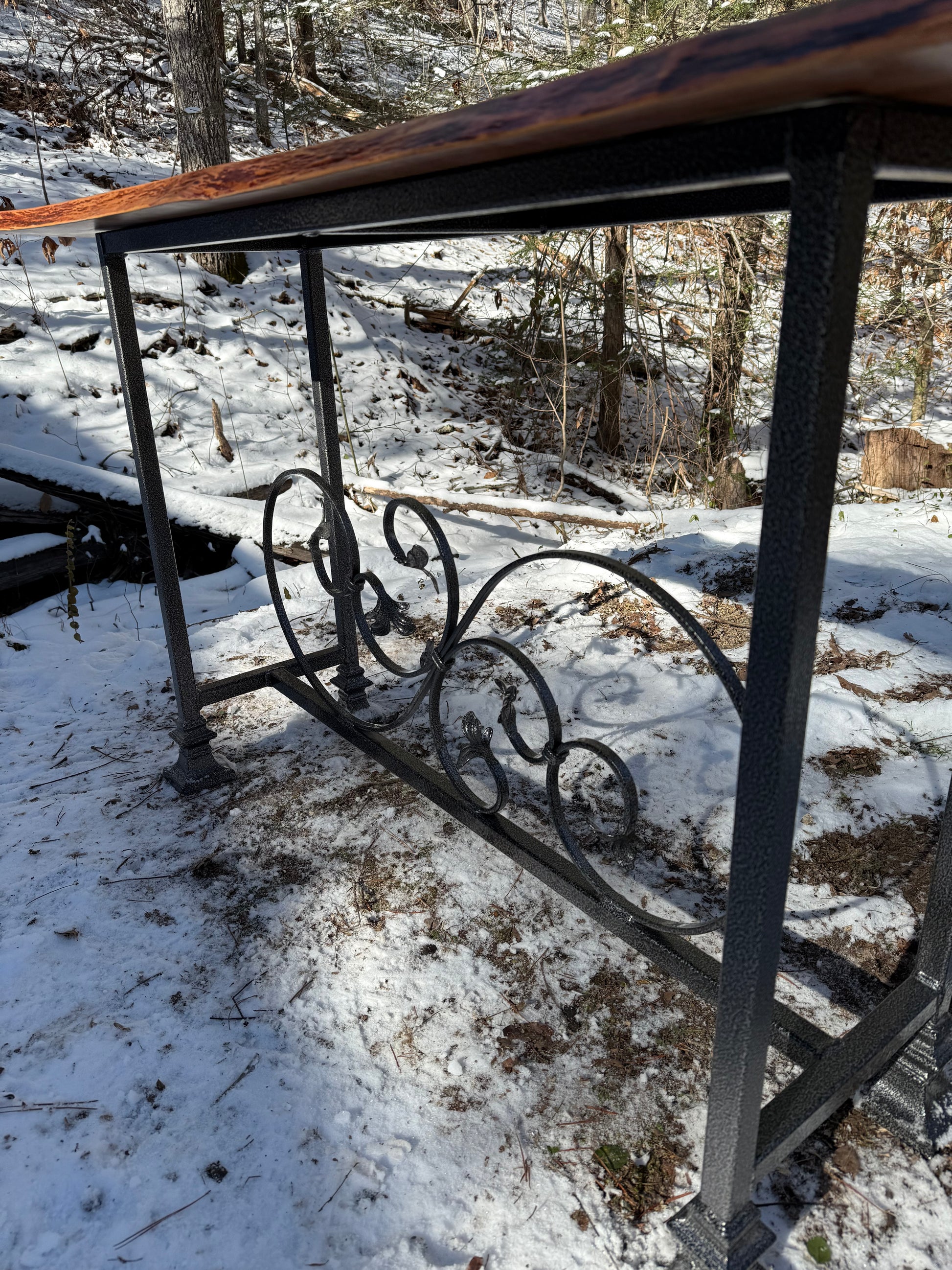 Console Table- Fractal Burn Patagonian Rosewood with Live edge and metal powder coated frame with scrollwork