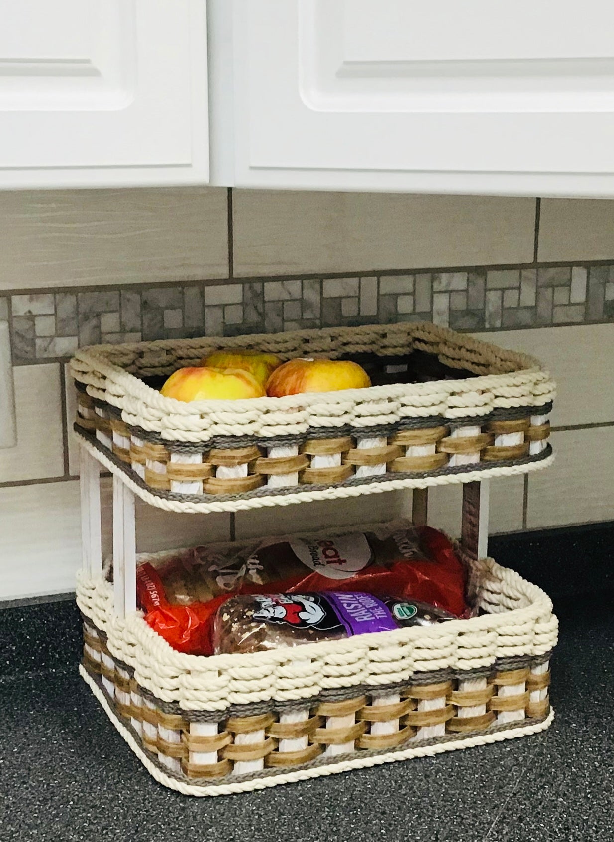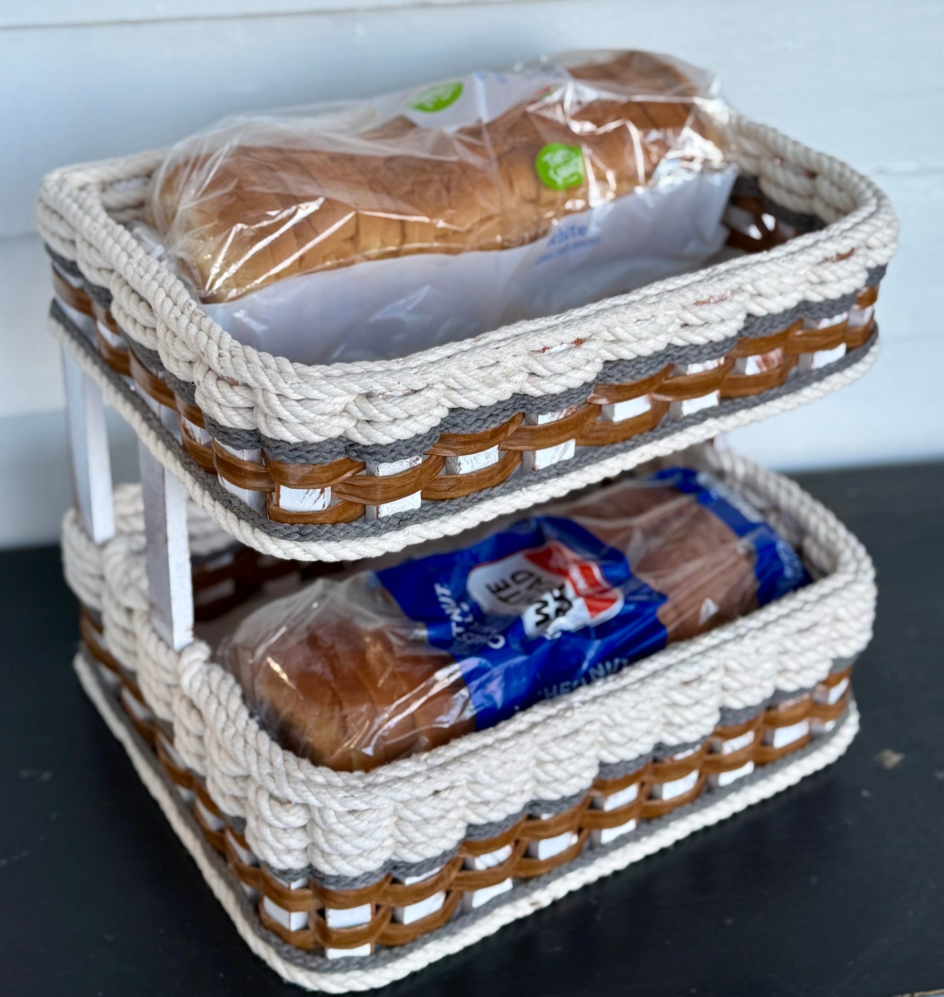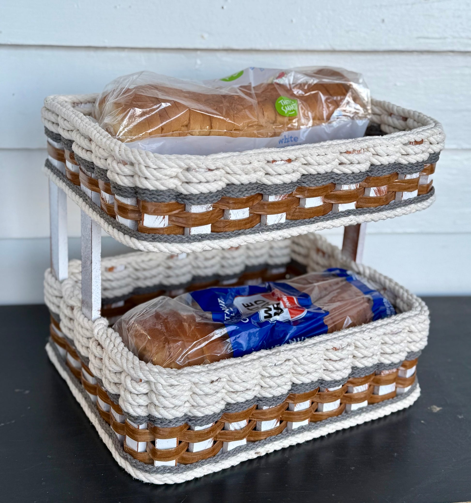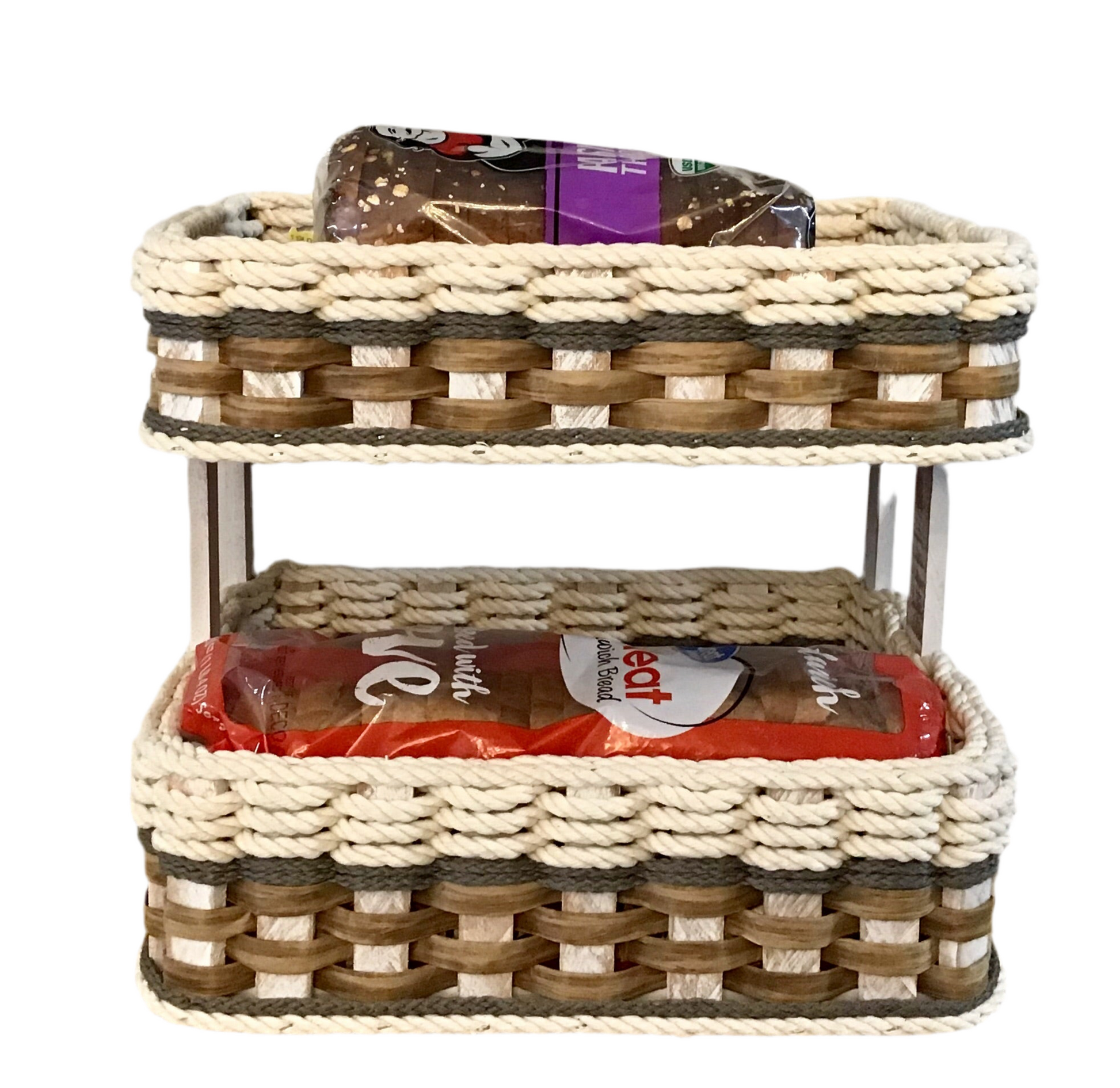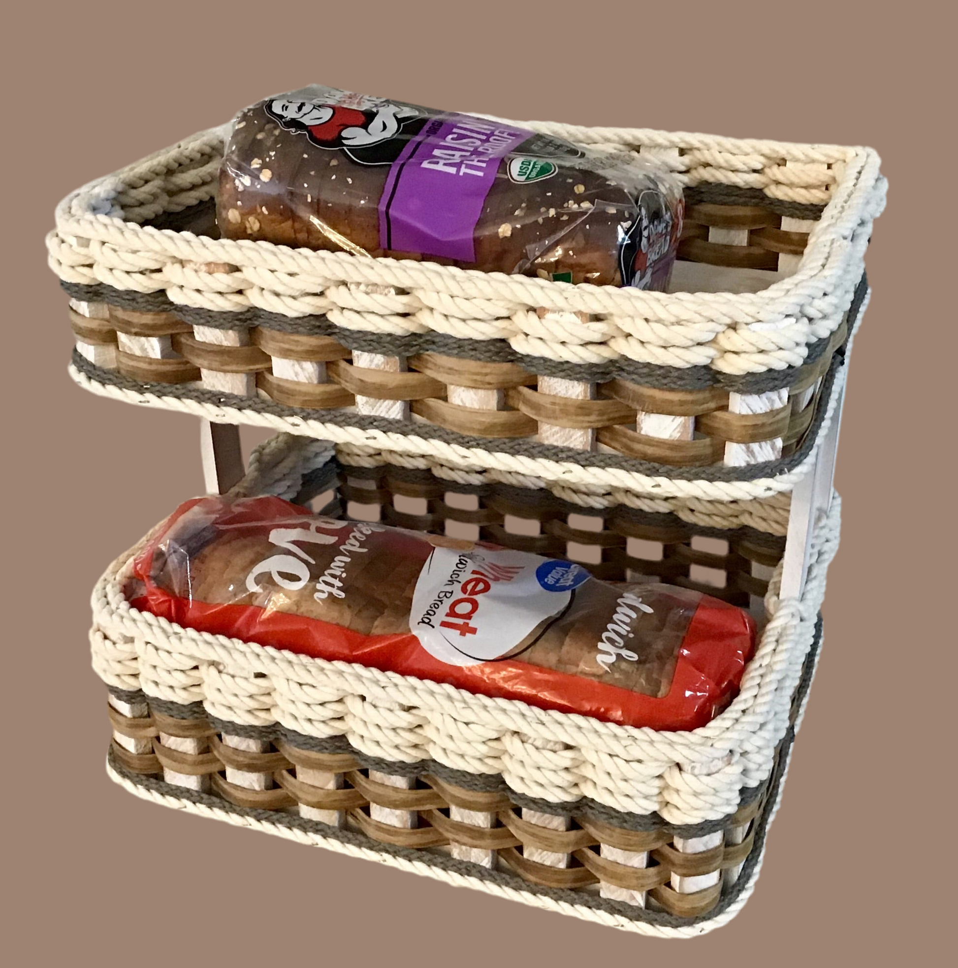 Our Double Bread basket will hold two loaves of bread on either the top or bottom basket. It is a great organizer for your kitchen since it can hold bread, bakery items, snacks, fruit and veggies, coffee products, and so much more. All with easy access and not having to hold a lid and dig around like the old conventional bread boxes. And the Cottage Grey has become our best selling style. It looks great in farmhouse kitchens.