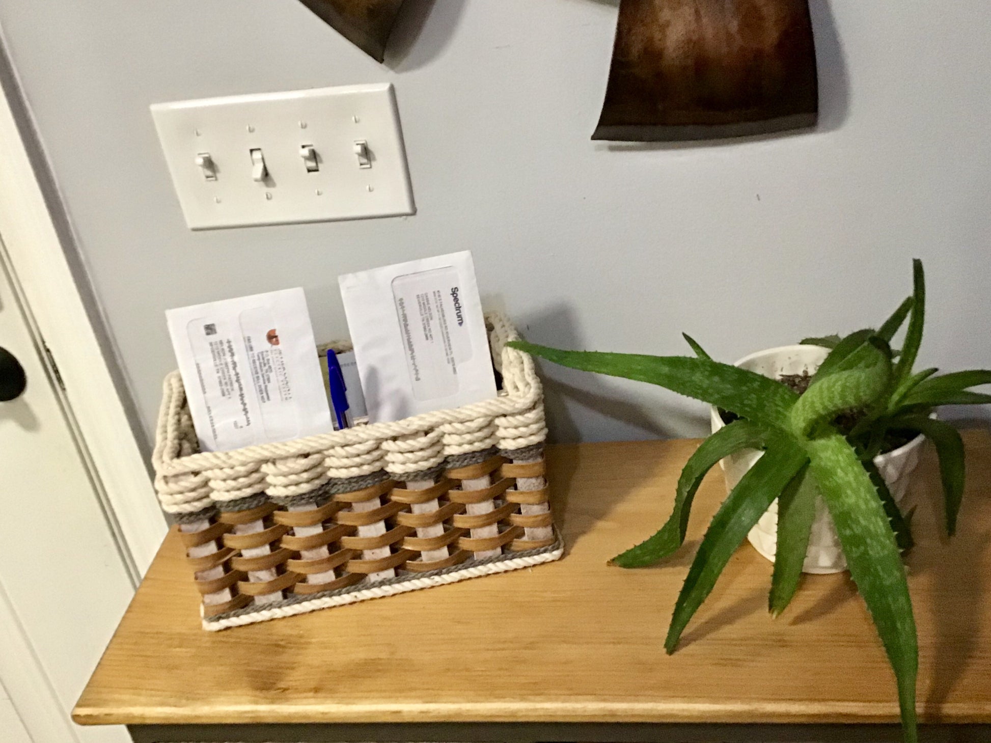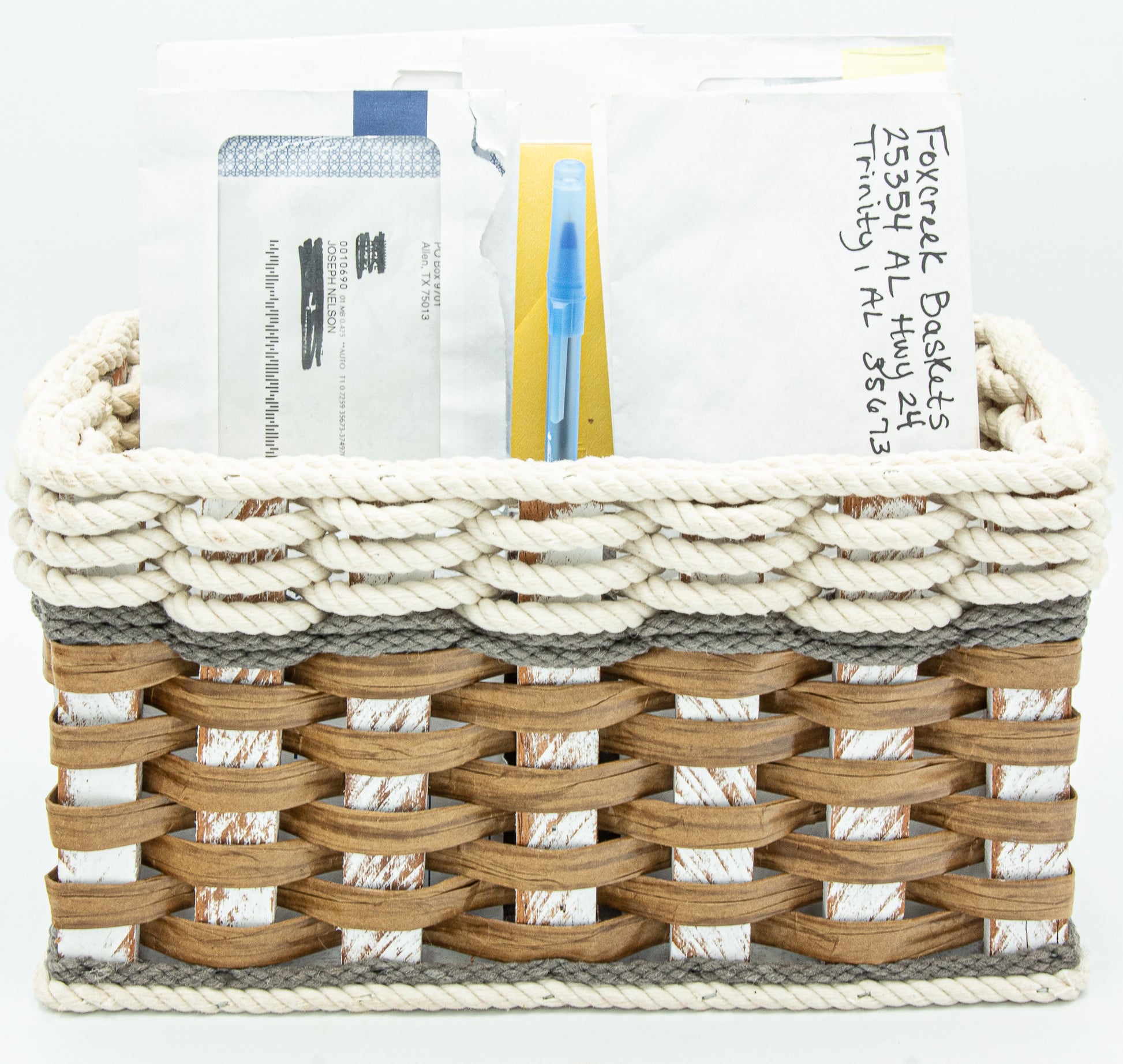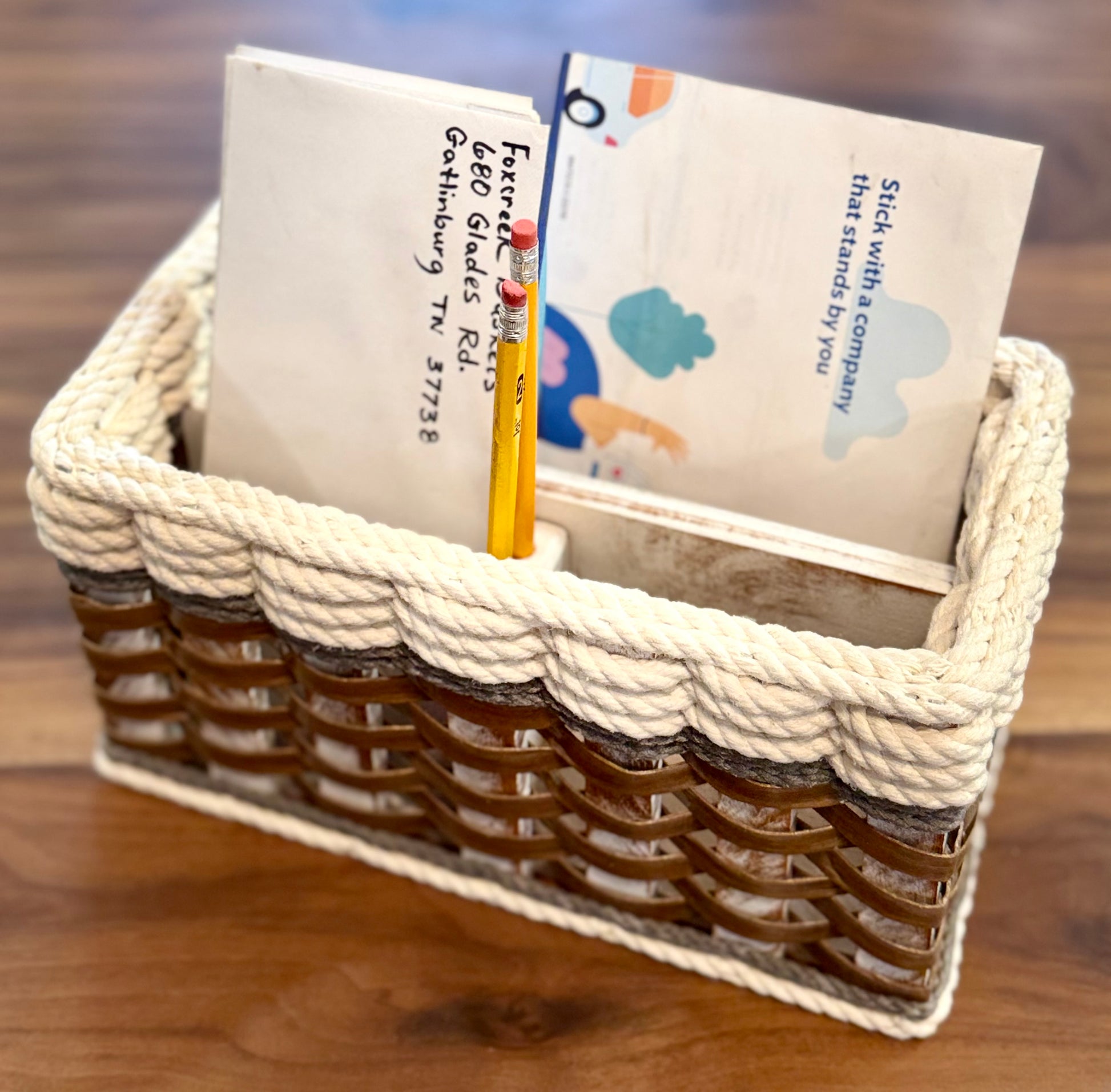 We designed it to receive incoming mail in the large, back compartment, and the two front compartments are for outgoing and bills to be paid. It even has two pen or pencil holders for your pens.