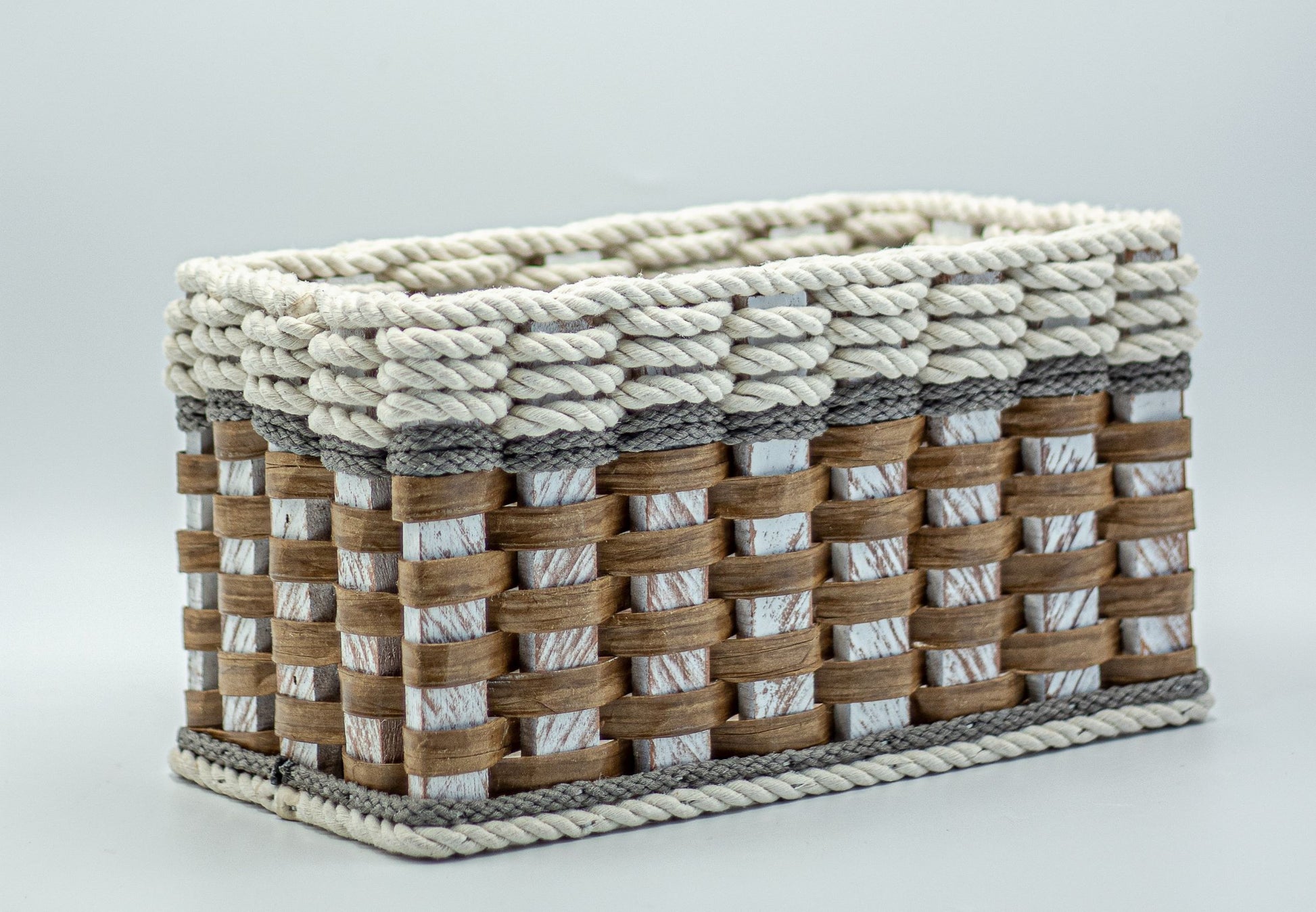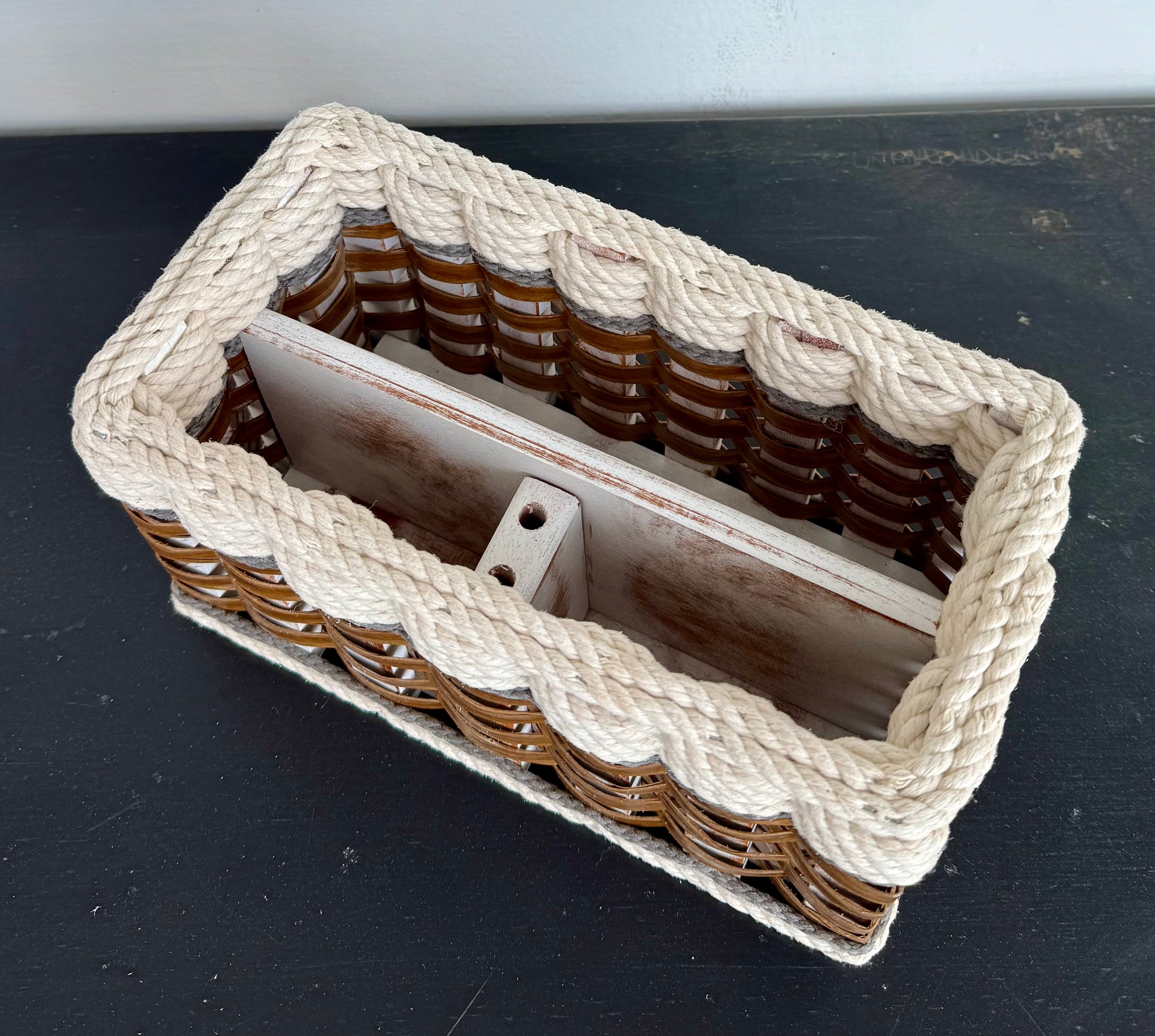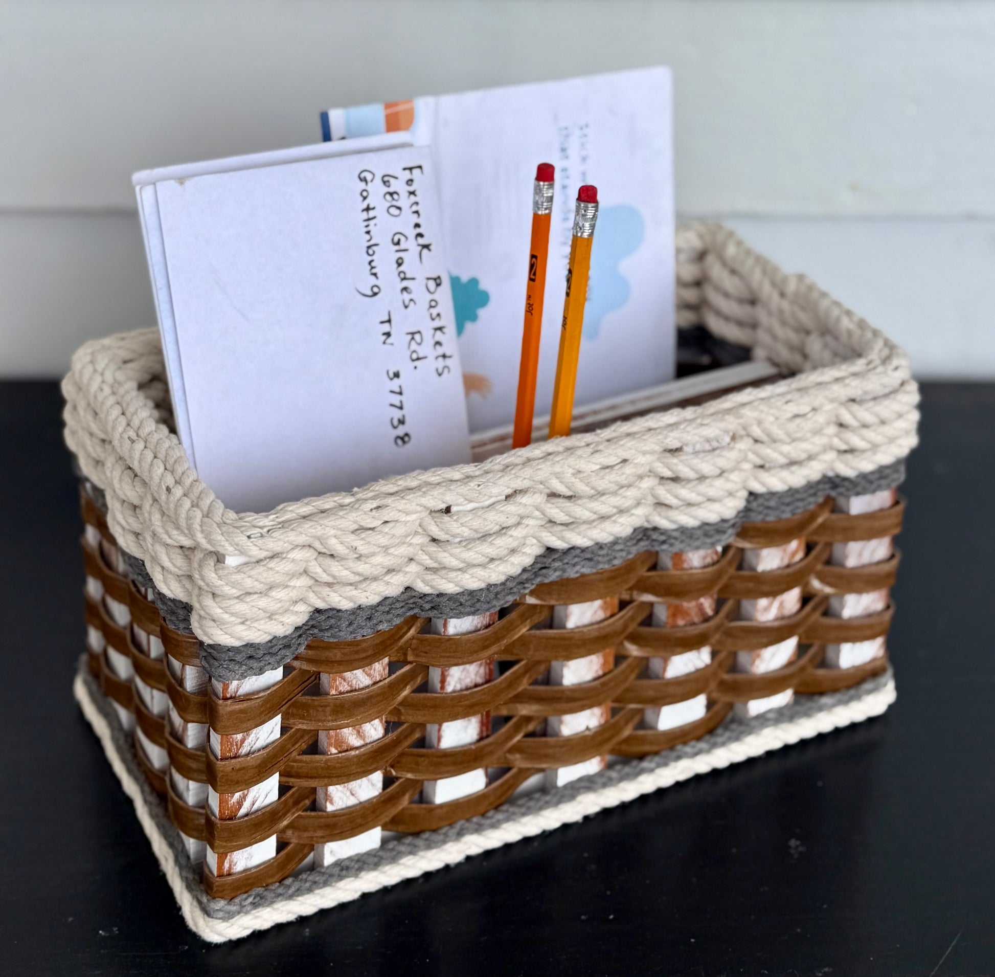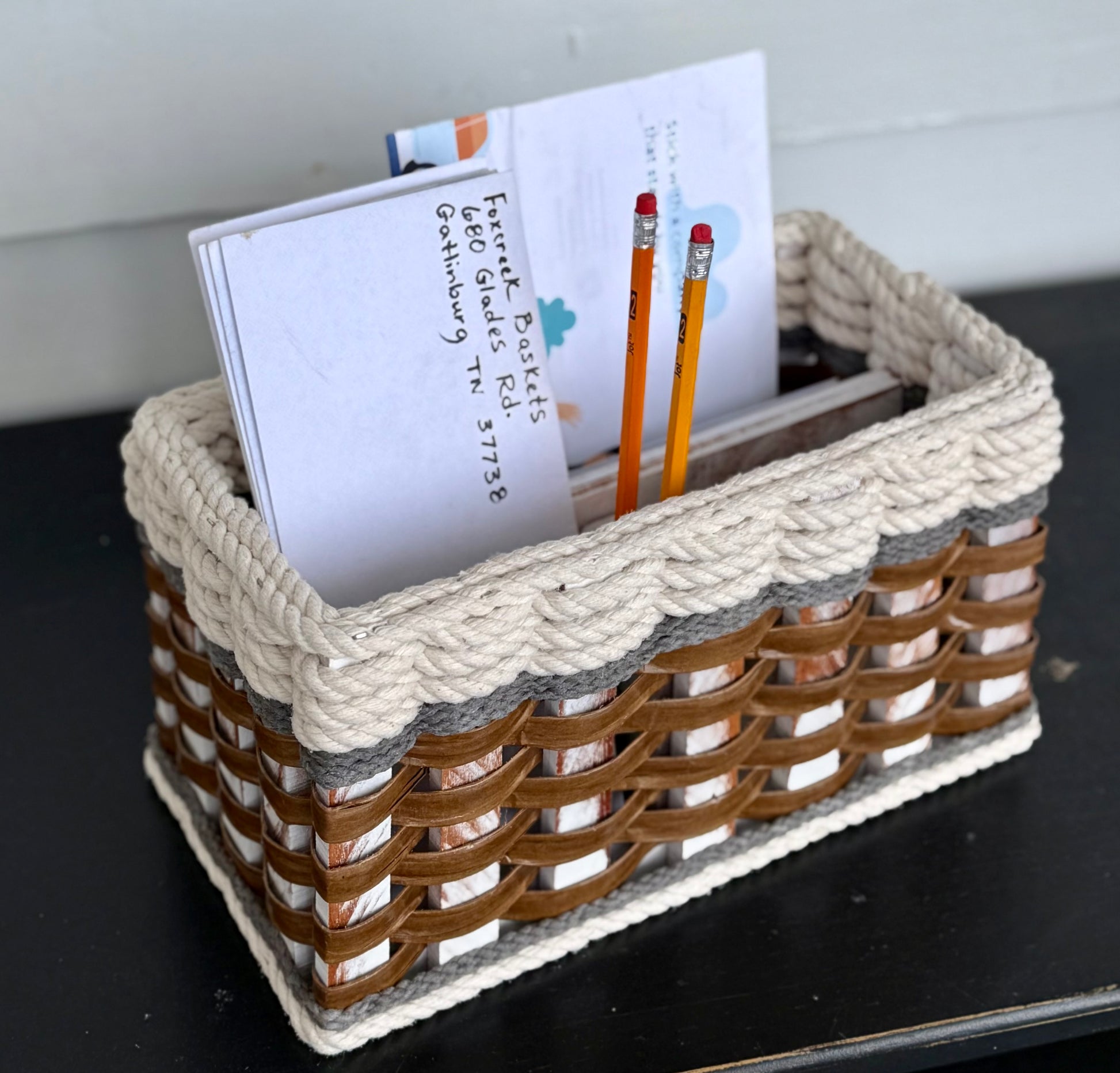 We designed it to receive incoming mail in the large, back compartment, and the two front compartments are for outgoing and bills to be paid. It even has two pen or pencil holders for your pens.
