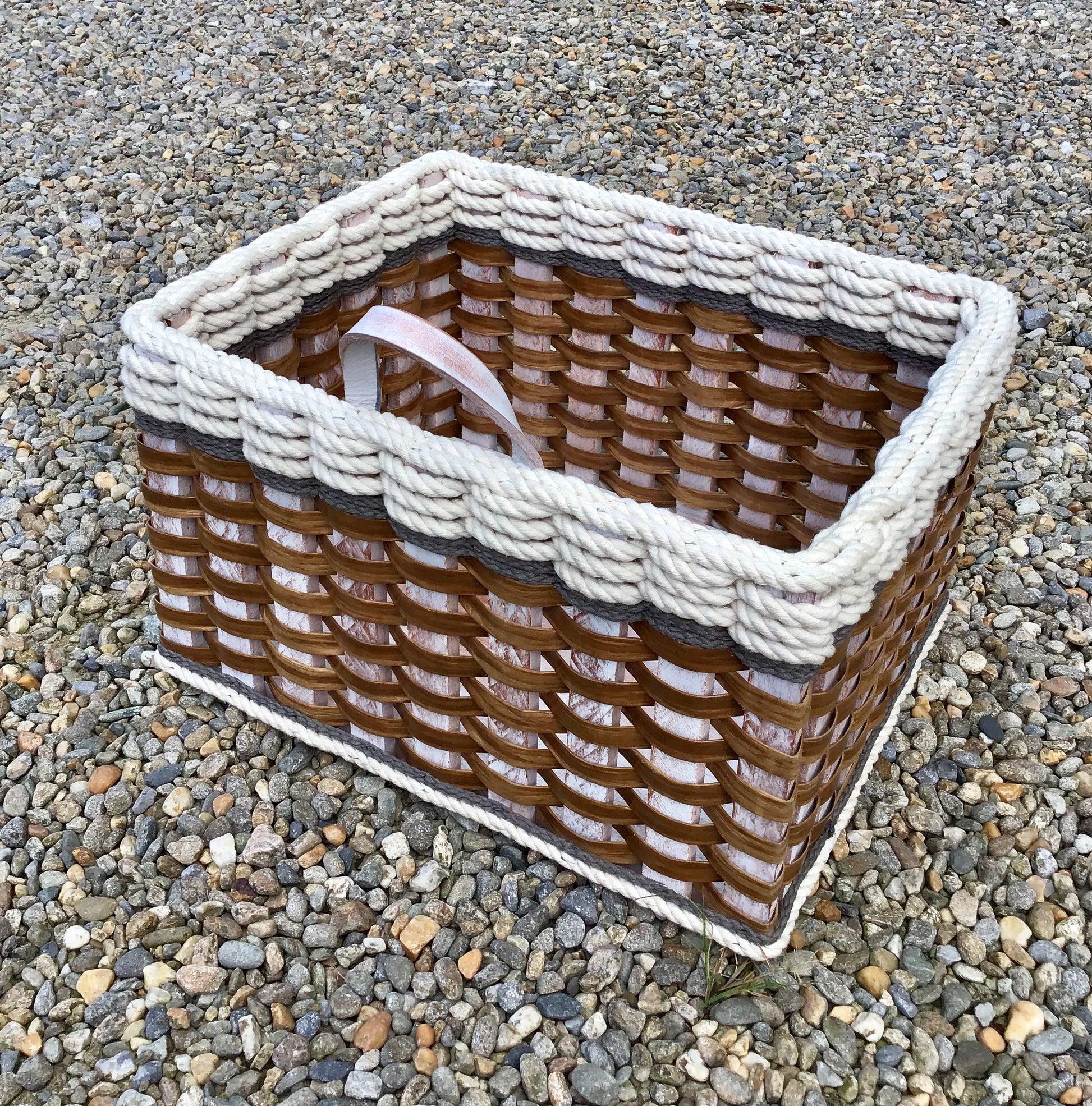 Most Cubbies in furniture will fit our Cubby Basket. The size of this basket is 14 x 11.5 x 8 inches tall. We can make custom sizes. Just give us a call. The Cottage Grey series has a cotton braided cord on top with a grey bonnie cord. And we distressed the mahogany white.