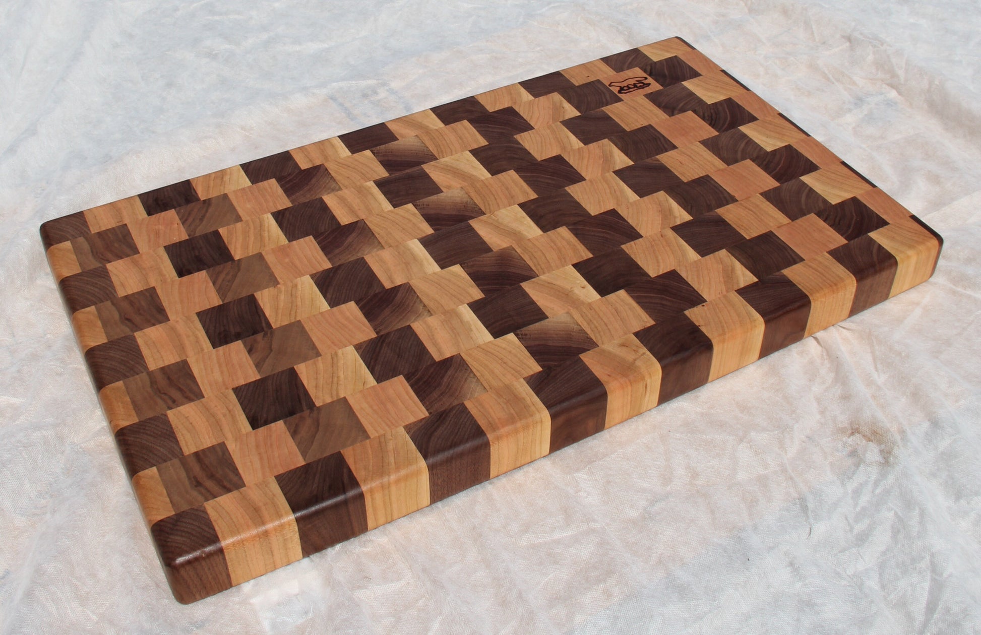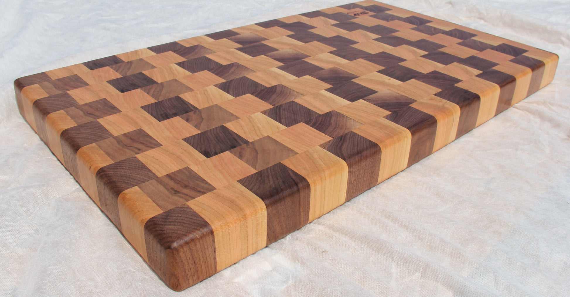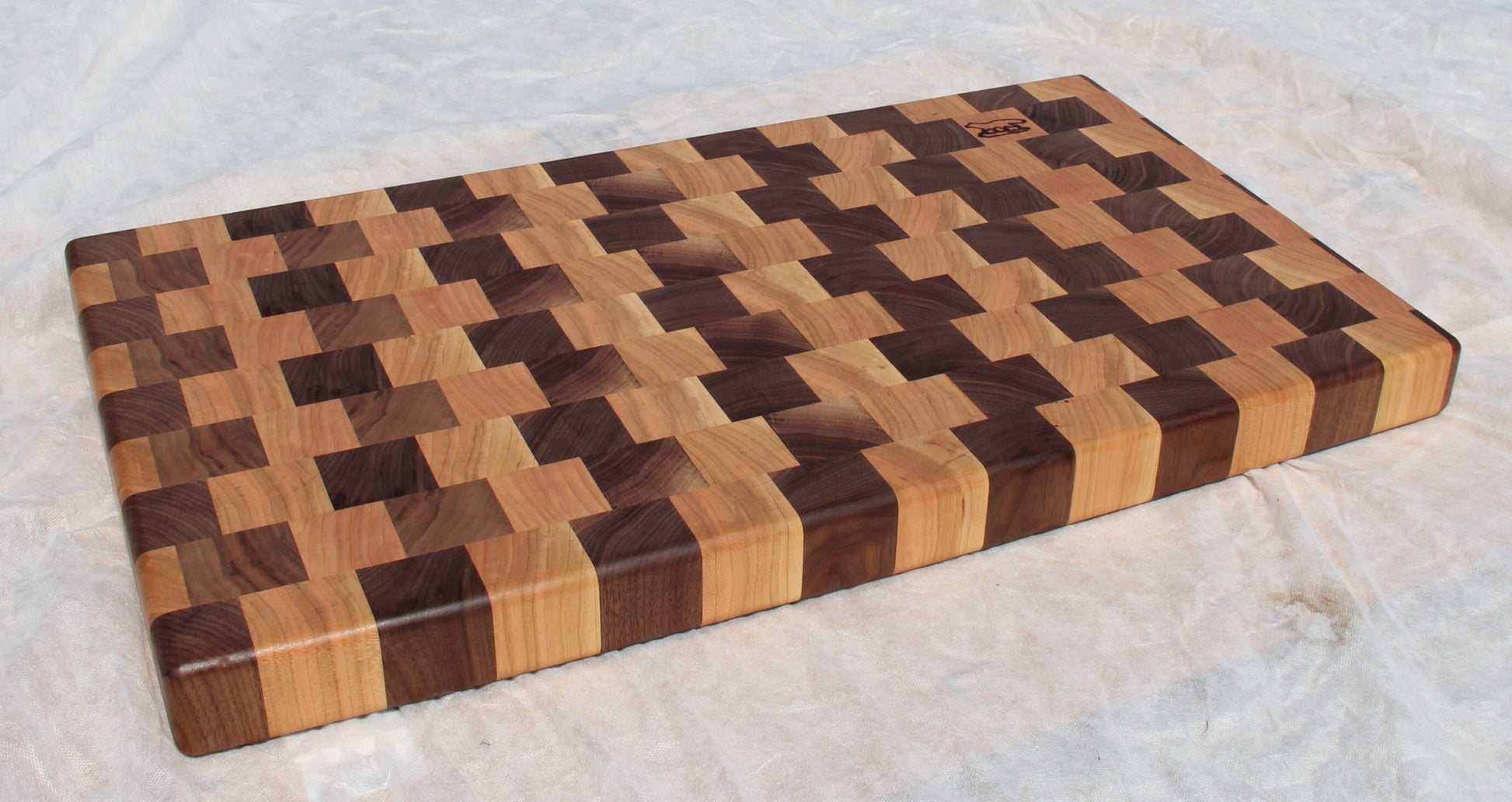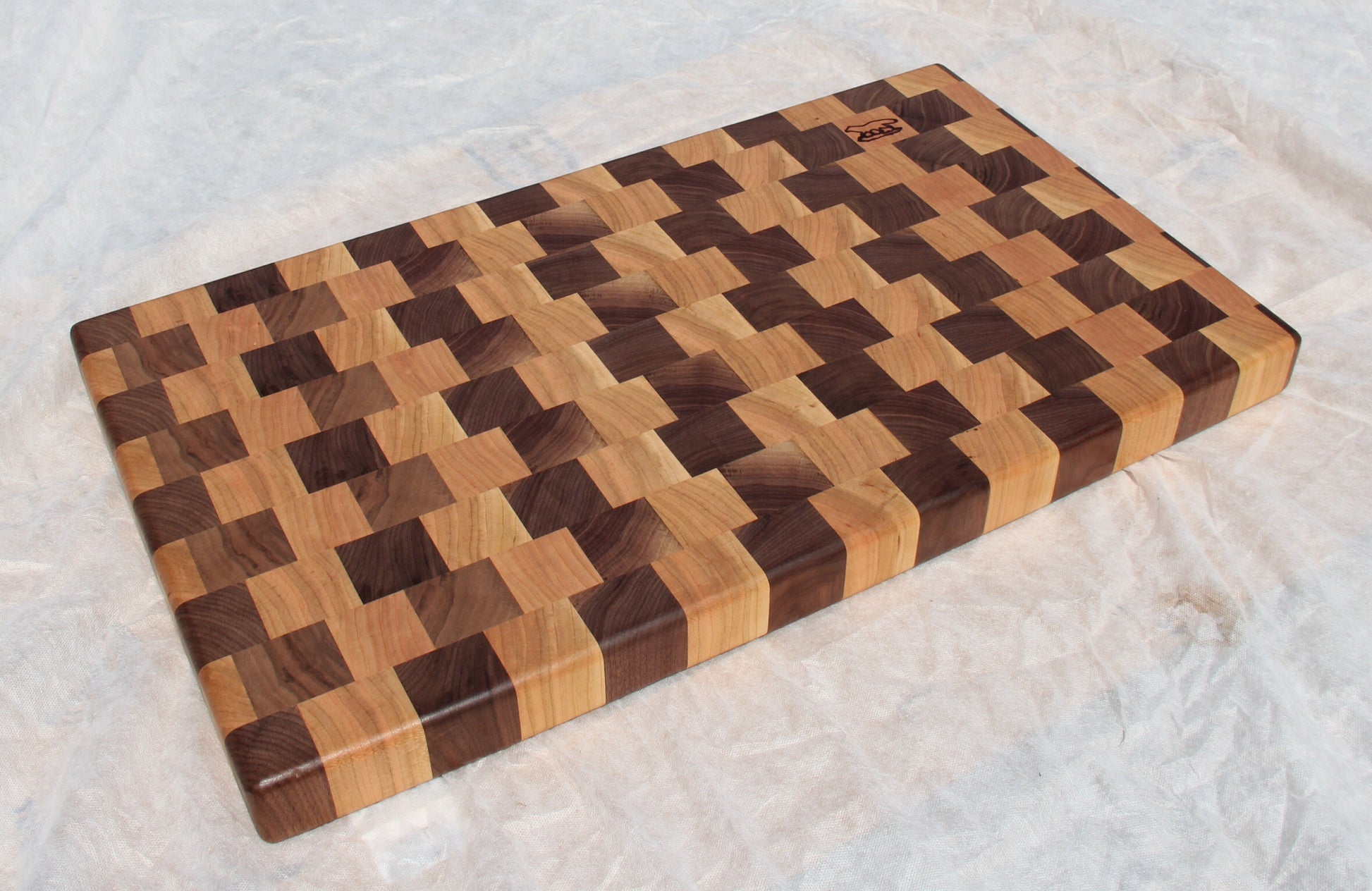 The beautiful colors of the brown and red with the black walnut and cherry sure make a statement with this board. And if you like feeling a smooth cutting board, this one is so smooth because of the black walnut and cherry end grain combo. With a end grain board it scars less when you cut on it due to the hardness of the wood. Just choose a size for you! This board is 1 3/8 inches thick.