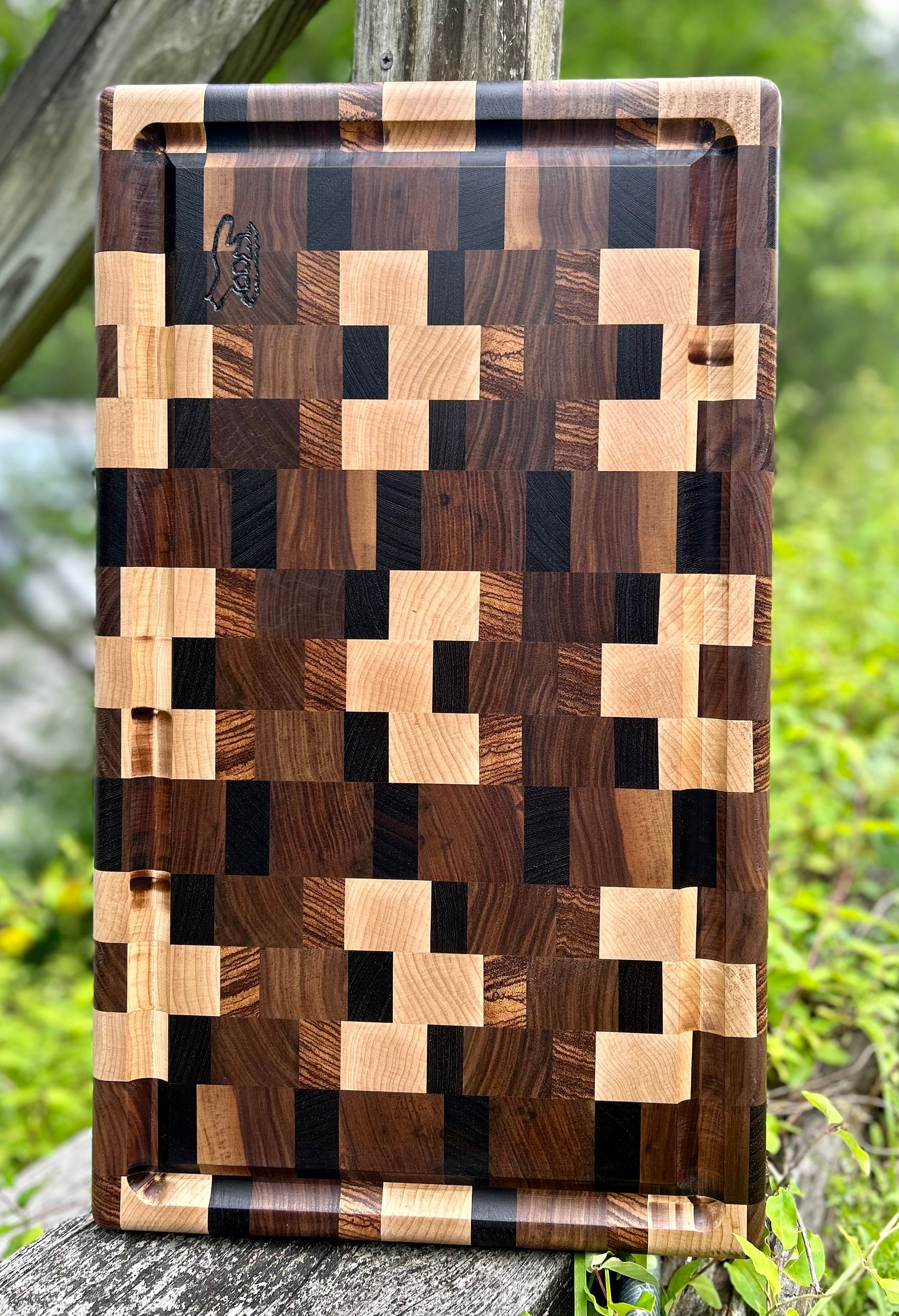 Cutting Board- Dark Exotic Woods End Grain with Walnut, Zebra, Wenge, and Maple Woods with Blood Trail
