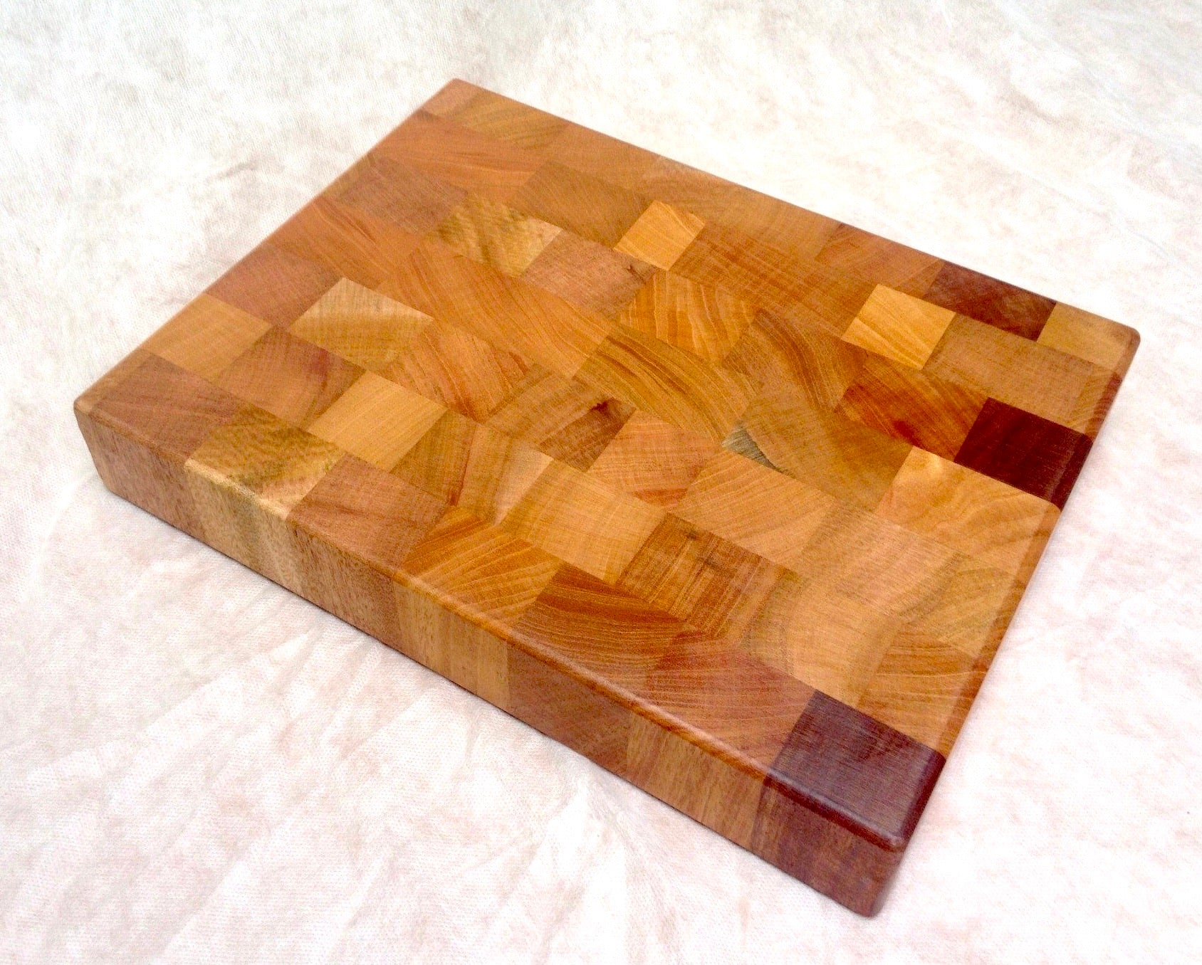This is our thicker end grain cutting board. It is a 2 inch thick mahogany end grain cutting board. End grain is a lot harder than top grain, so this makes a better cutting board. Even after cutting on this board for say 5 years you would just have scratches and no deep gauges. This beautiful end grain mahogany cutting board does not have a blood route. It is smooth on both sides so if you want to you can cut on both sides or put those rubber feet on it so it will not slide around while cutting and only cut on one side. Mahogany ages beautifully too! The more you oil it the darker it will become. Comes with care instructions. Just choose your size. If you would like a blood route on this thicker board please contact us. Otherwise look at our thinner mahogany end grain boards online with blood routes as a option. Keep in mind we do not stock the thicker boards and they do take min 4-6 weeks for us to make and ship these.