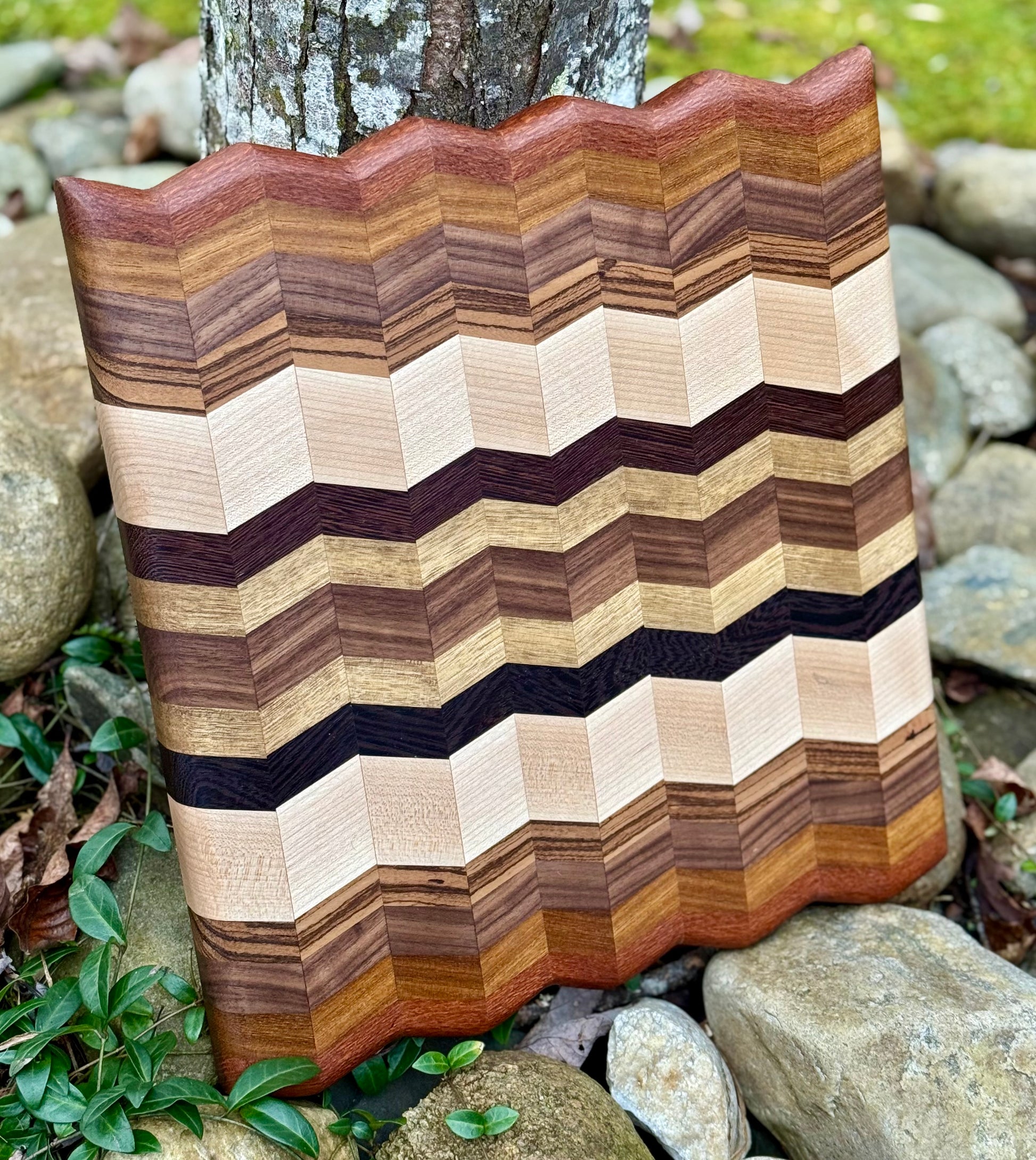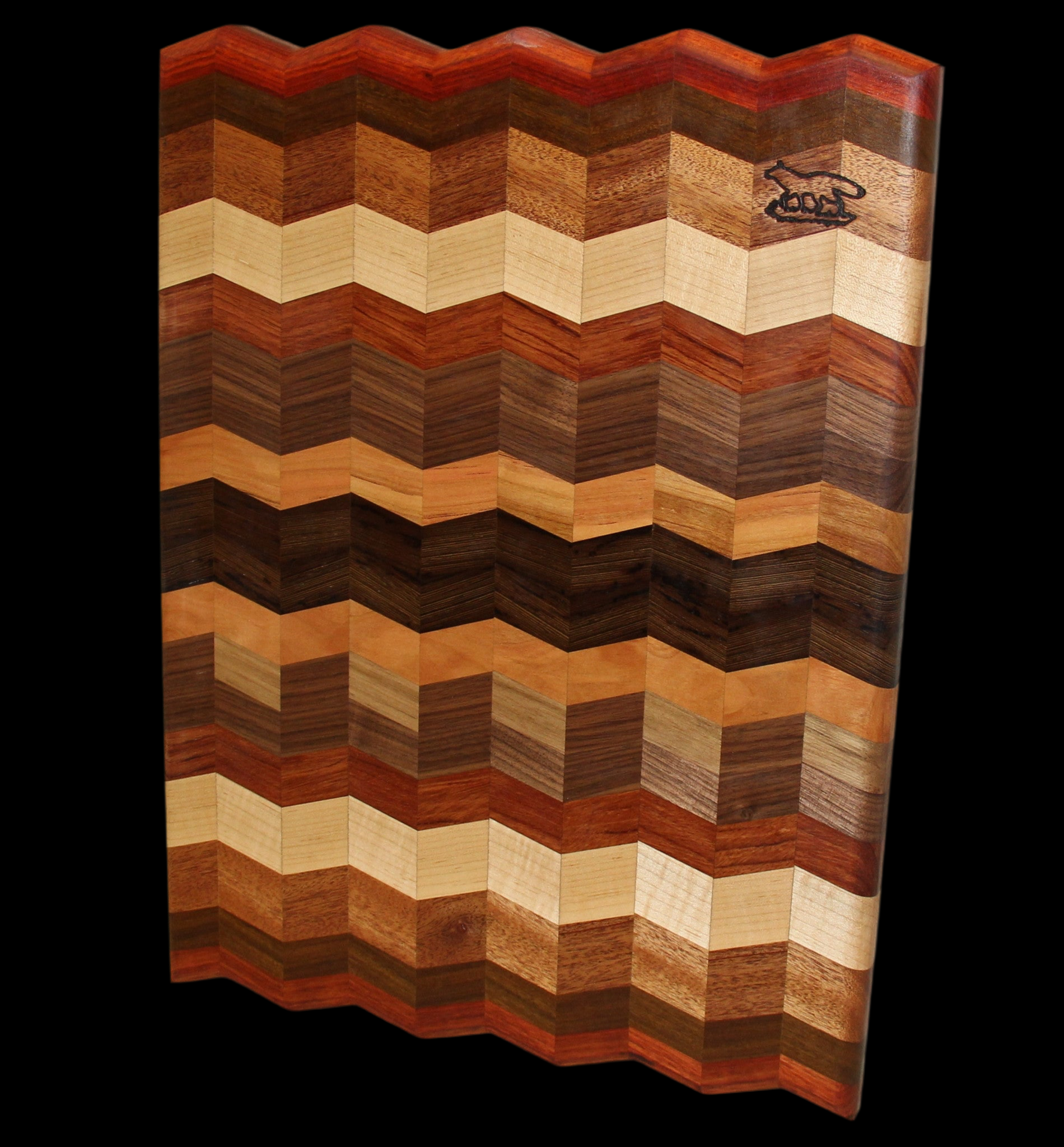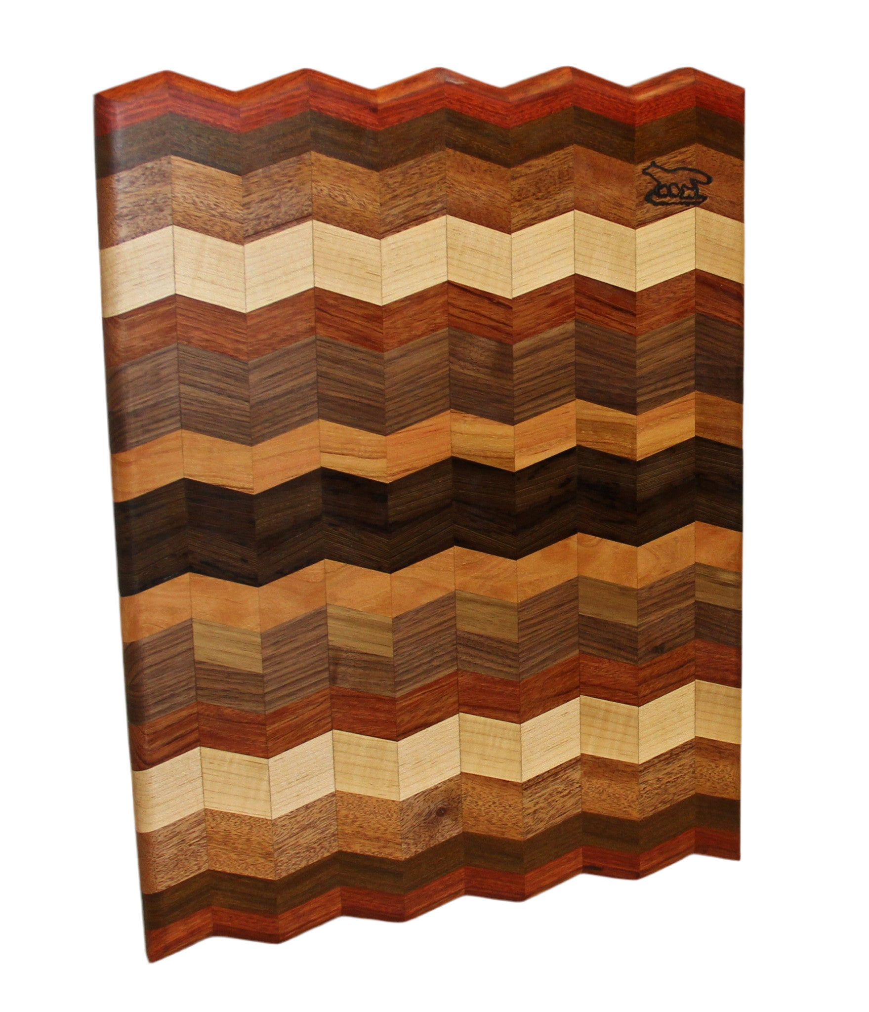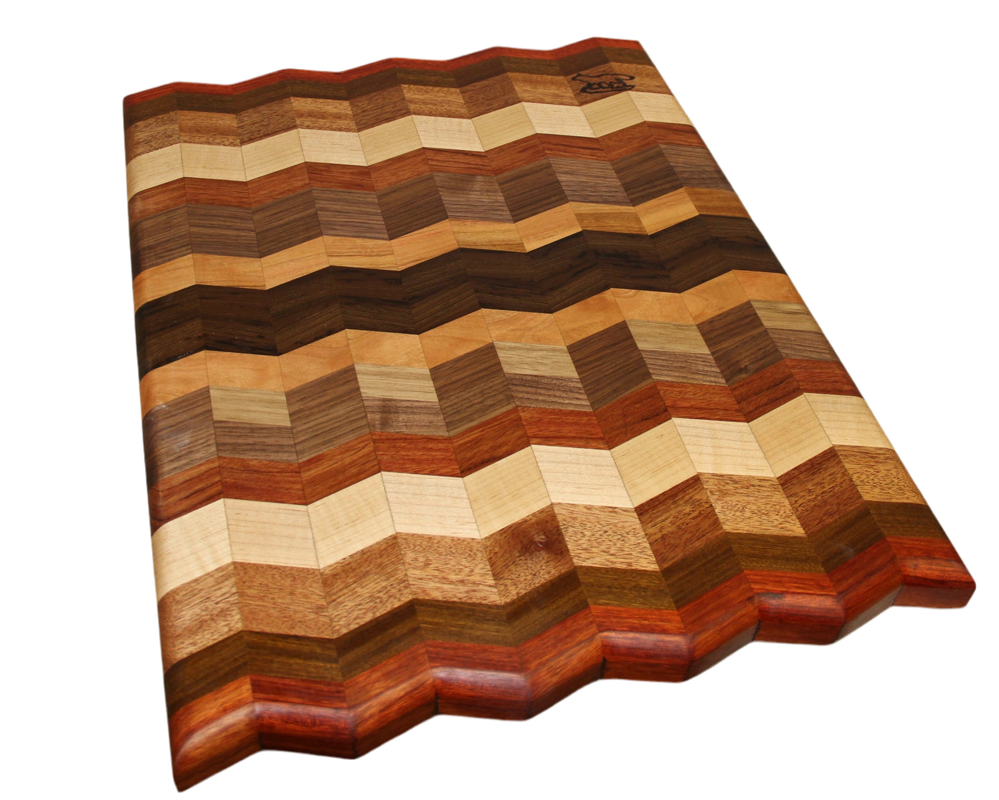 This 3-D chevron cutting board is a great for entertaining or simply for art on your wall! Cut on the back and leave the front pretty. It will make a beautiful statement in your kitchen and is a great conversation piece. Woods may vary on finished product. You will receive 6 to 7 different woods in this board. They contain some exotic woods such as Wenge, Zebra, Canary wood, Purple heart, Blood wood, Paduak, Bubinga. And other natural hardwoods would include mahogany, black walnut, cherry, maple.