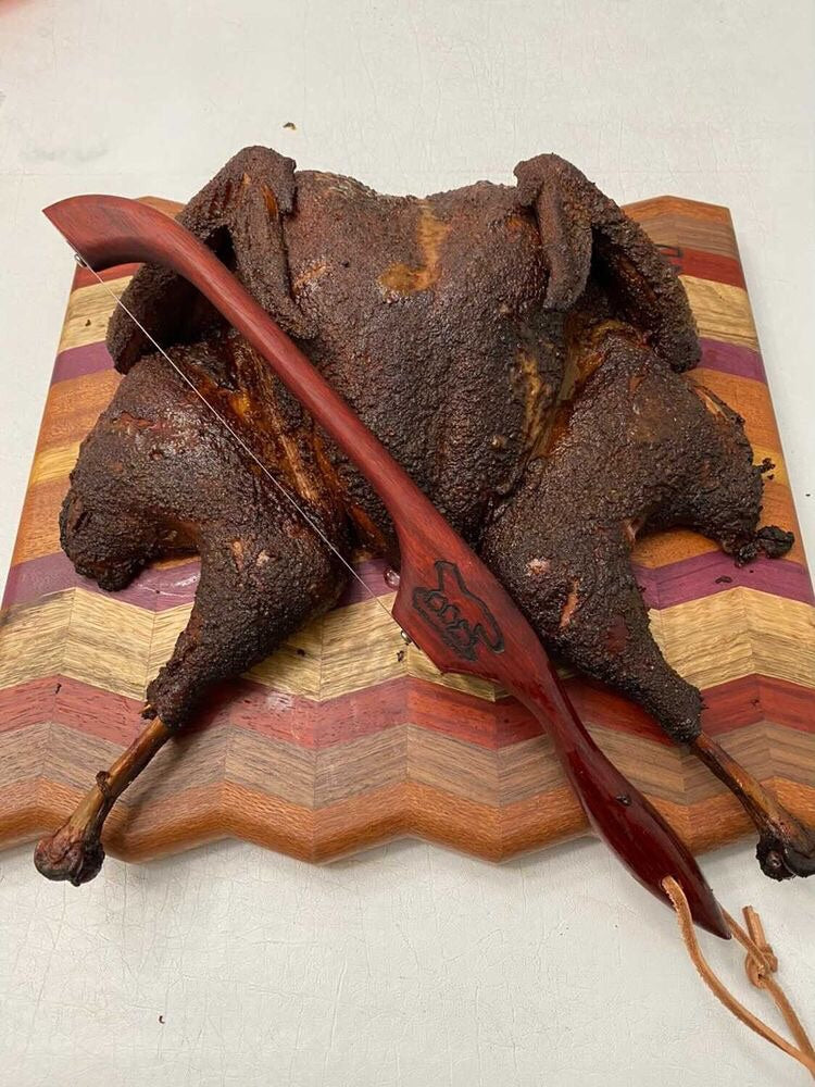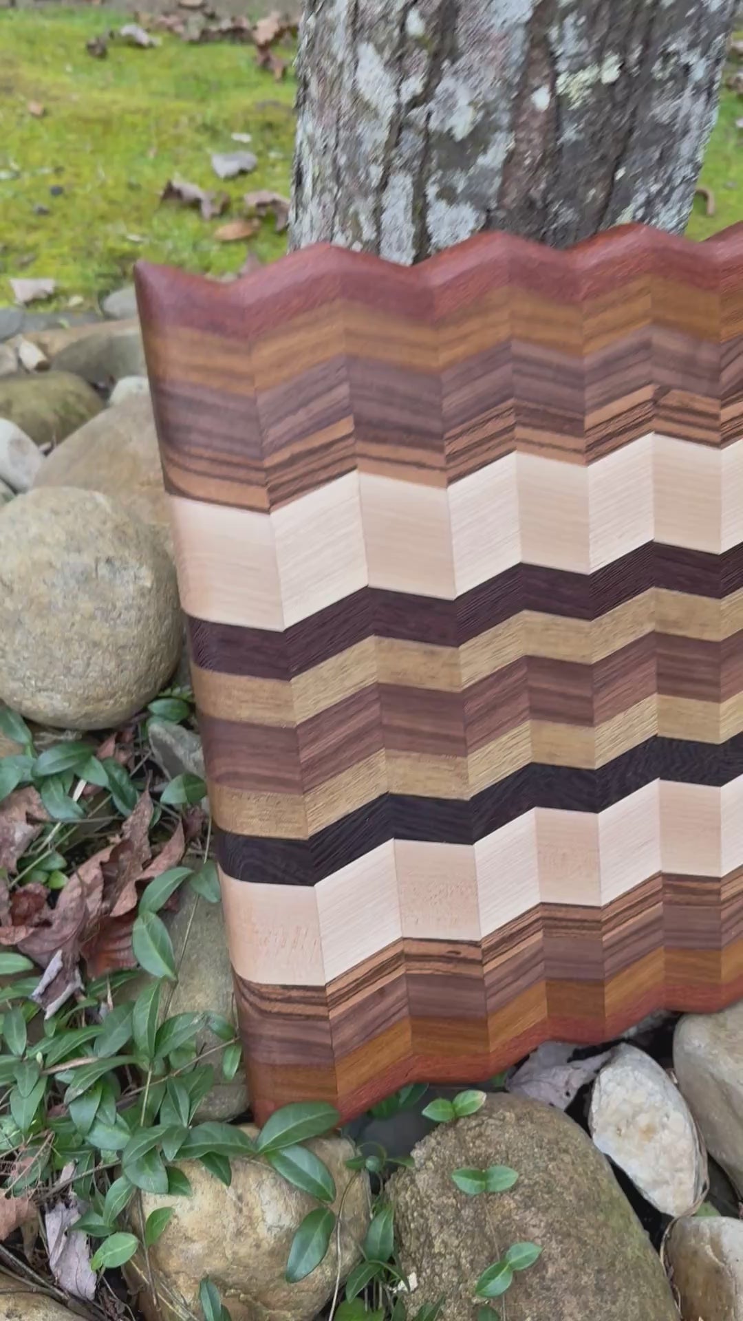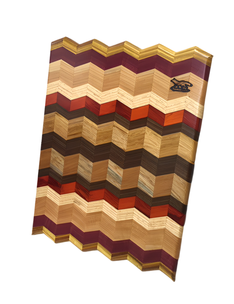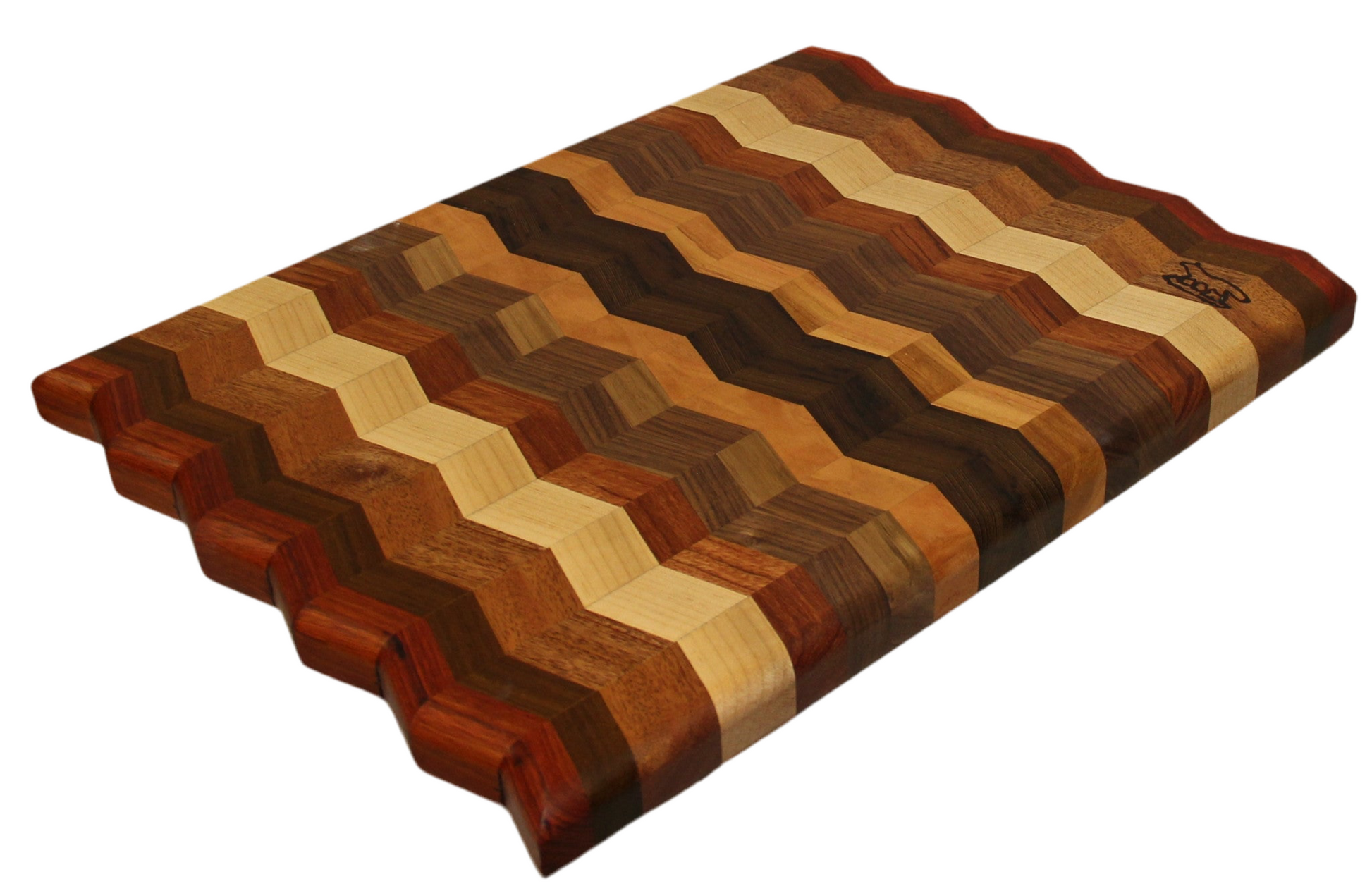 This 3-D chevron cutting board is a great for entertaining or simply for art on your wall! Cut on the back and leave the front pretty. It will make a beautiful statement in your kitchen and is a great conversation piece. Woods may vary on finished product. You will receive 6 to 7 different woods in this board. They contain some exotic woods such as Wenge, Zebra, Canary wood, Purple heart, Blood wood, Paduak, Bubinga. And other natural hardwoods would include mahogany, black walnut, cherry, maple.