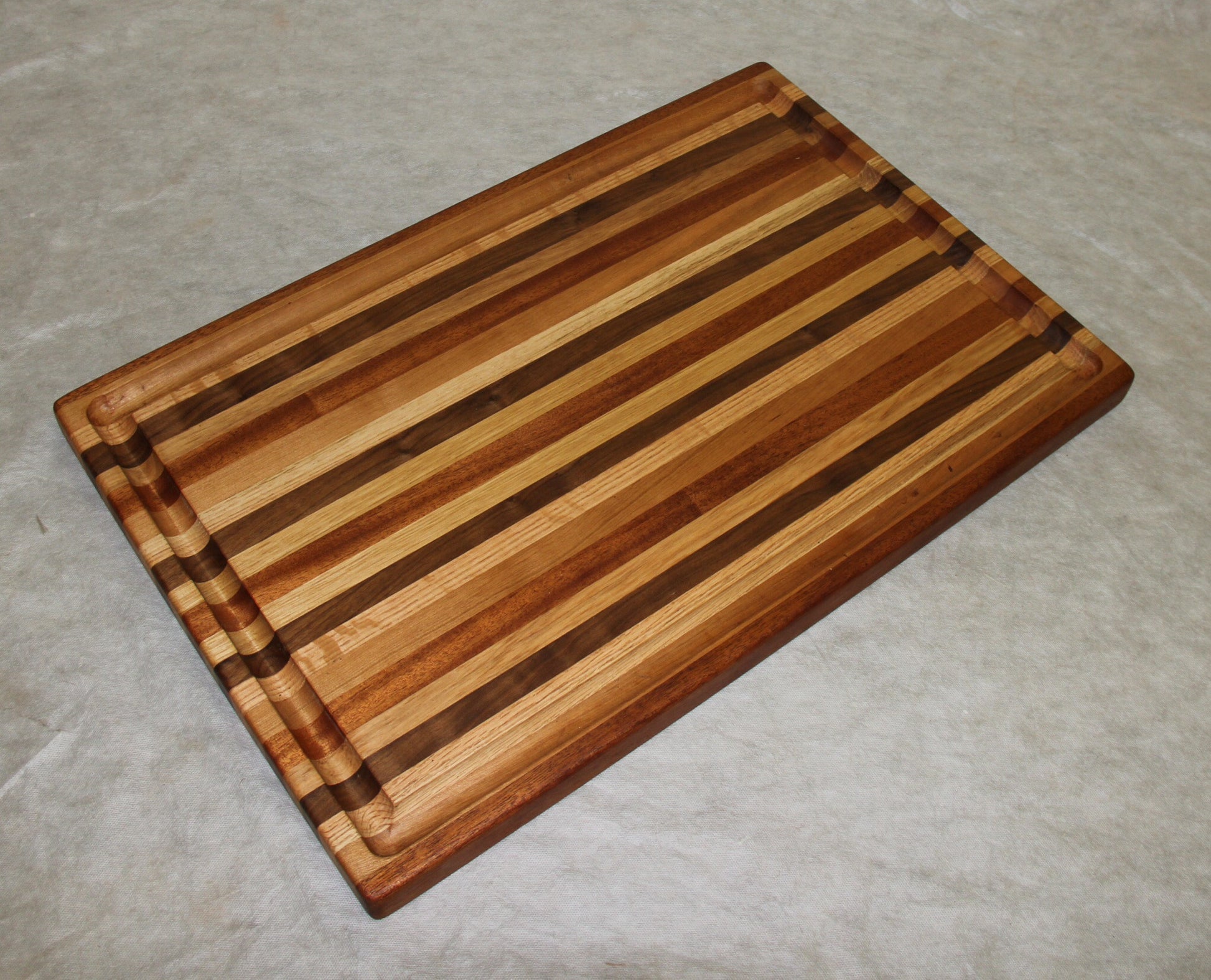This beautiful cutting board has woods of many colors. It has black walnut, mahogany, cherry, maple, and oak. You will love the drip trail to catch all the juices of whatever you are cutting! Be the envy of your friends when you carve your turkey or ham on this lovely board. Just choose the size you need.