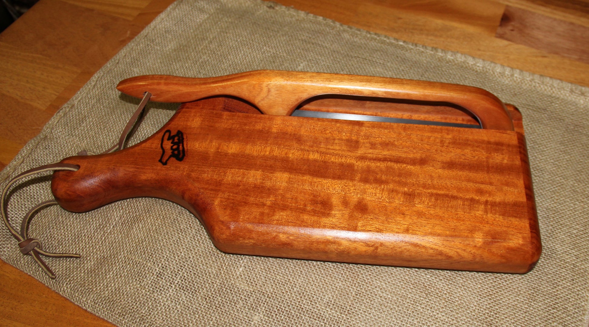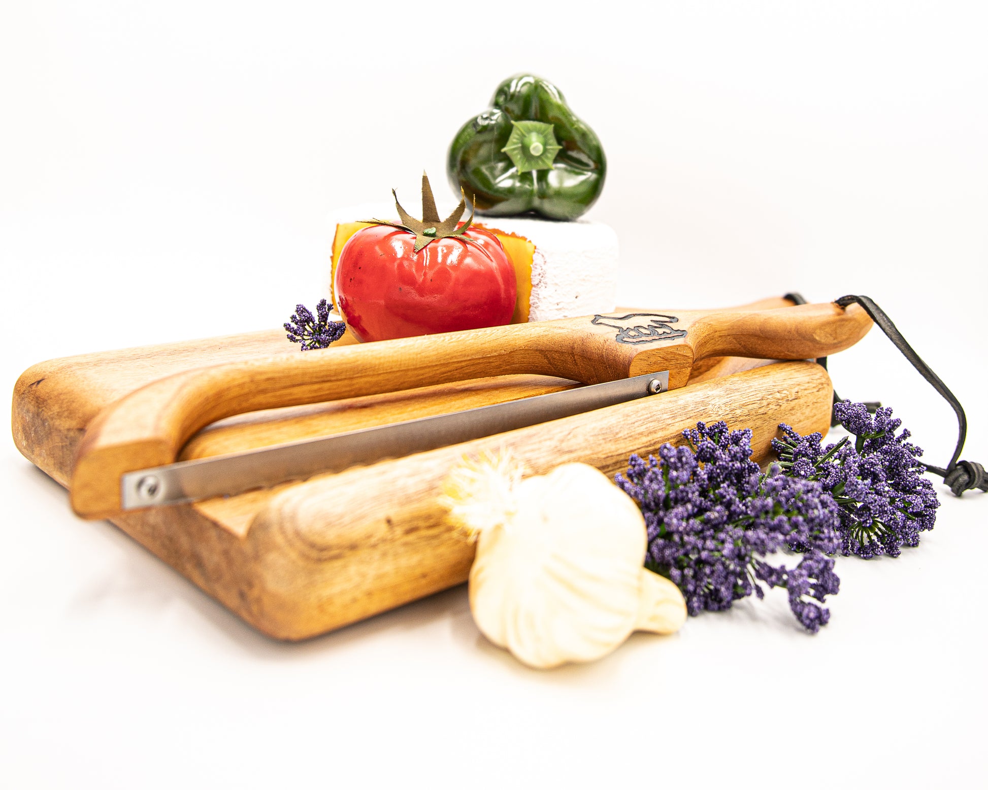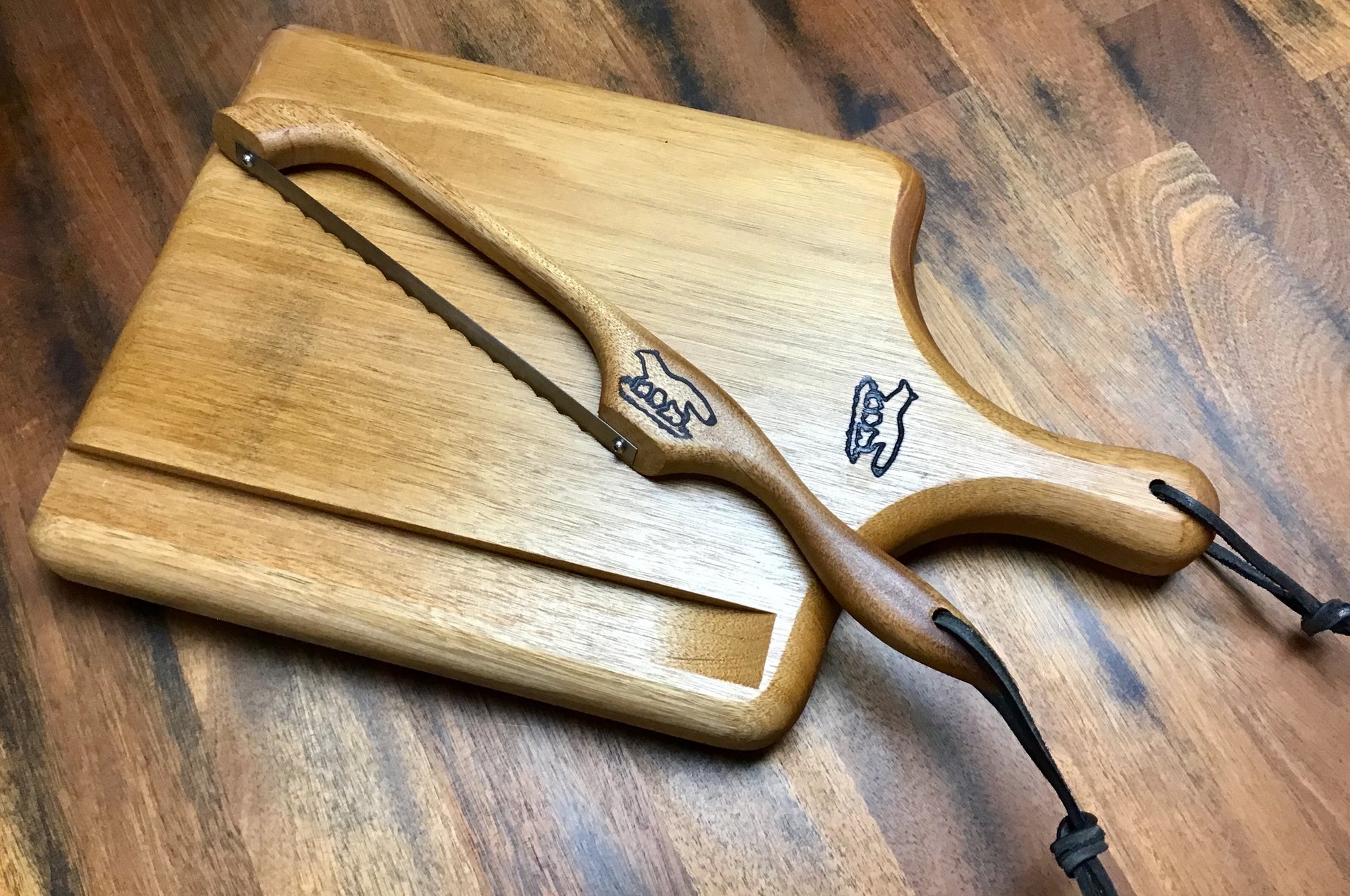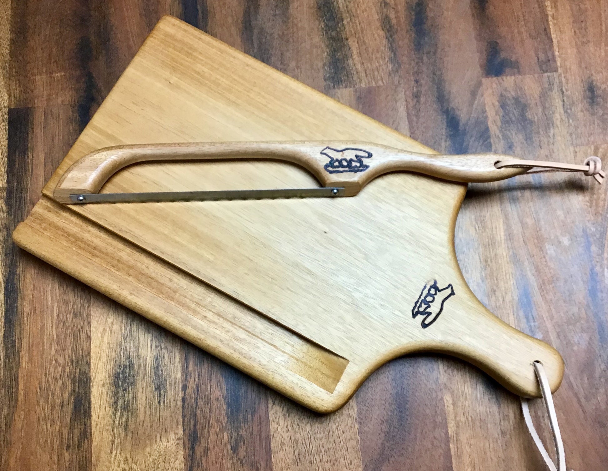 These boards start at $60.00 for a 5" wide and are 1 7/8" thick and 18 3/4" long. The 5" and 6" Boards do not have handles. They have a cut out to hold your Bow Knife for serving. They come in Mahogany or Maple. You can choose the width of your cutting board. These knifes have been made for several years but we simply have the best one on the market, due to the shape of our handles as well as the type of blade we use. They have been designed to feel better, cut cleaner, and last longer. Most importantly our knives designed so that the blade touches the work surface and the wood of the knife never touches. Put our knife in your hand and you will know it is true.