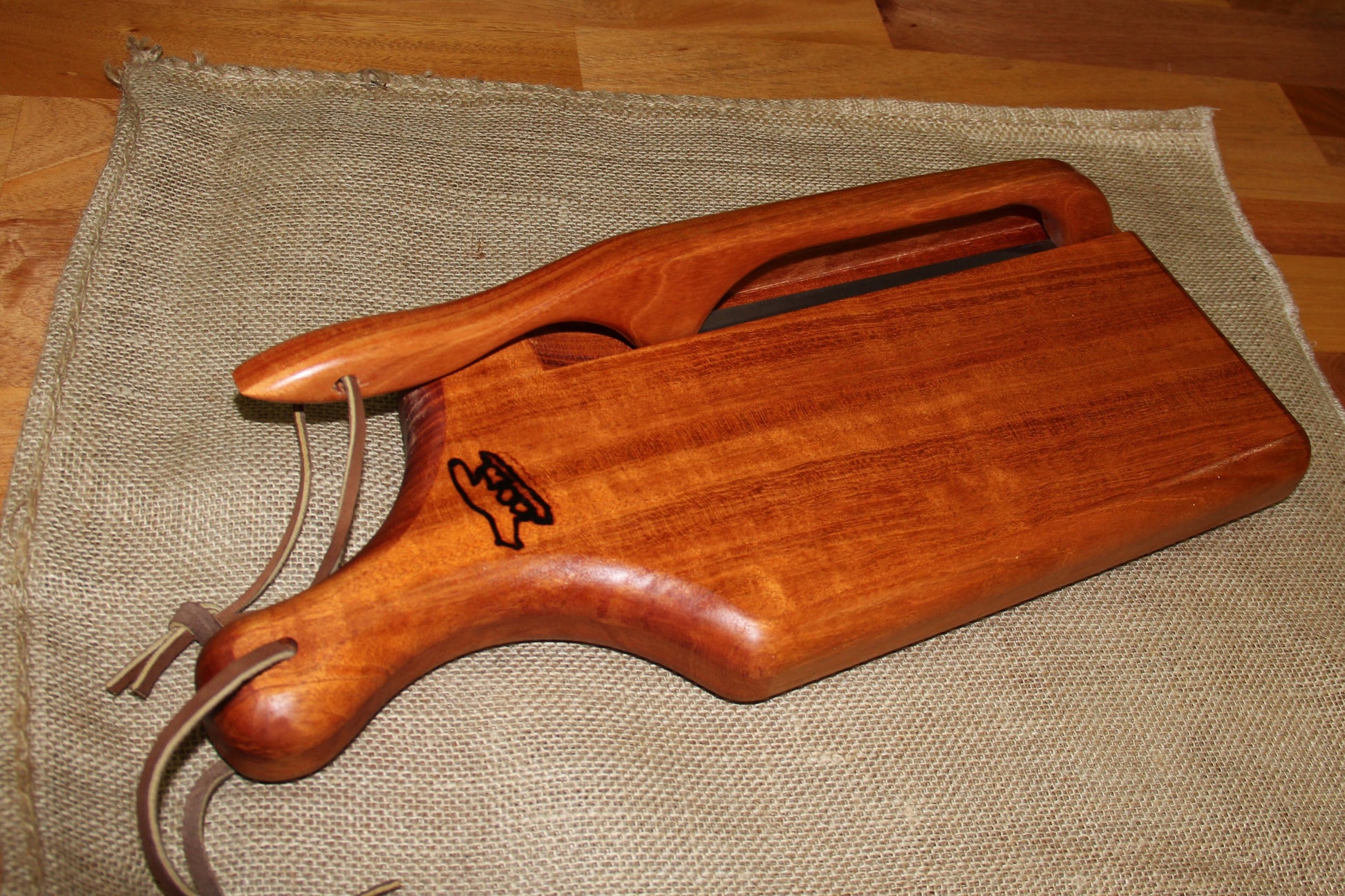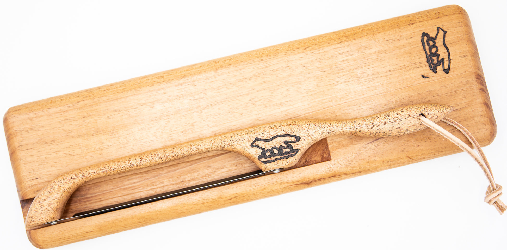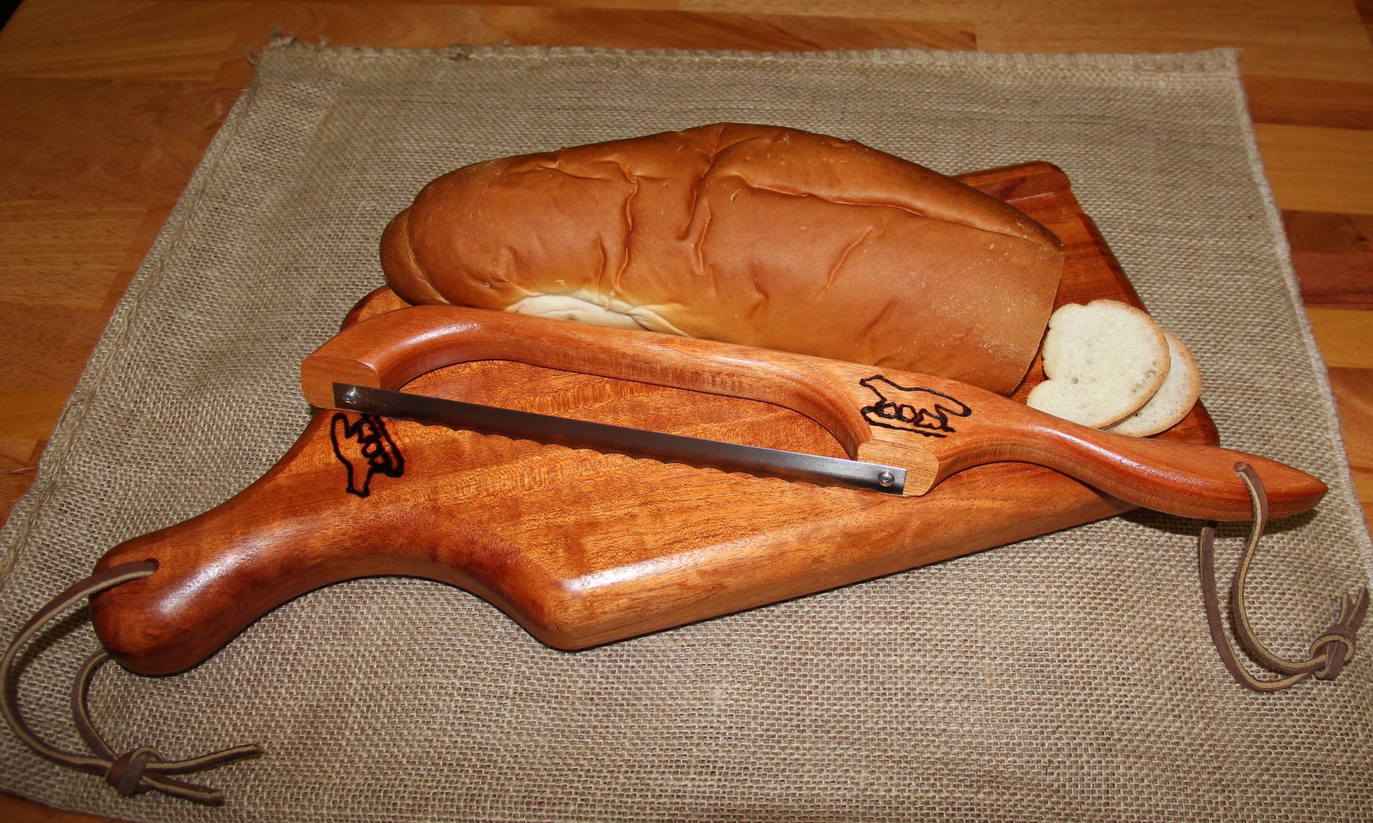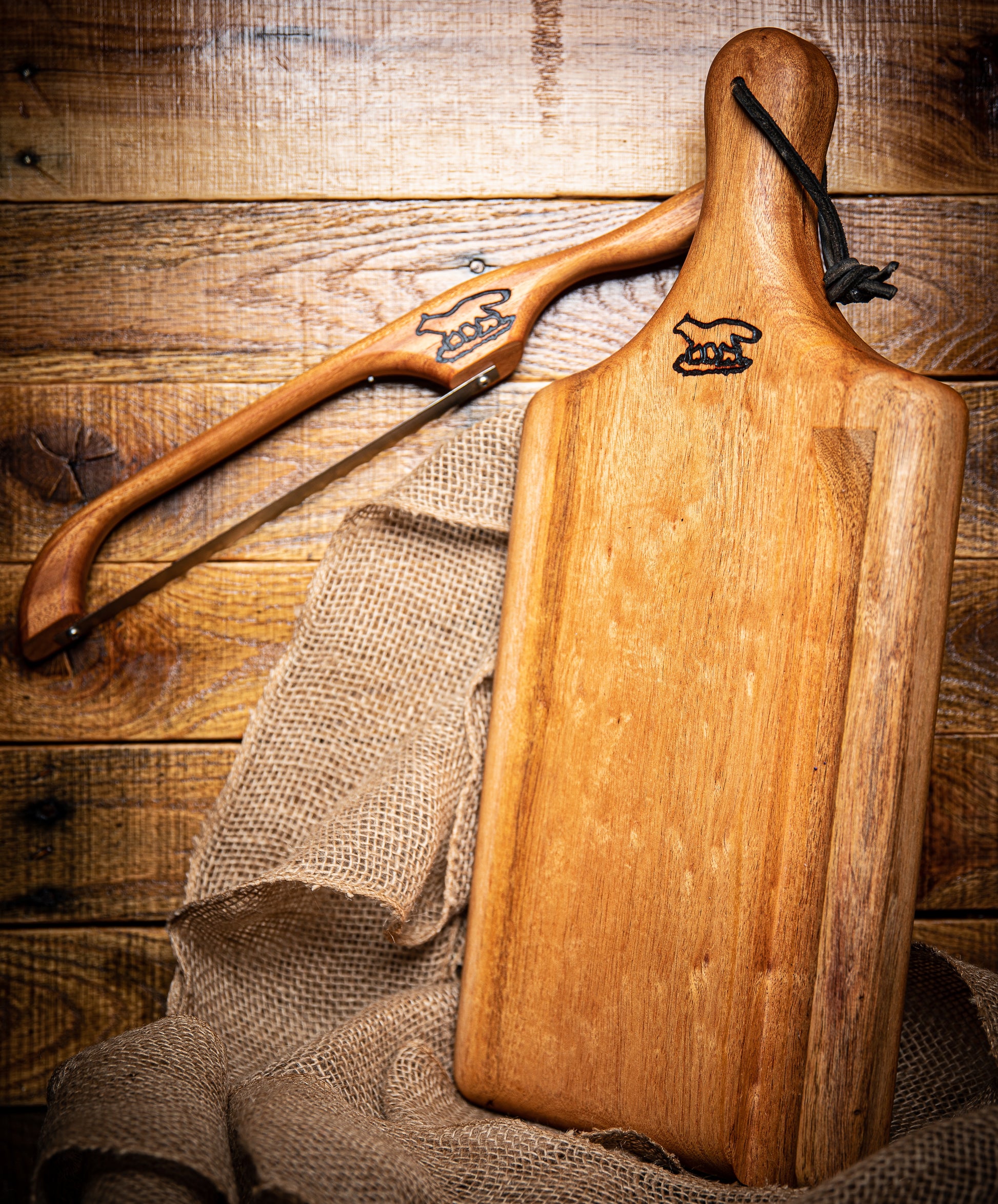 These boards start at $60.00 for a 5" wide and are 1 7/8" thick and 18 3/4" long. The 5" and 6" Boards do not have handles. They have a cut out to hold your Bow Knife for serving. They come in Mahogany or Maple. You can choose the width of your cutting board. These knifes have been made for several years but we simply have the best one on the market, due to the shape of our handles as well as the type of blade we use. They have been designed to feel better, cut cleaner, and last longer. Most importantly our knives designed so that the blade touches the work surface and the wood of the knife never touches. Put our knife in your hand and you will know it is true.