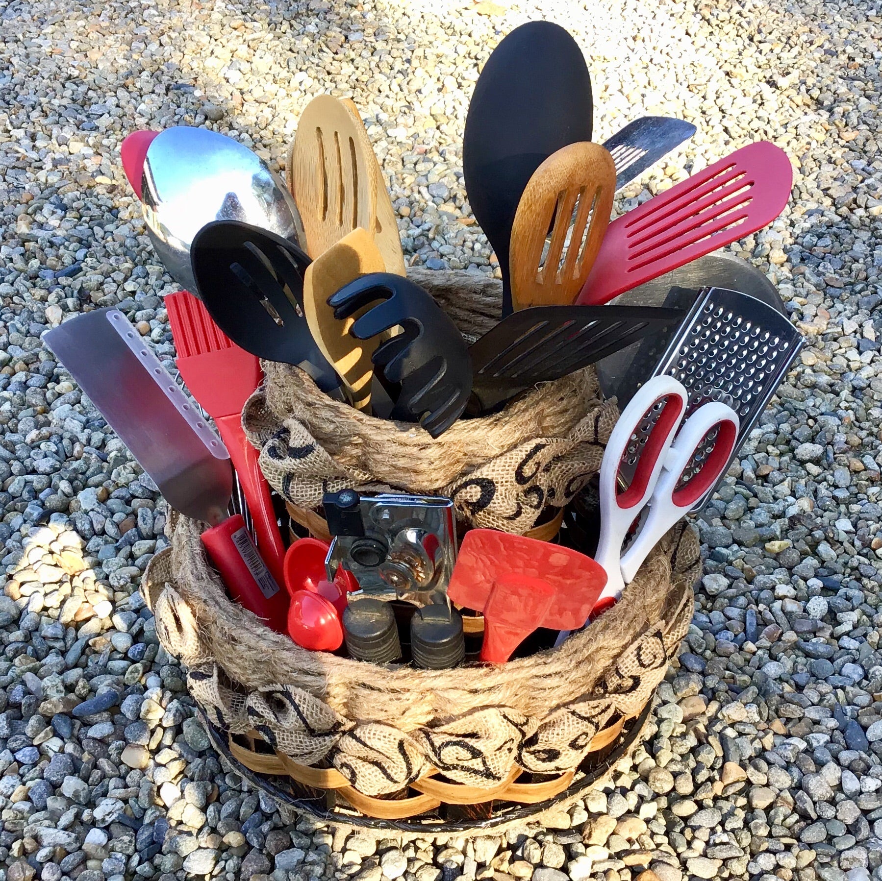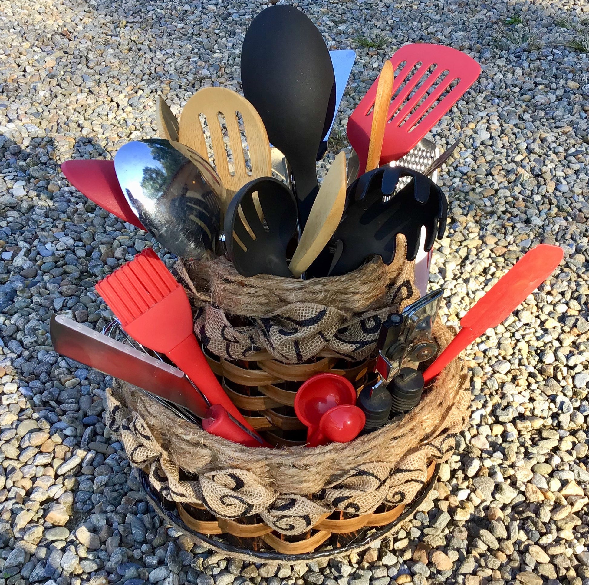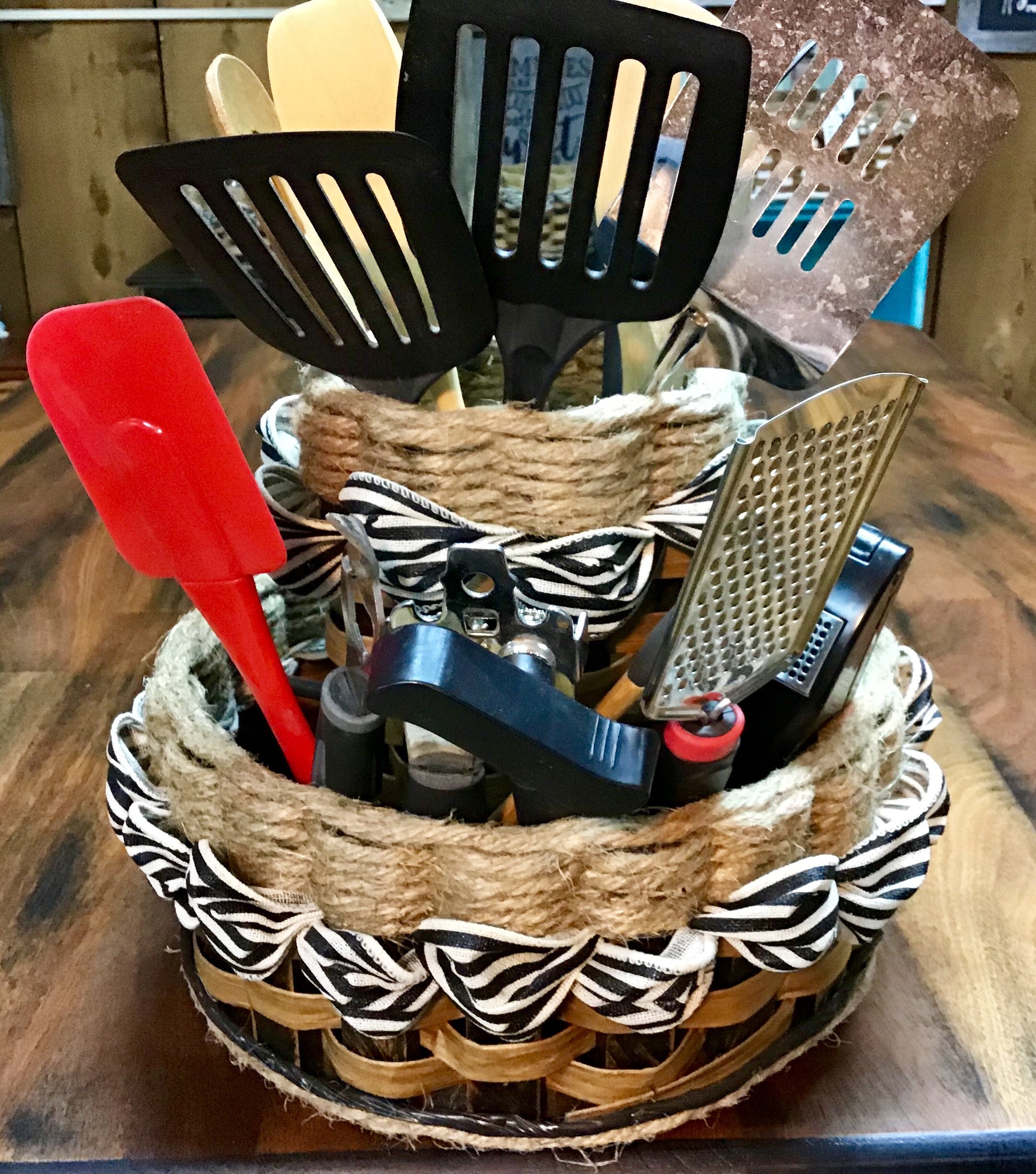 If you are tired of loosing your smaller utensils then this is the basket for you. It holds the small tools on the outside and longer ones in the middle. For example you would have your pizza cutter, ice cream scoop, small scoop, garlic press, measuring spoons,and etc. on the outside. Plus it spins on a lazy susan. 10"H x 10"W