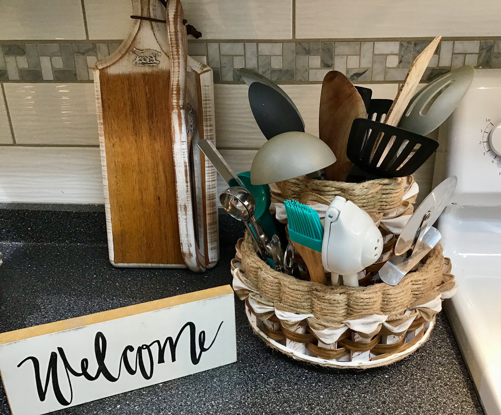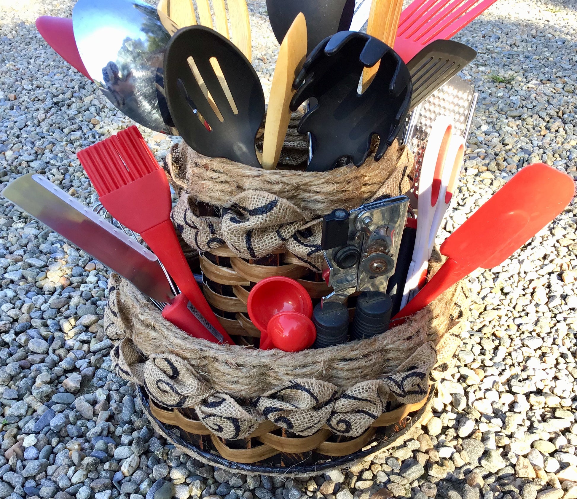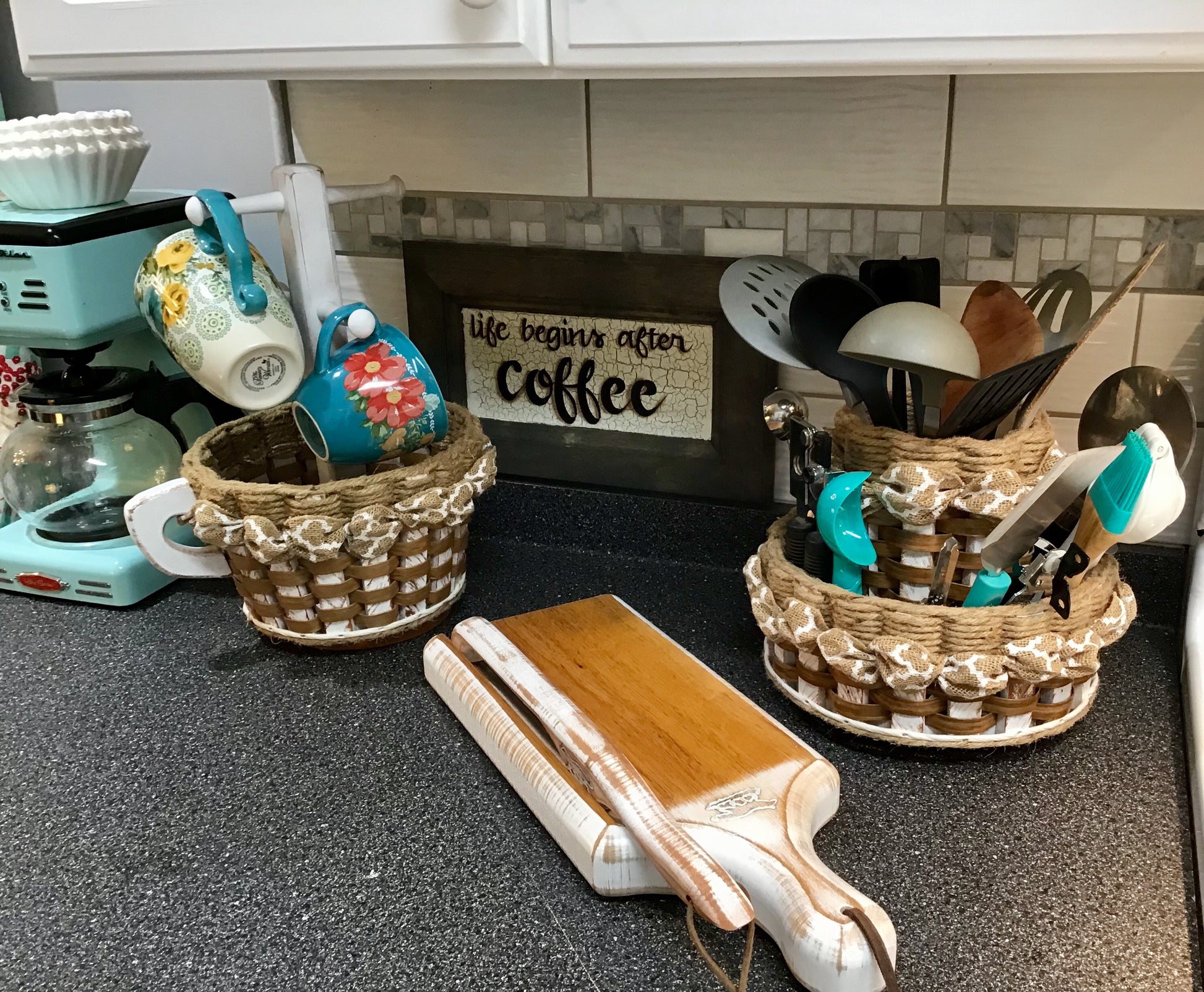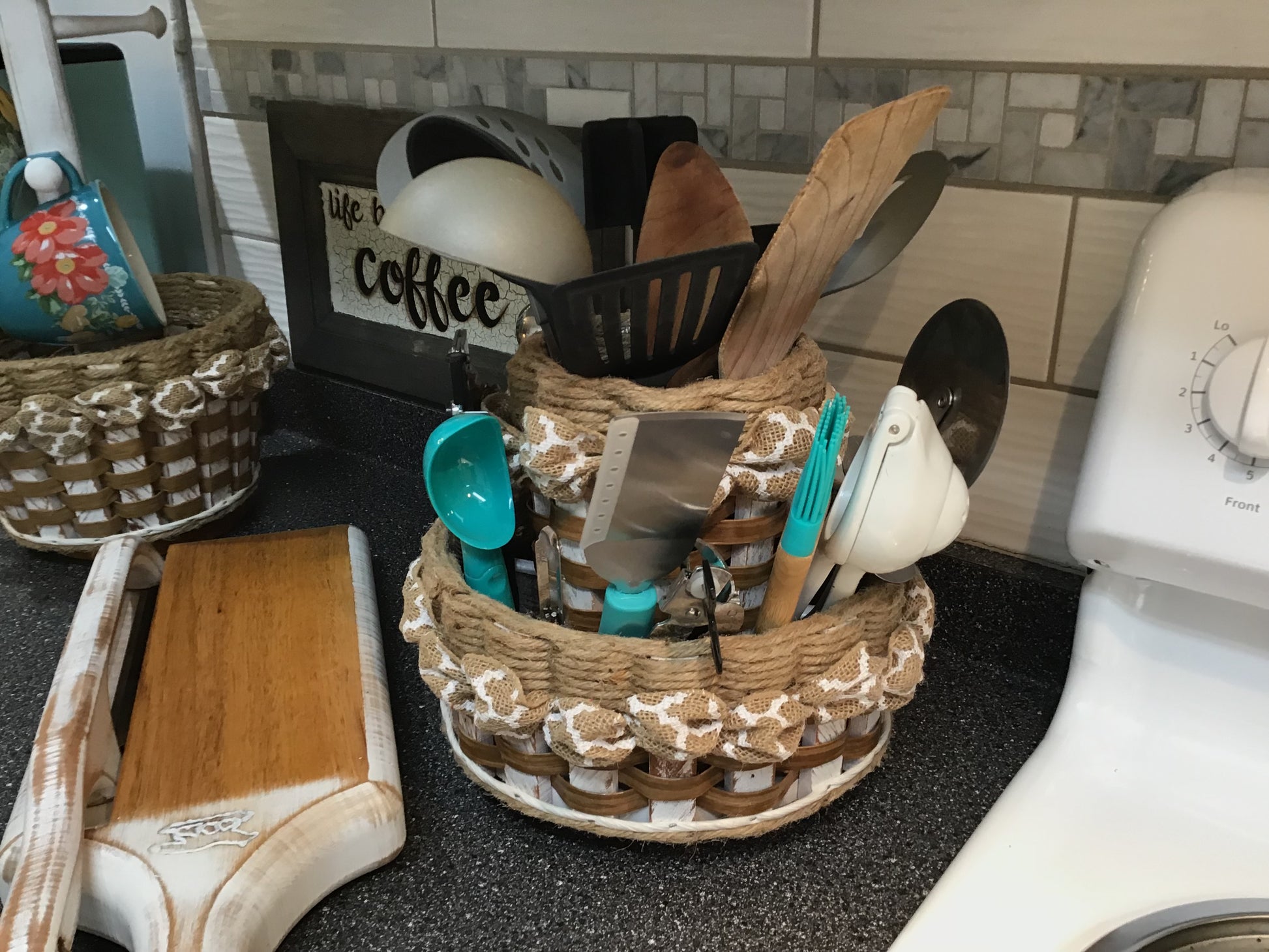 If you are tired of loosing your smaller utensils then this is the basket for you. It holds the small tools on the outside and longer ones in the middle. For example you would have your pizza cutter, ice cream scoop, small scoop, garlic press, measuring spoons,and etc. on the outside. Plus it spins on a lazy susan. 10"H x 10"W