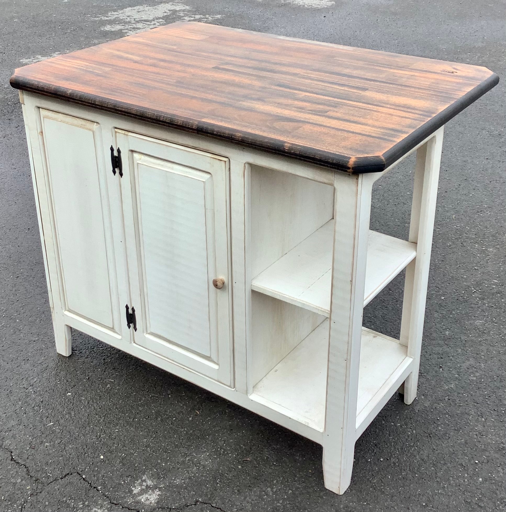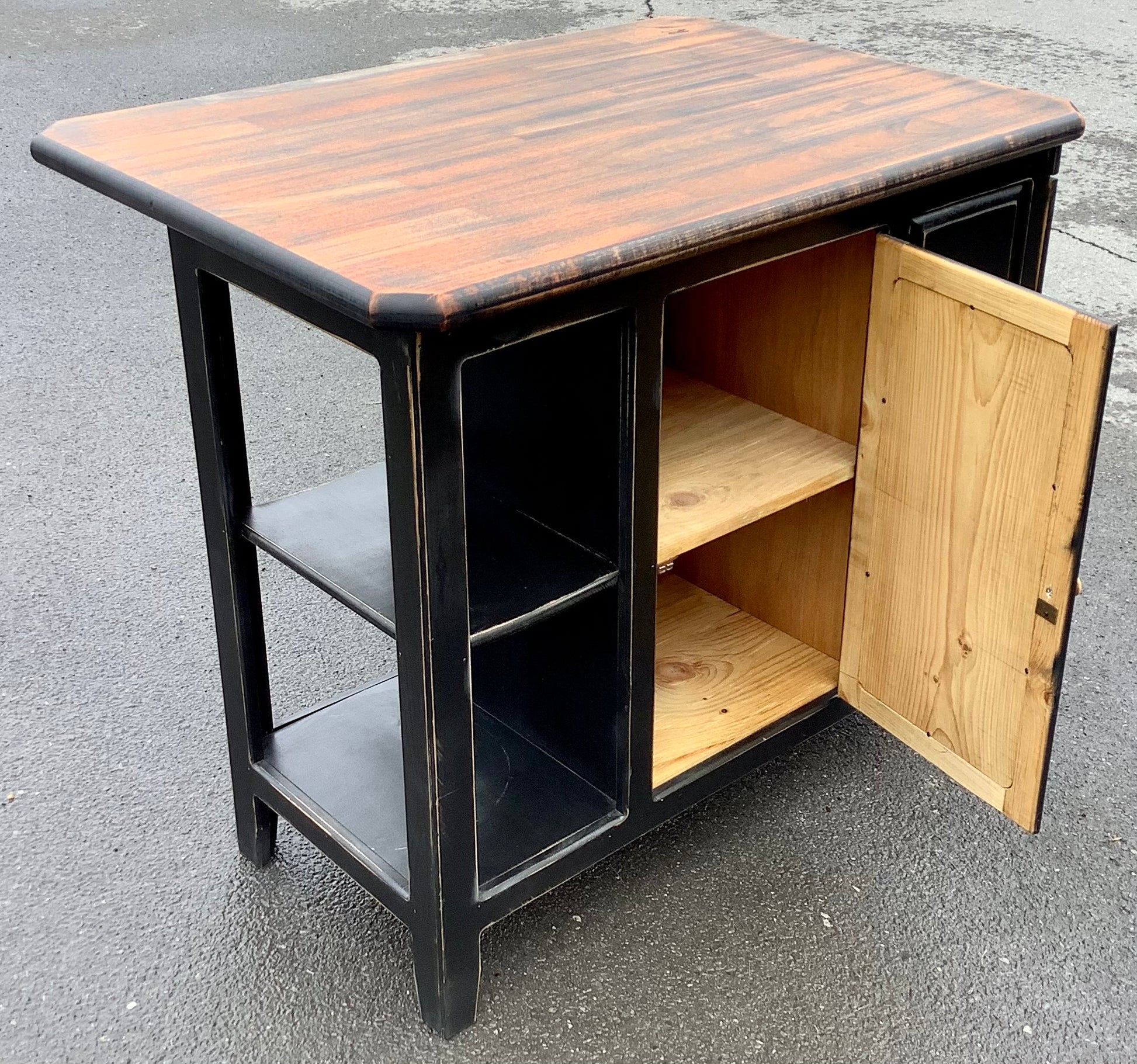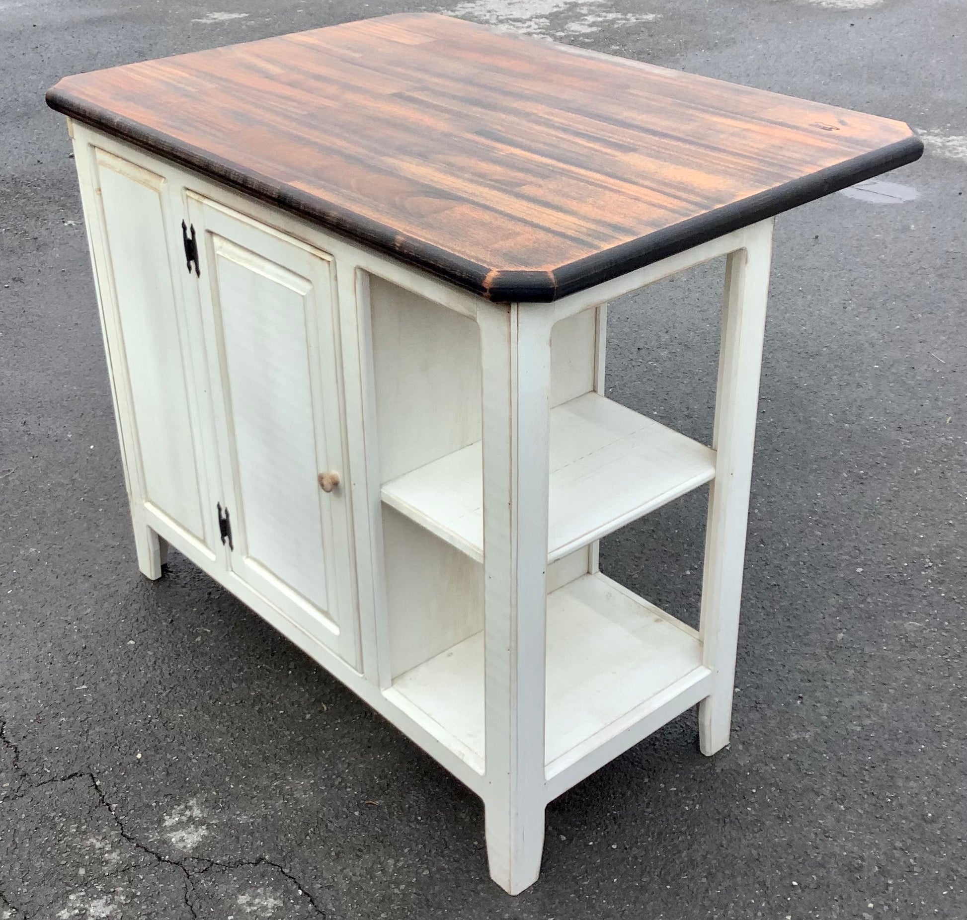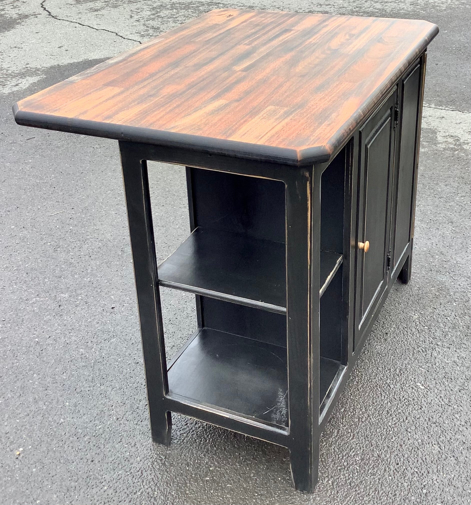 This unit has one of our most popular bases. It is the same base size as the 22x44 unit and has three features, cabinet doors, tilt out trash can, plus shelves for cookbooks or pots and pans but with a larger 32x45 top. Plus for those customers who still need a narrow base but also want seating with their island, then this unit might be the perfect size for your needs. The Old World Black Distress mahogany wood counter top adds warmth and beauty to this Farmhouse Island.