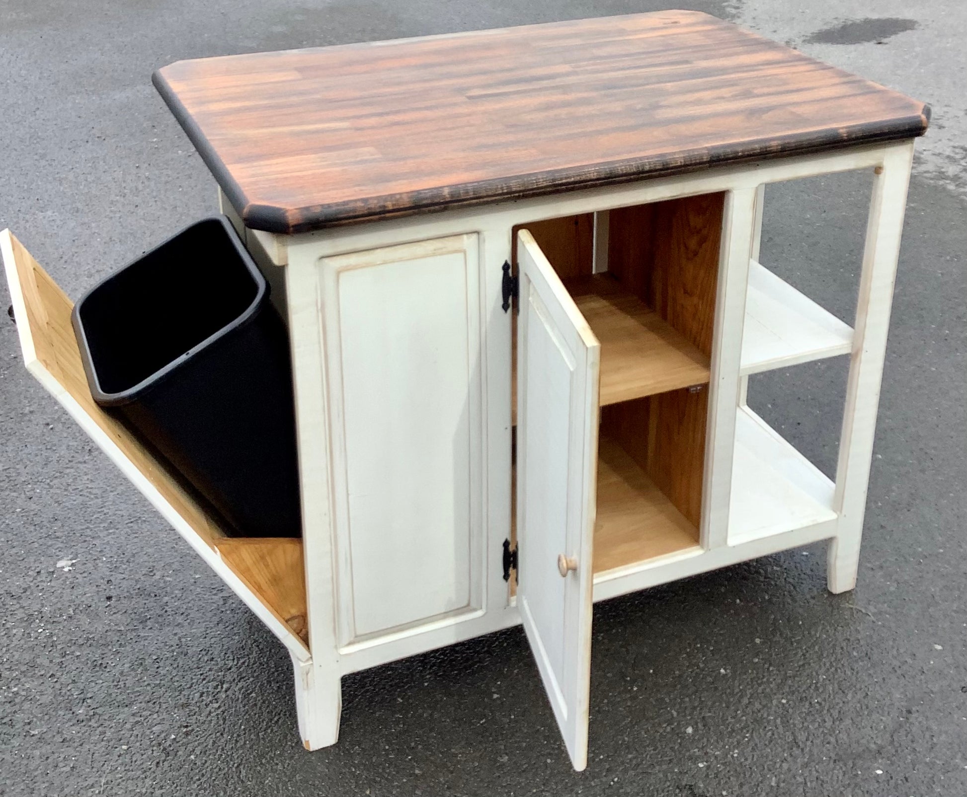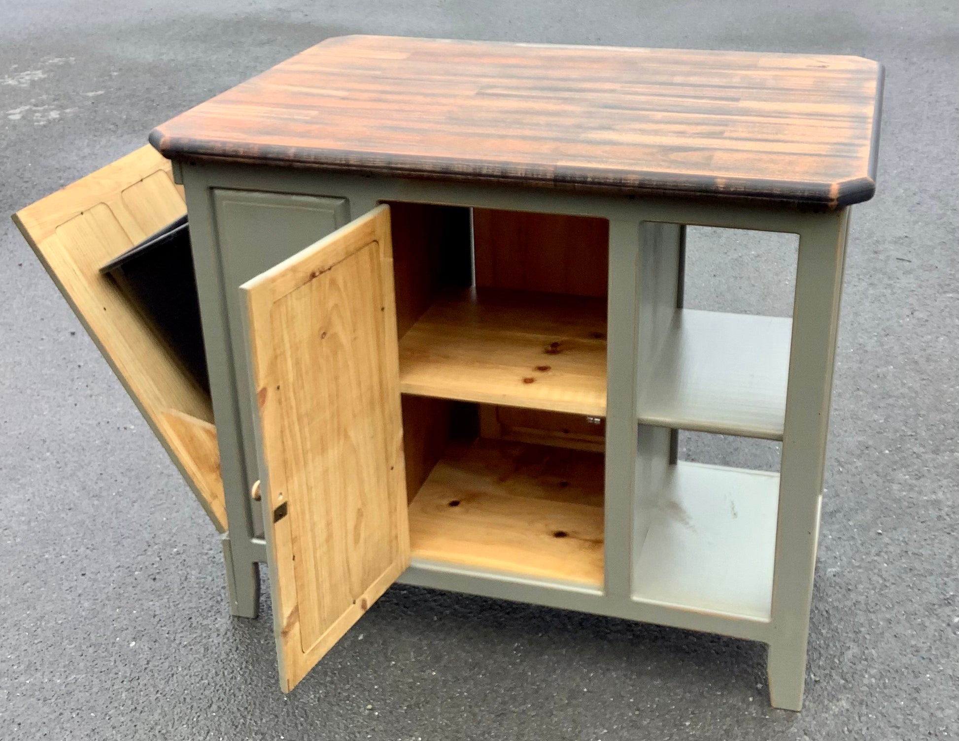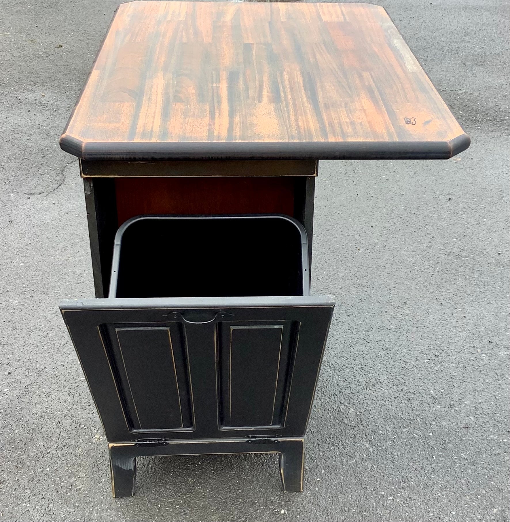 This unit has one of our most popular bases. It is the same base size as the 22x44 unit and has three features, cabinet doors, tilt out trash can, plus shelves for cookbooks or pots and pans but with a larger 32x45 top. Plus for those customers who still need a narrow base but also want seating with their island, then this unit might be the perfect size for your needs. The Old World Black Distress mahogany wood counter top adds warmth and beauty to this Farmhouse Island.