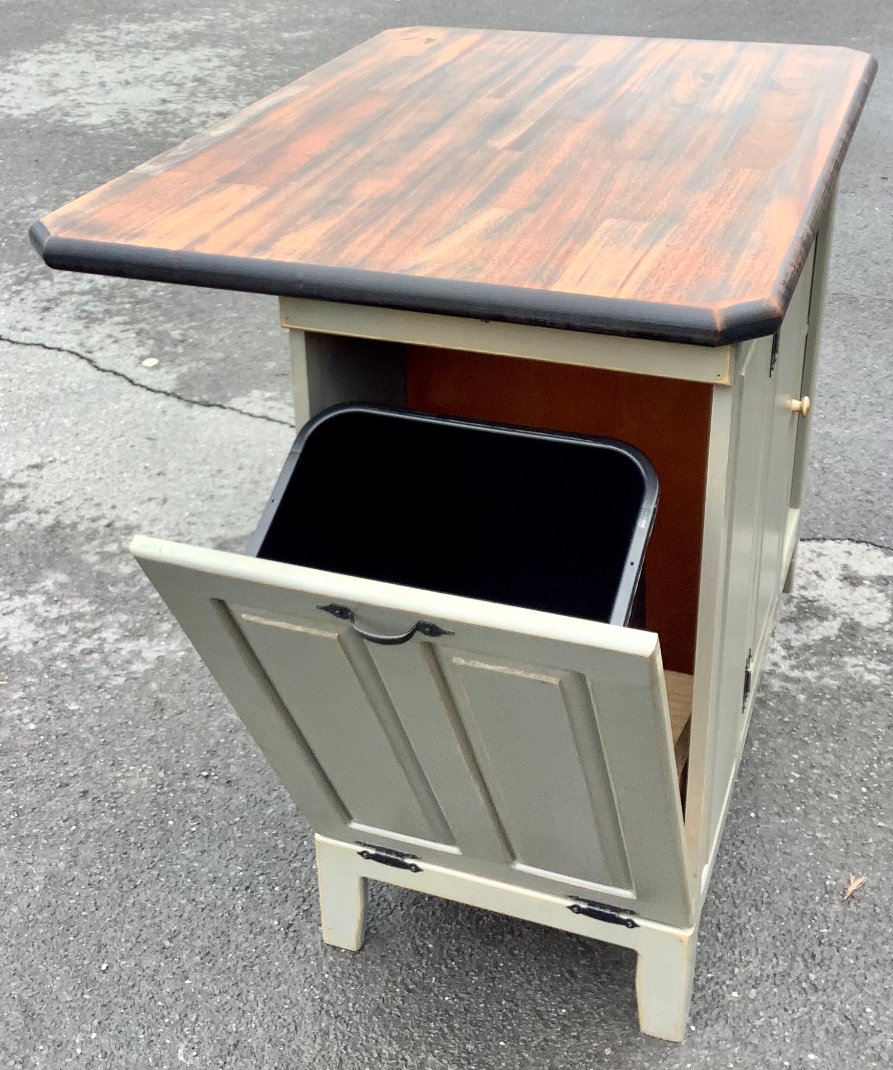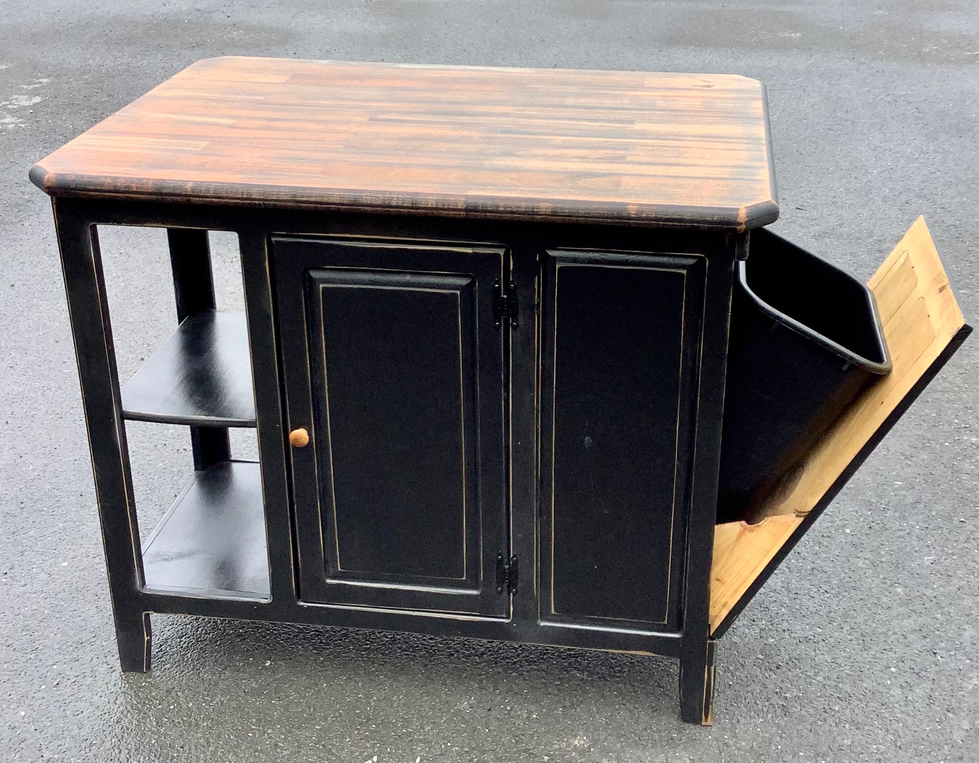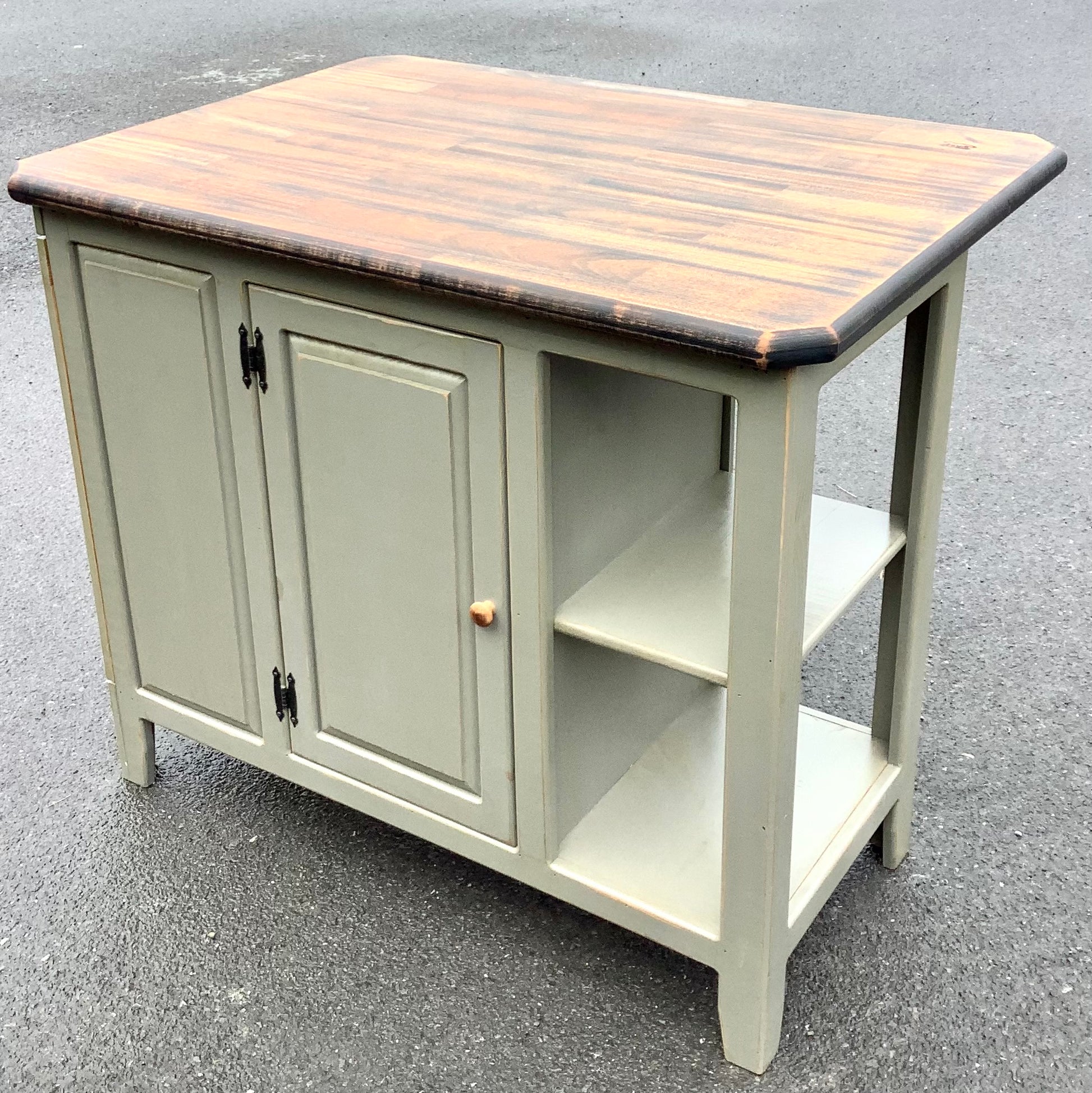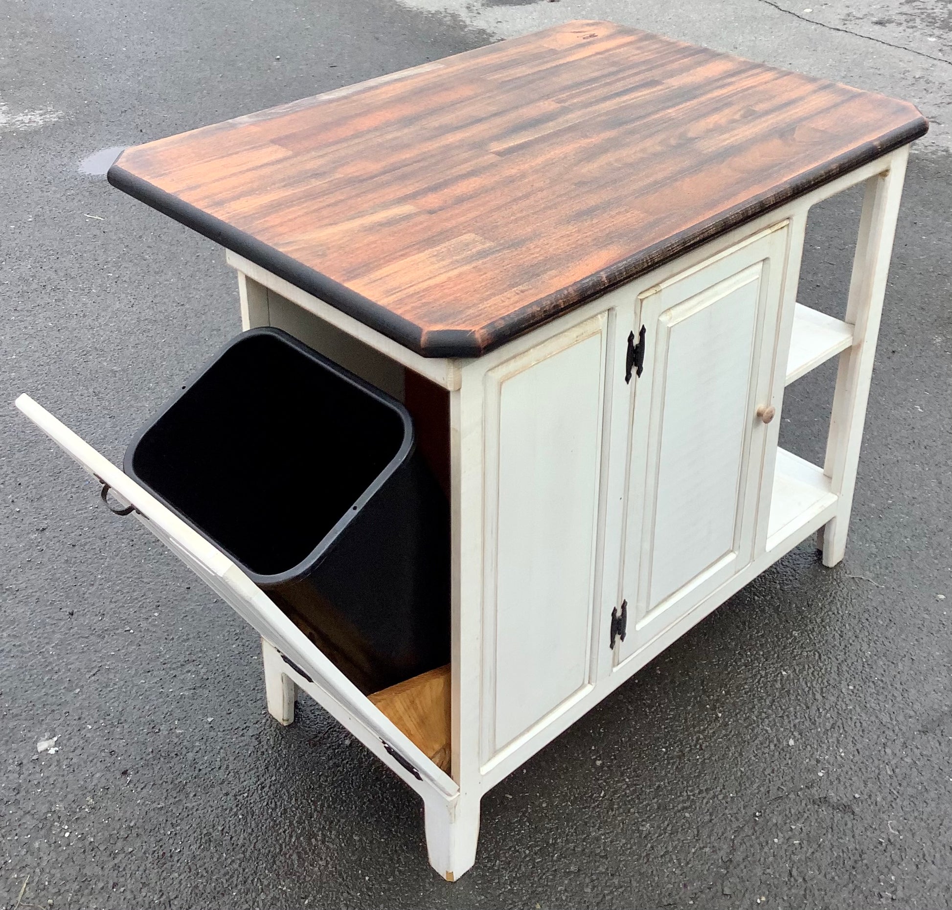 This unit has one of our most popular bases. It is the same base size as the 22x44 unit and has three features, cabinet doors, tilt out trash can, plus shelves for cookbooks or pots and pans but with a larger 32x45 top. Plus for those customers who still need a narrow base but also want seating with their island, then this unit might be the perfect size for your needs. The Old World Black Distress mahogany wood counter top adds warmth and beauty to this Farmhouse Island.
