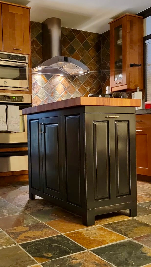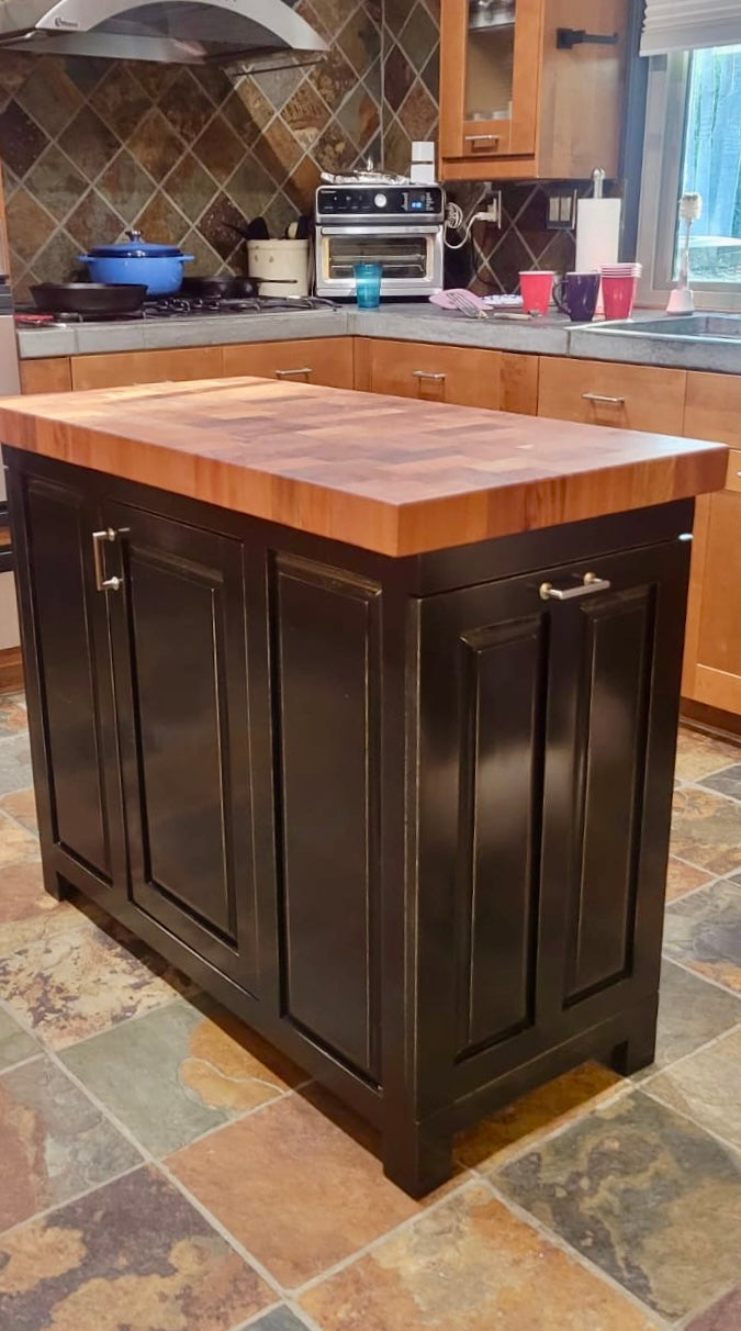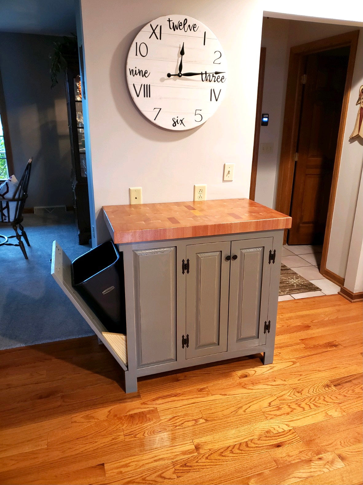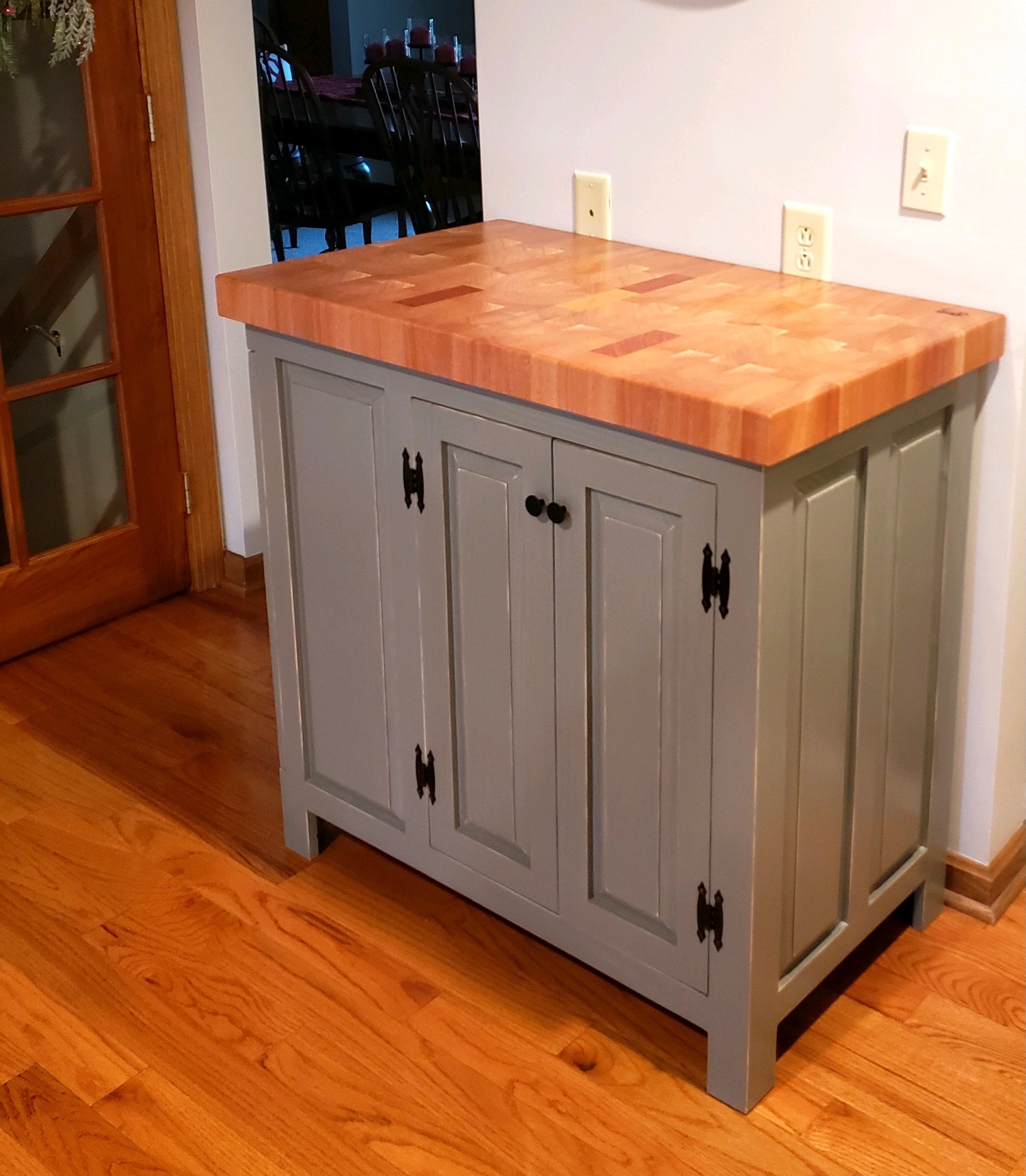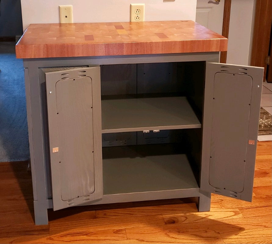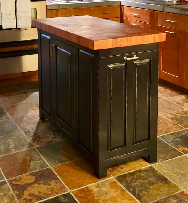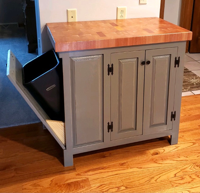 One of our most popular sizes of 22x44 but completely enclosed. This unit domes with double doors on the front and a tilt out trash can on the end. You can add a 10 inch bar overhang on the back for seating. Or you can add casters so this unit can be mobile. Let our family handcraft your family a kitchen island today.