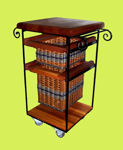 This small unit is great because it will fit just about anywhere and when you need it just roll it. It can come with three basket drawers instead of two basket drawers. The casters all lock. This unit shows towel bars on each side. The size is 19x19x36. Call for custom sizes. Allow 12 weeks for delivery.