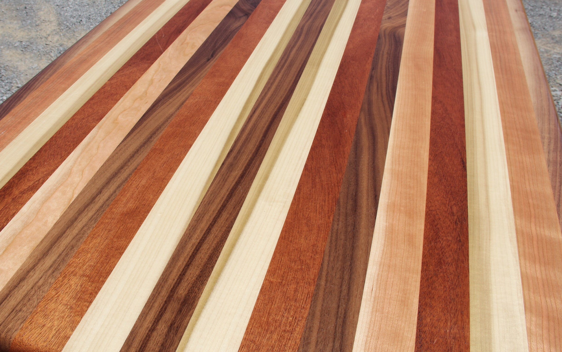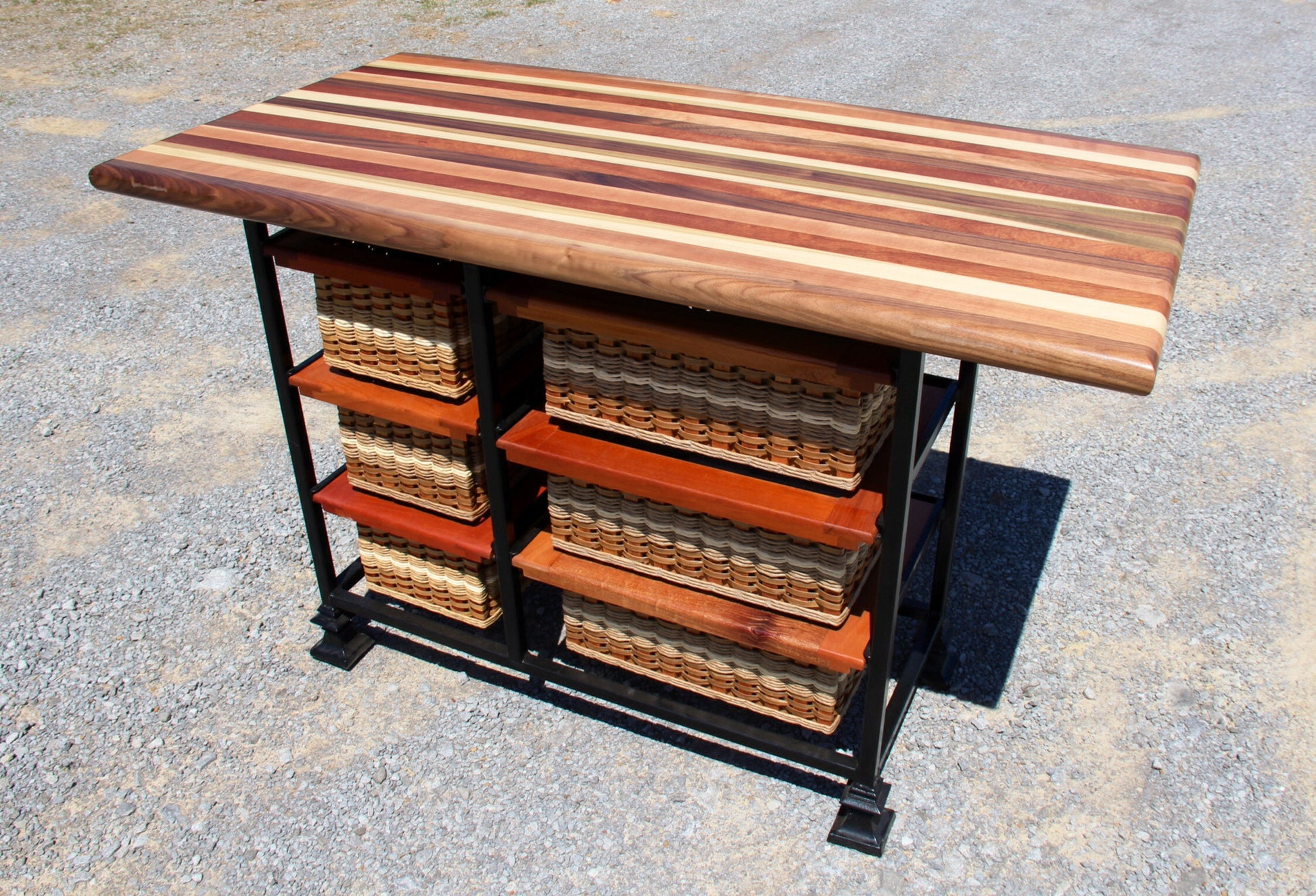 This unit is 32x60 with a striped wood top and six small and large basket drawers. The striped top has mahogany, black walnut, cherry, poplar, and maple in it. It has a square steel metal frame that is powder coated. The basket drawers come with stops so that they will not fall out. Custom sizes are available. Delivery is 10 to 12 weeks.