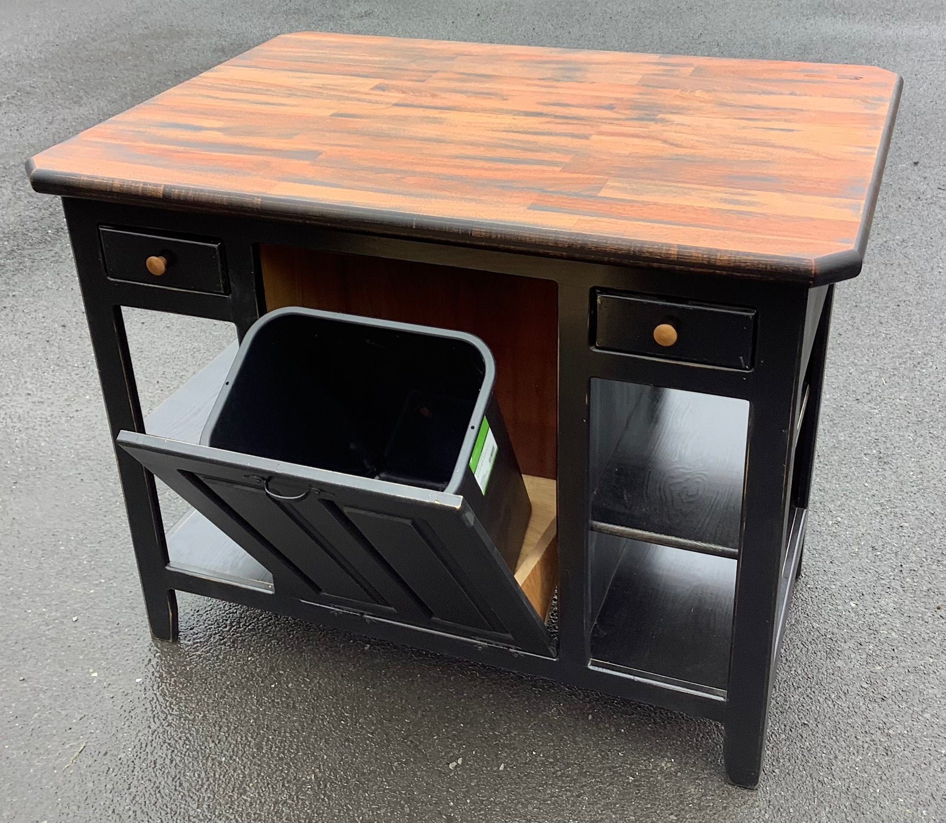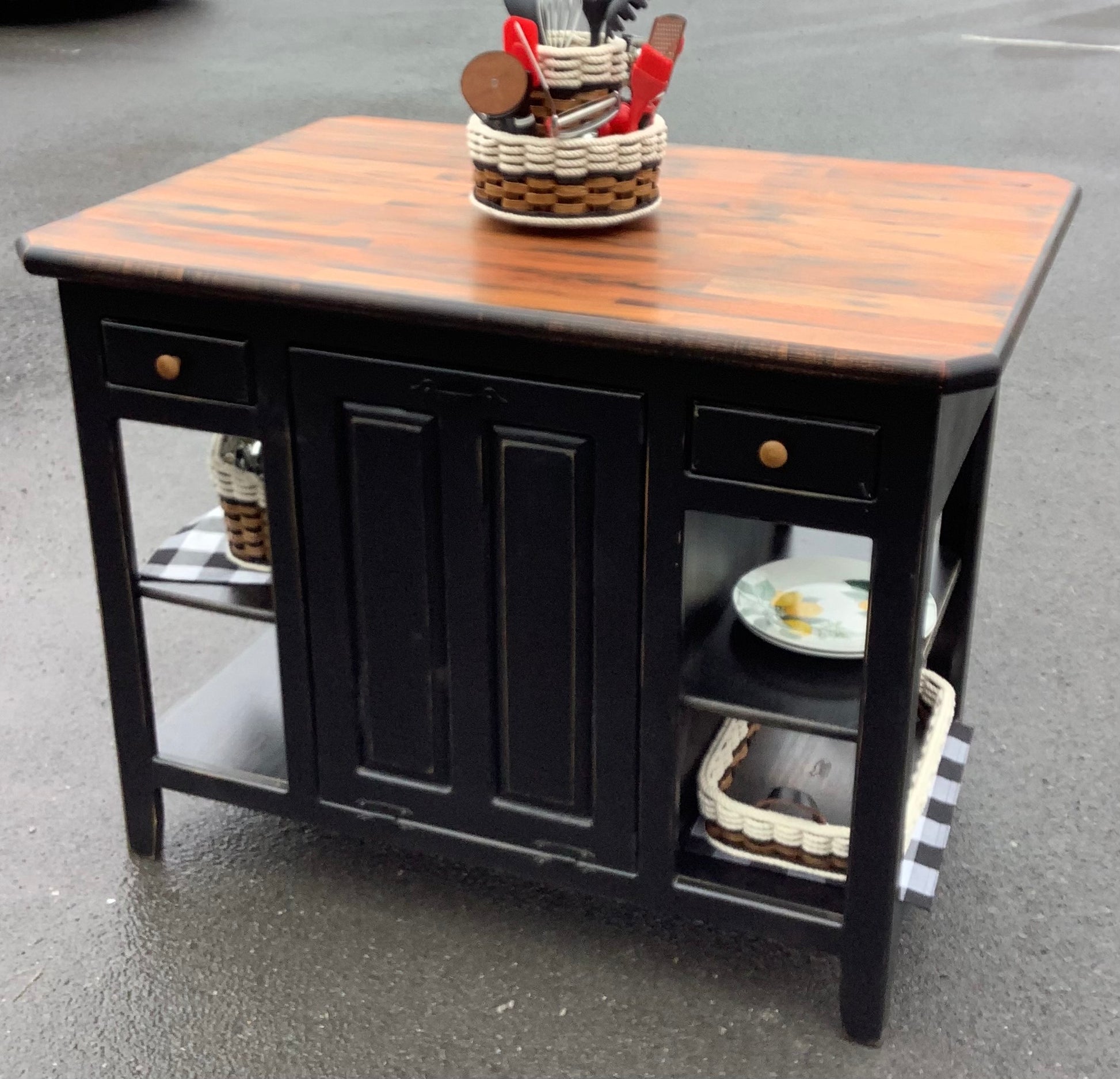 Do you need a cozy island with seating but still want the functionality of storage, a concealed trash can, and a warm mahogany wood top? Your family or visiting friends can enjoy many fun memories sitting at this island for many many years. This unit can come in distressed black, off white, red, blue, or grey. It has the concealed trash can, two drawers, open shelves on both sides, and a cabinet in the back for storage as well and has the 36 x 50 Mahogany top. If you need this island larger then contact us for a quote.