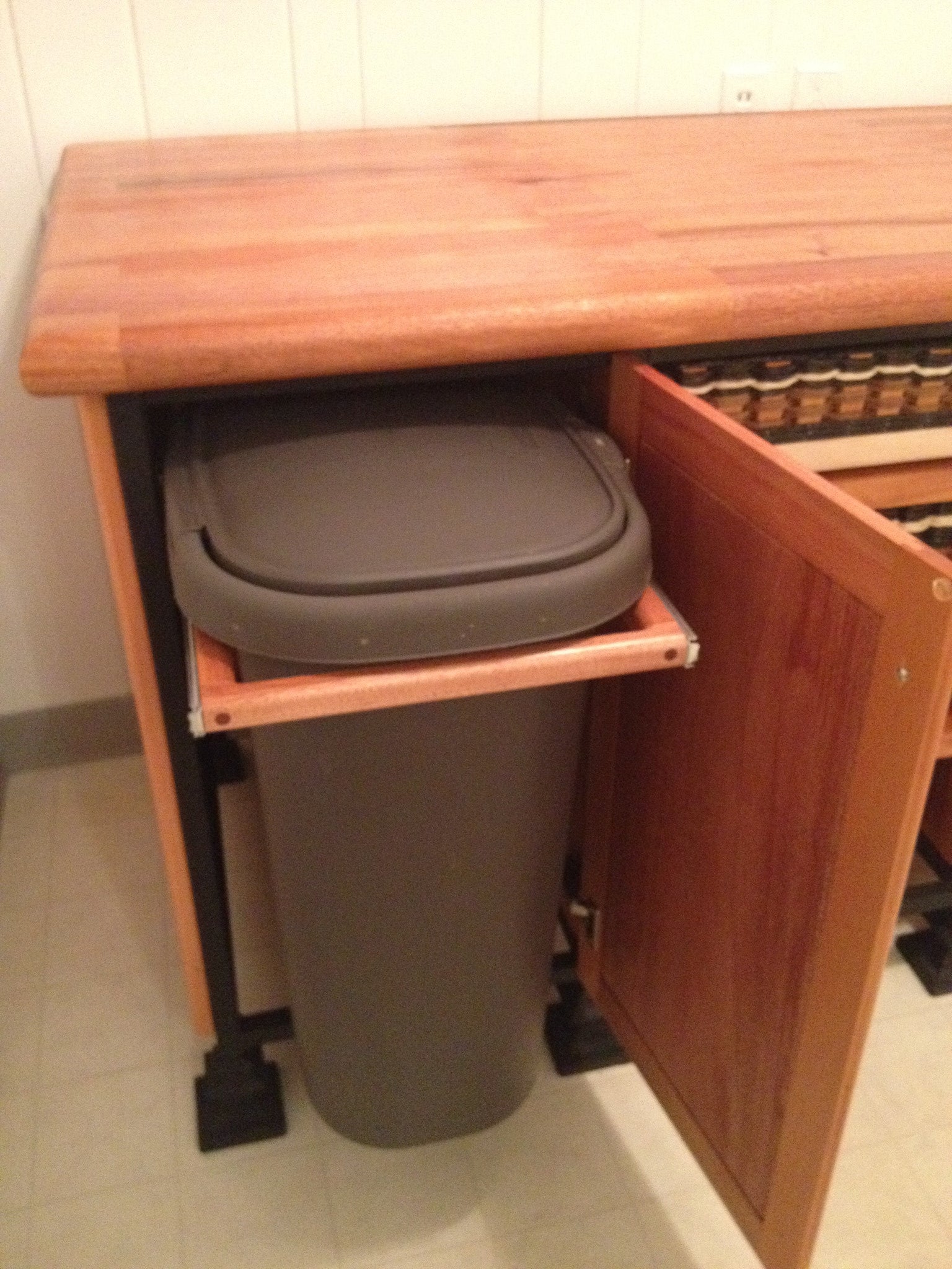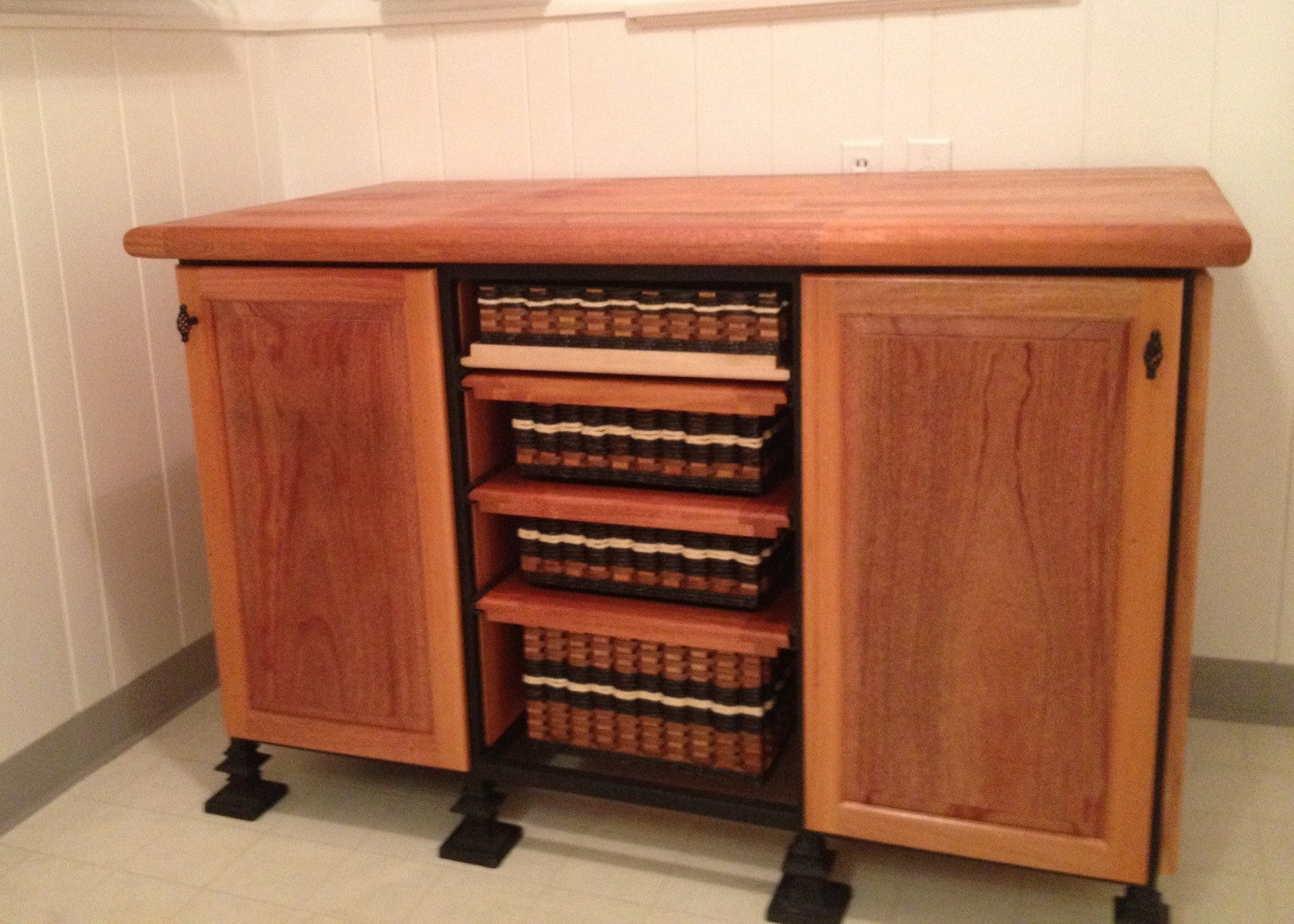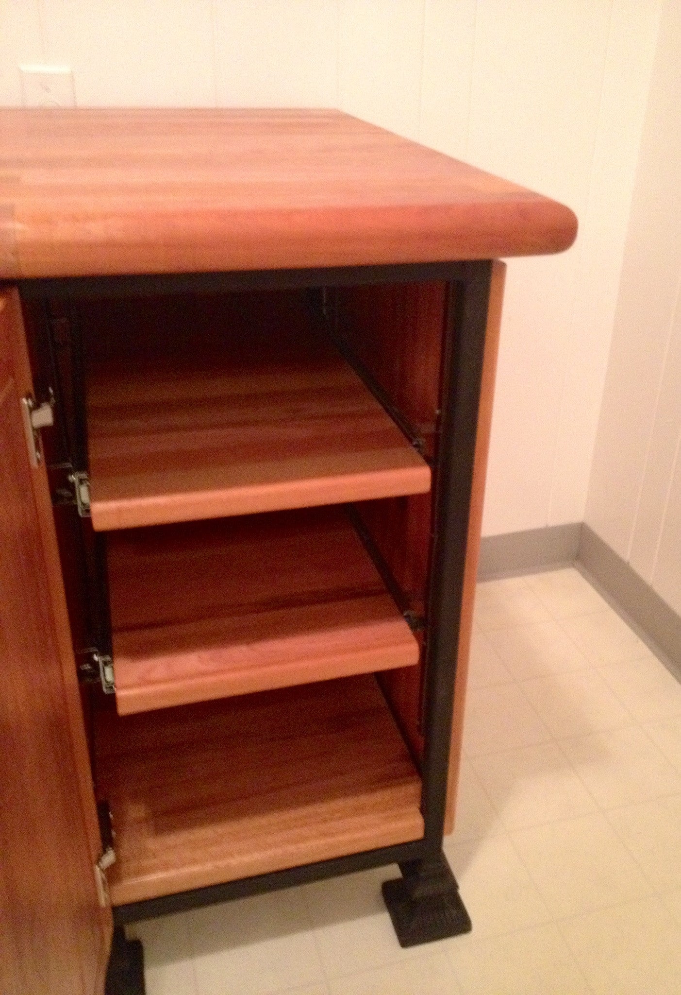 36" high this island has trash can, silverware basket with maple cutting board and two slide out shelves. Base is 30" x 56" with black powder coating.