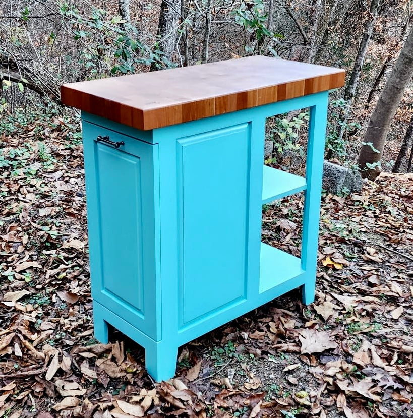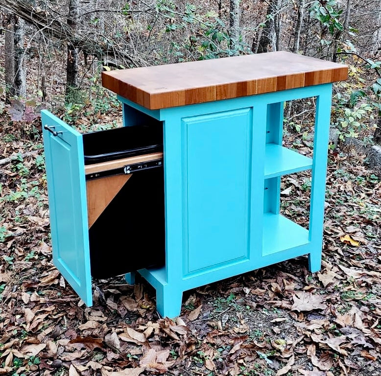 We can make this small narrow island any size you need and we can enclose the open shelves if you prefer a cabinet pantry instead.