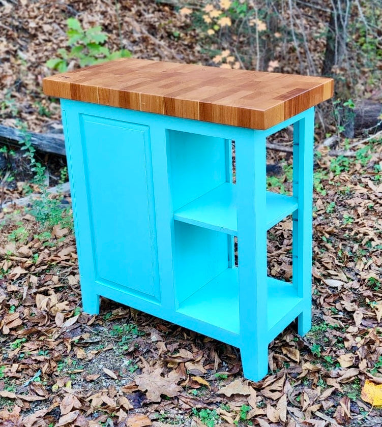 Do you need a small but narrow kitchen island? This beautiful handcrafted kitchen island with a solid poplar wood base and mahogany end grain butcher block top that is 17x35. Mahogany End grain but her block tops are very hard. You can cut in this top and prepare your food for a healthy life. Also even after cutting on this top after 5 years, you would only have fine scratches and nothing very deep.