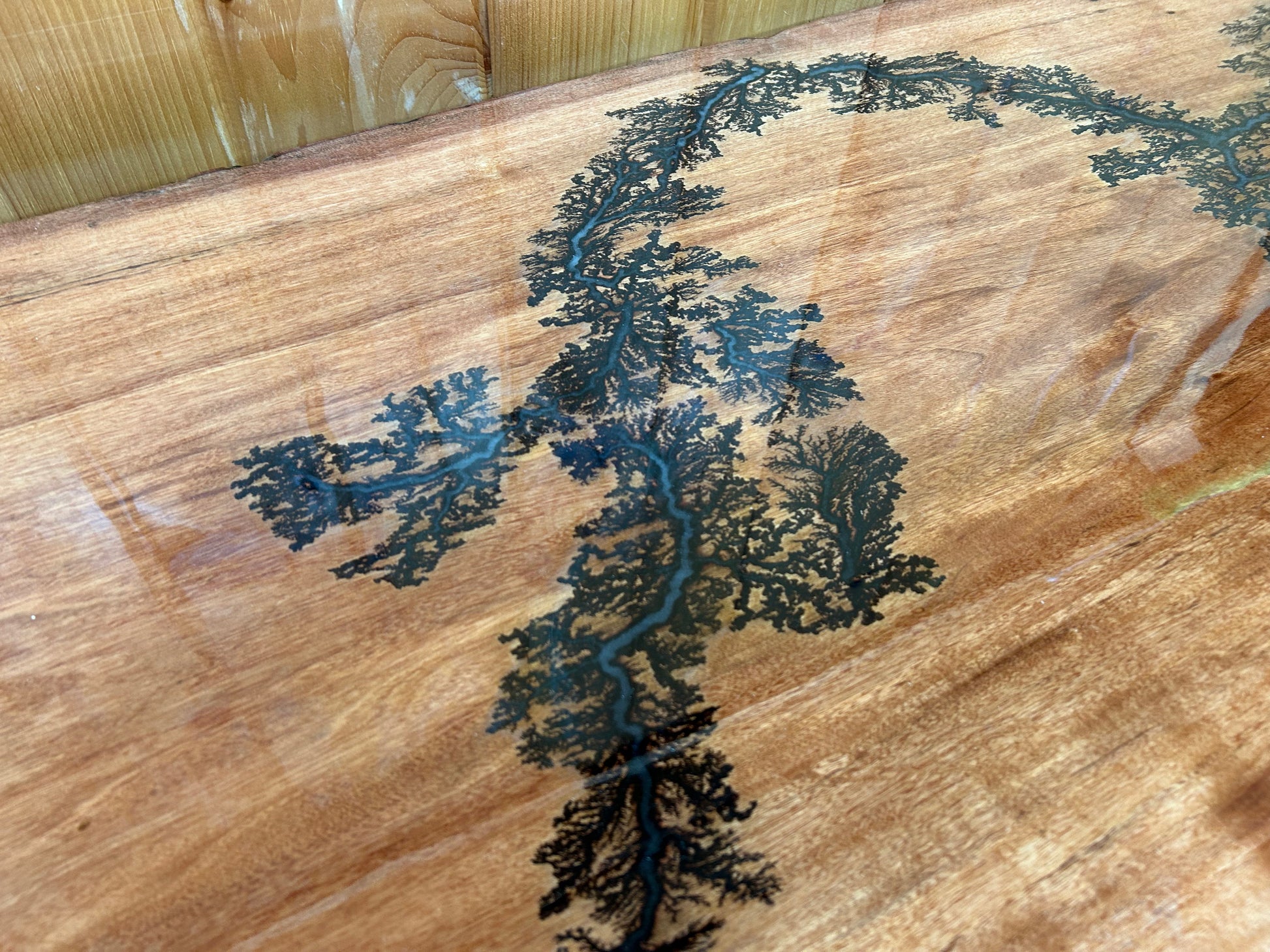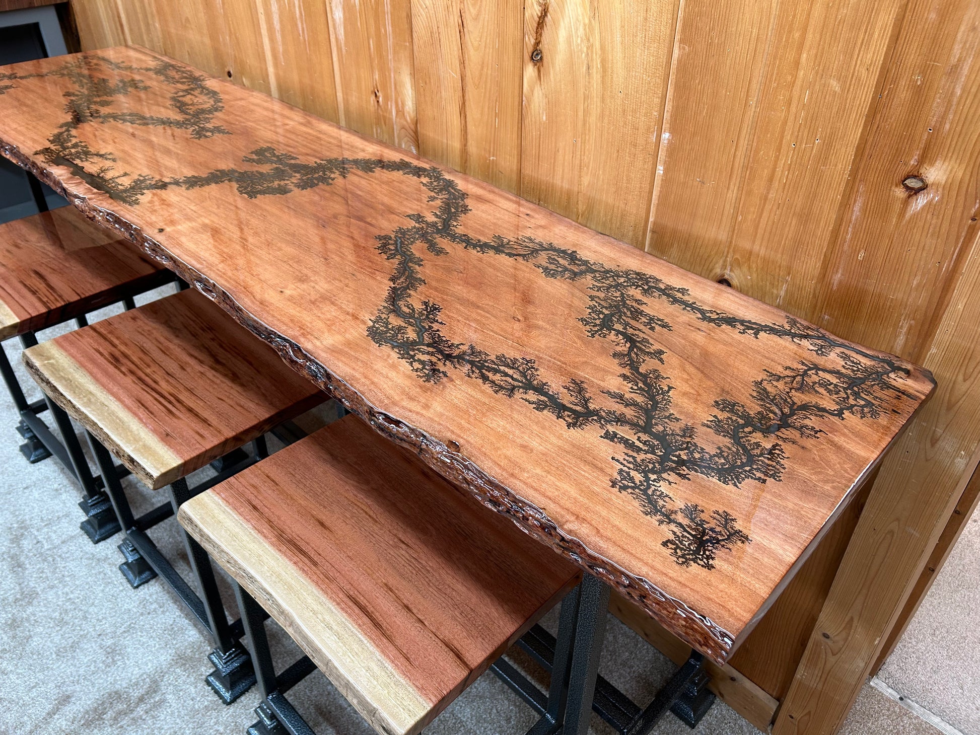 We love how the fractal burning ended up with this piece of Tiger Wood. It snaked through the length of the top. You have so many awesome features of this combo we have handcrafted. You have the Live Edge Tiger Wood on the table as well as the bar stools, you have the fractal burn in throughout the top, plus the Tiger wood top and bar stools have a thick layer of clear epoxy on them which makes it very durable! Not to even mention the steel frames which is powder coated in a silver vein finish. Very durable overall! Will last lifetimes!