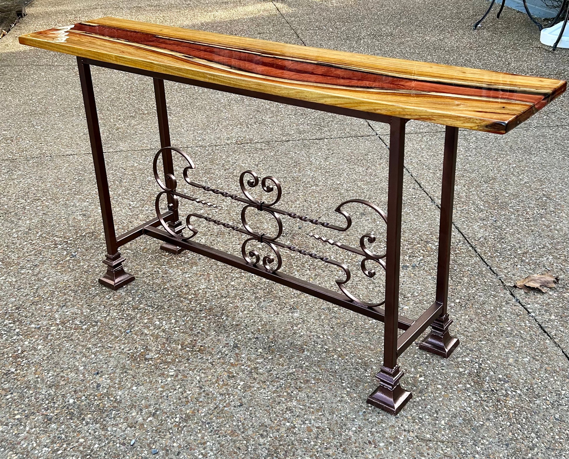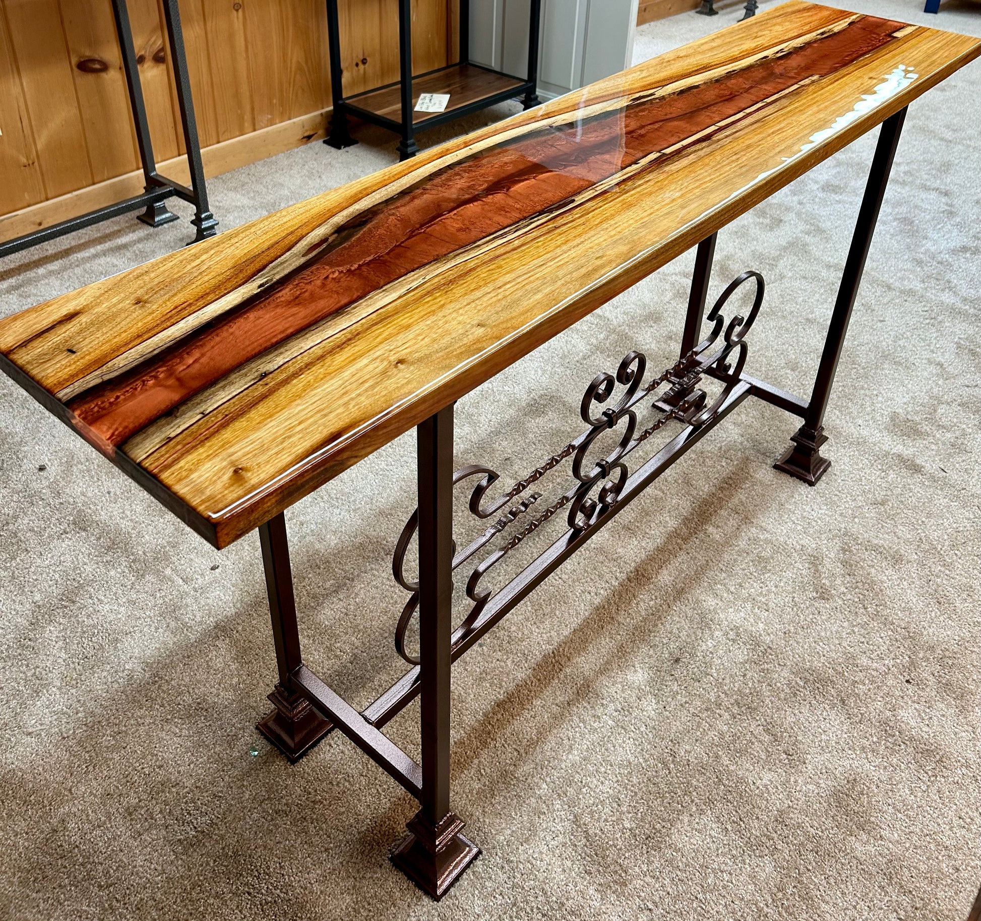 First if you have not seen Canary wood up close it is a shame. Canary Wood has so many different colors available to feast your eyes upon. The overall color of canary wood is more yellow, but it has reds, coppers, blues, purples, black, and sometime even green. We took this beautiful slab and cut it in half and turned the live edge in so the river would look more natural. The river is molten lava of copper running through it. It also has a clear epoxy finish all over so it shines so much you can see your reflection. The epoxy finish is ver durable as well! This table is 13.5 inches wide by 61 inches long. It has a Penny vein copper powder coated steel frame under this skinny entryway river table. Call or email for custom orders.