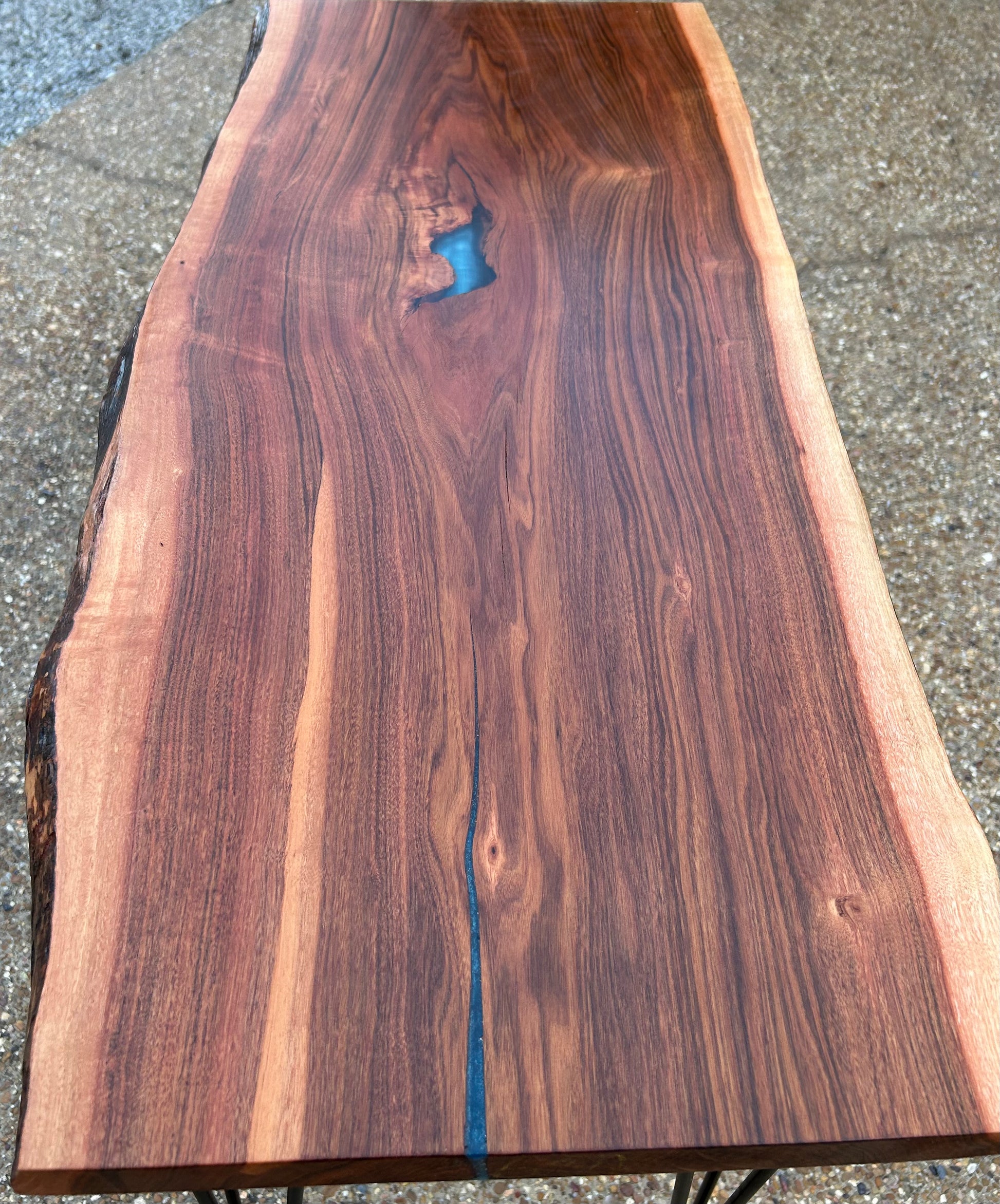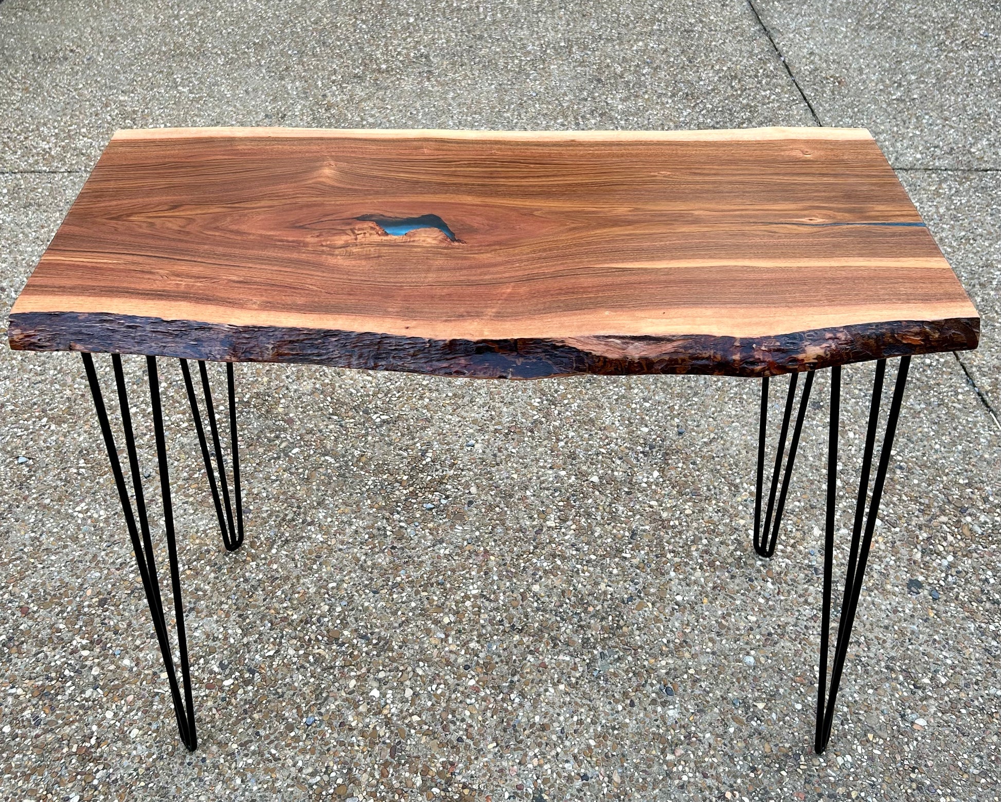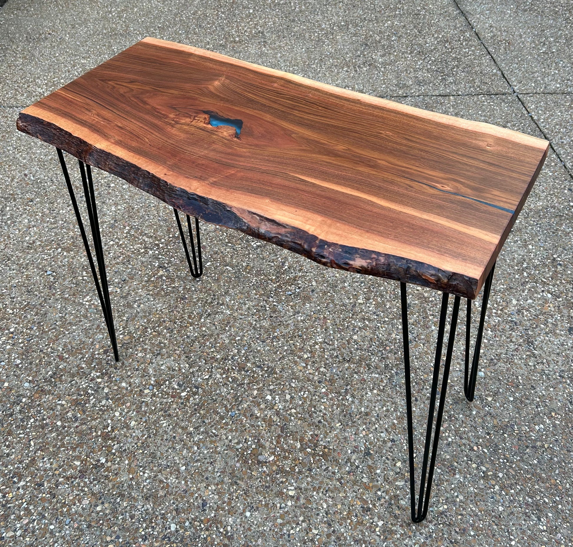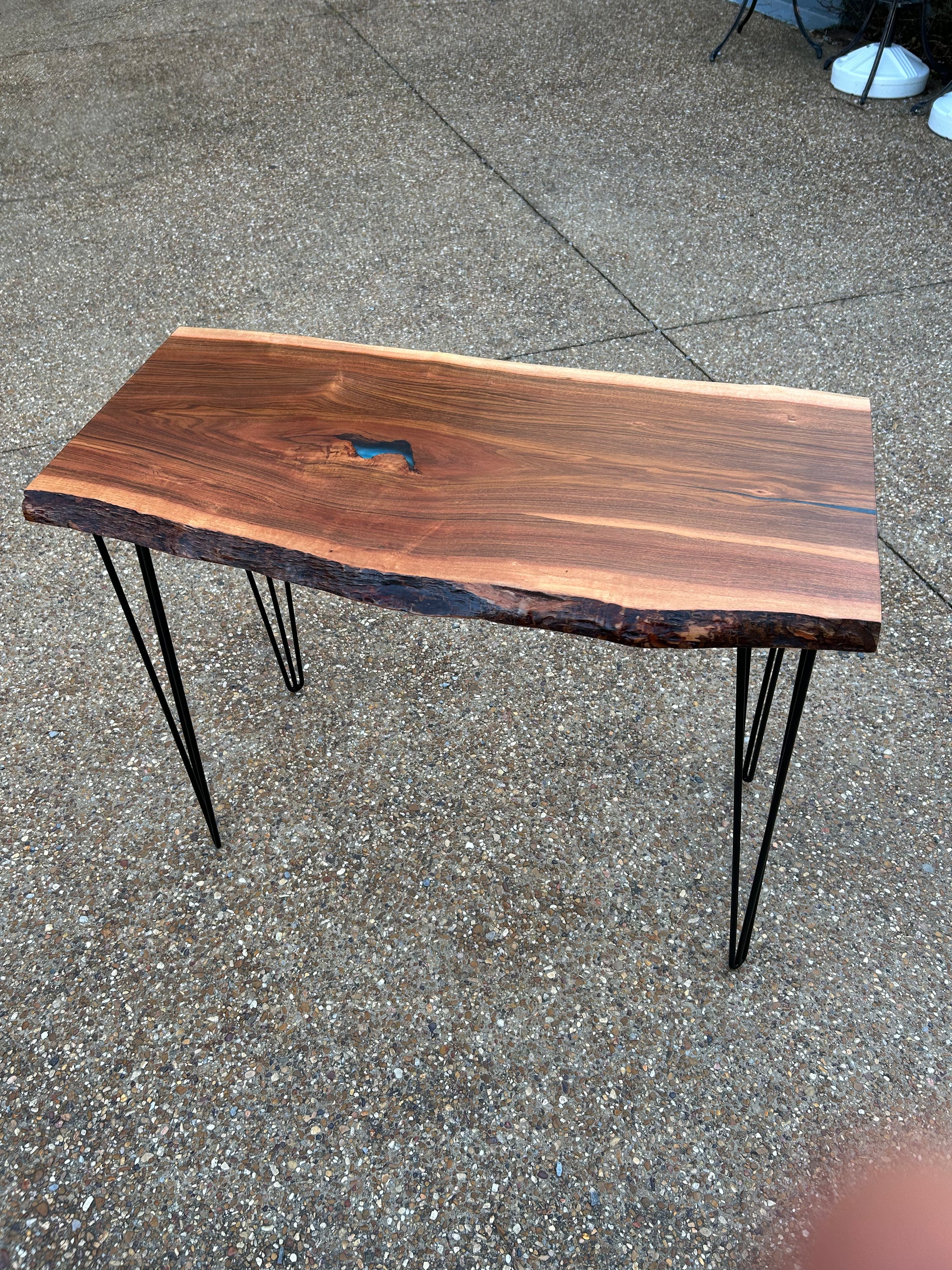Do you need a small entryway table but want it in the natural live edge look? We can make whatever size you need for your entryway or hallway. This small 36 inches long be 18 inches deep live edge slab table of Patagonian Rosewood can be used for a entryway table, console table, or even a desk since it is 32 inches tall. We filled the knot with blue epoxy and the crack on one end with blue epoxy as well. It has black steel pin legs. We can however do different legs or bases. Call or email us for a custom size.