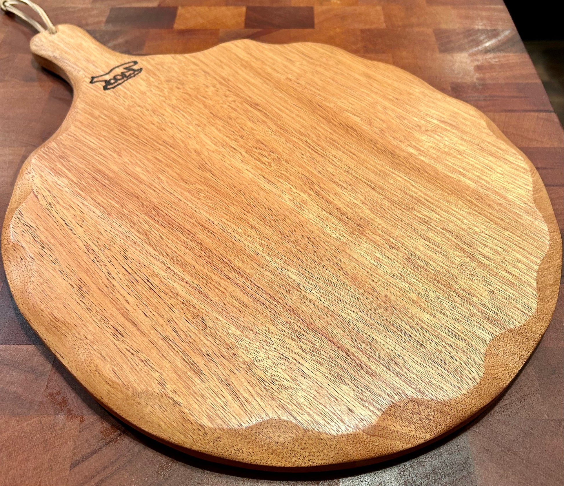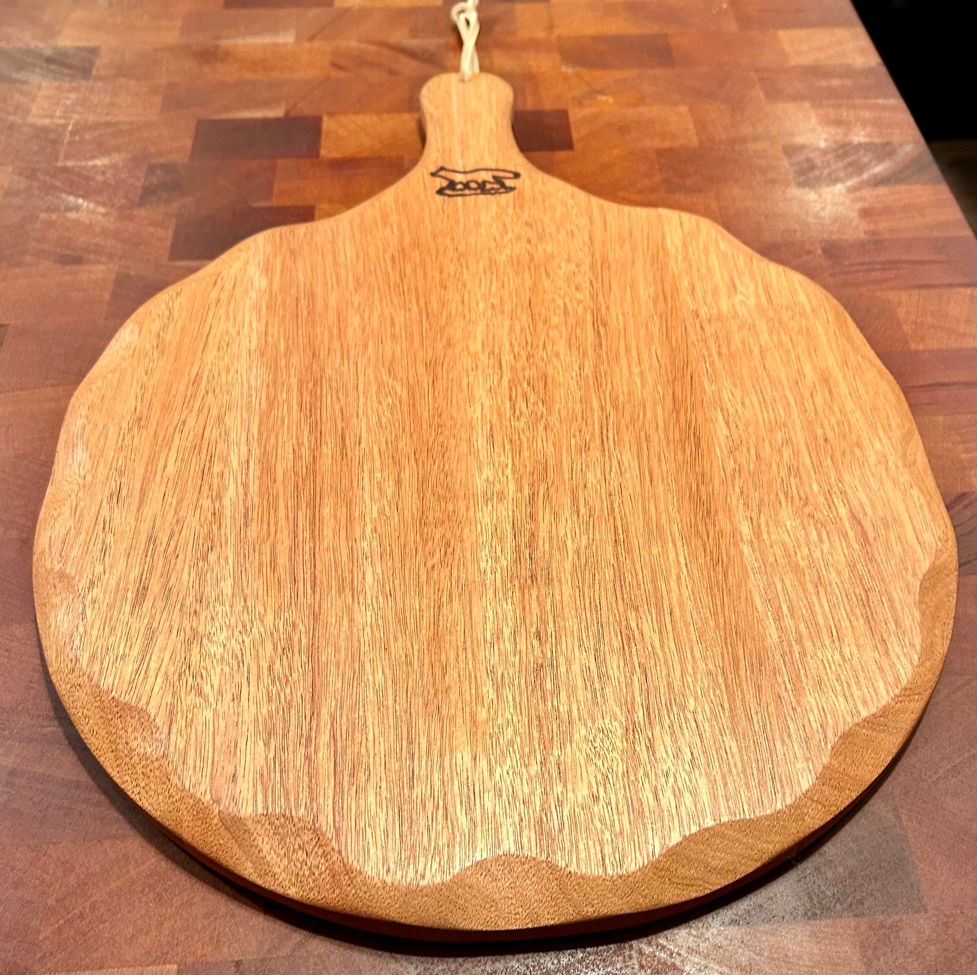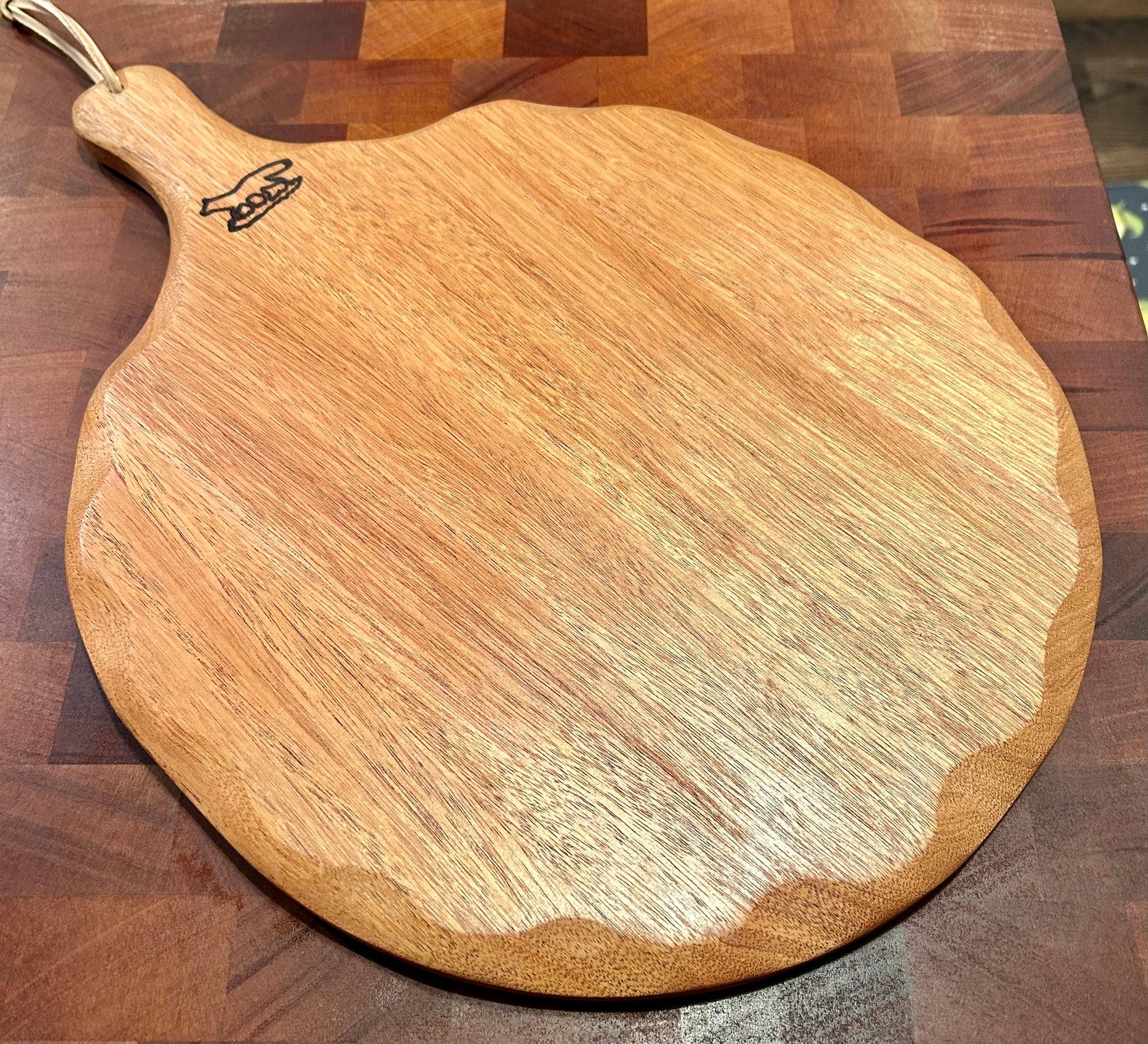 Not only will this get your pizza out of the oven but it would look oh so cute hanging on your kitchen wall. We put a waned edge on this solid mahogany board to give it that old look.