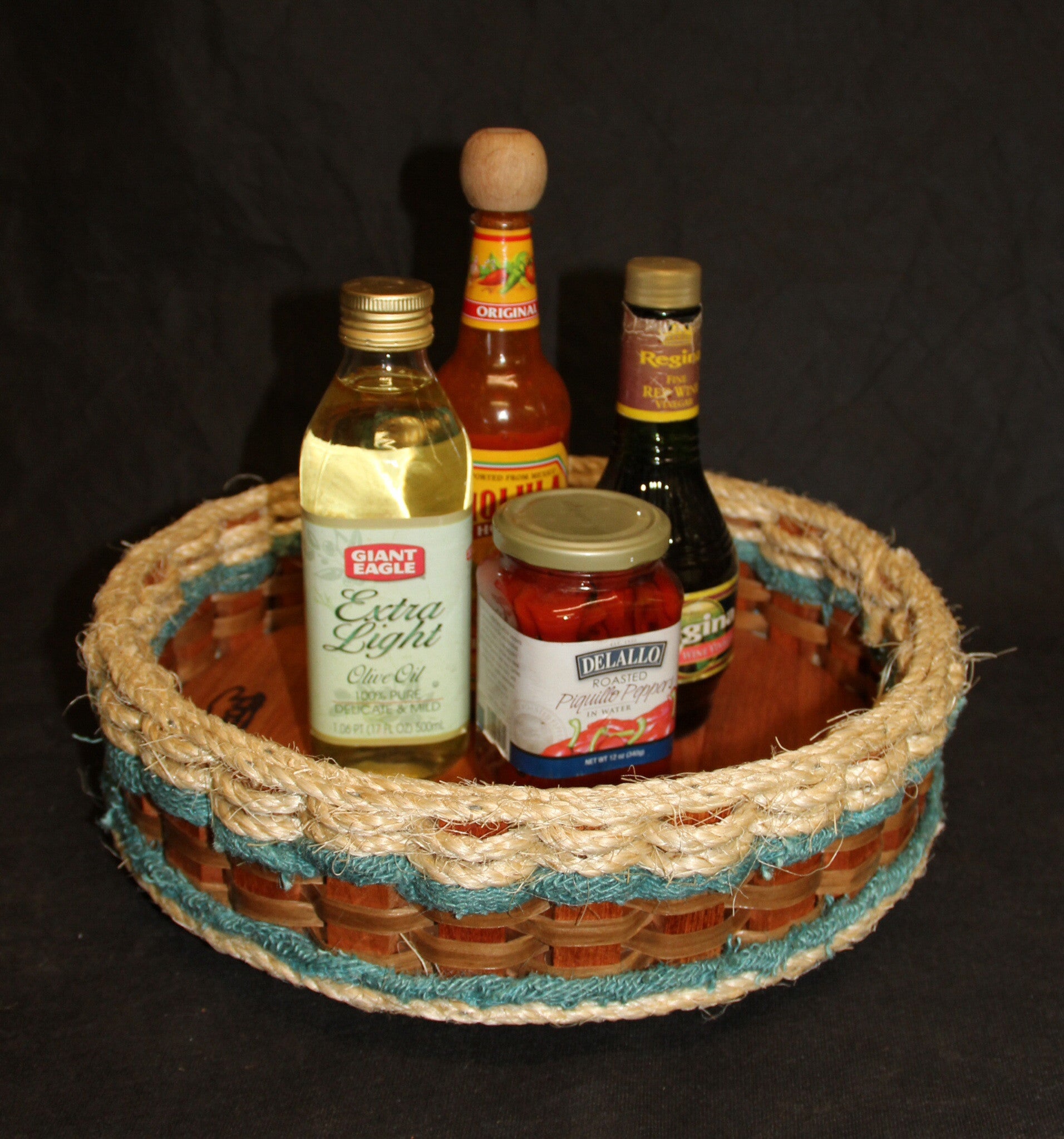 Our large Lazy Susan basket now in the new shabby chic look has so many uses! It works great as a serving piece while entertaining due to it holding any 12 inch serving piece. It will also hold condiments. Works great for a fruit basket too. I like to put cooking oils in it too.