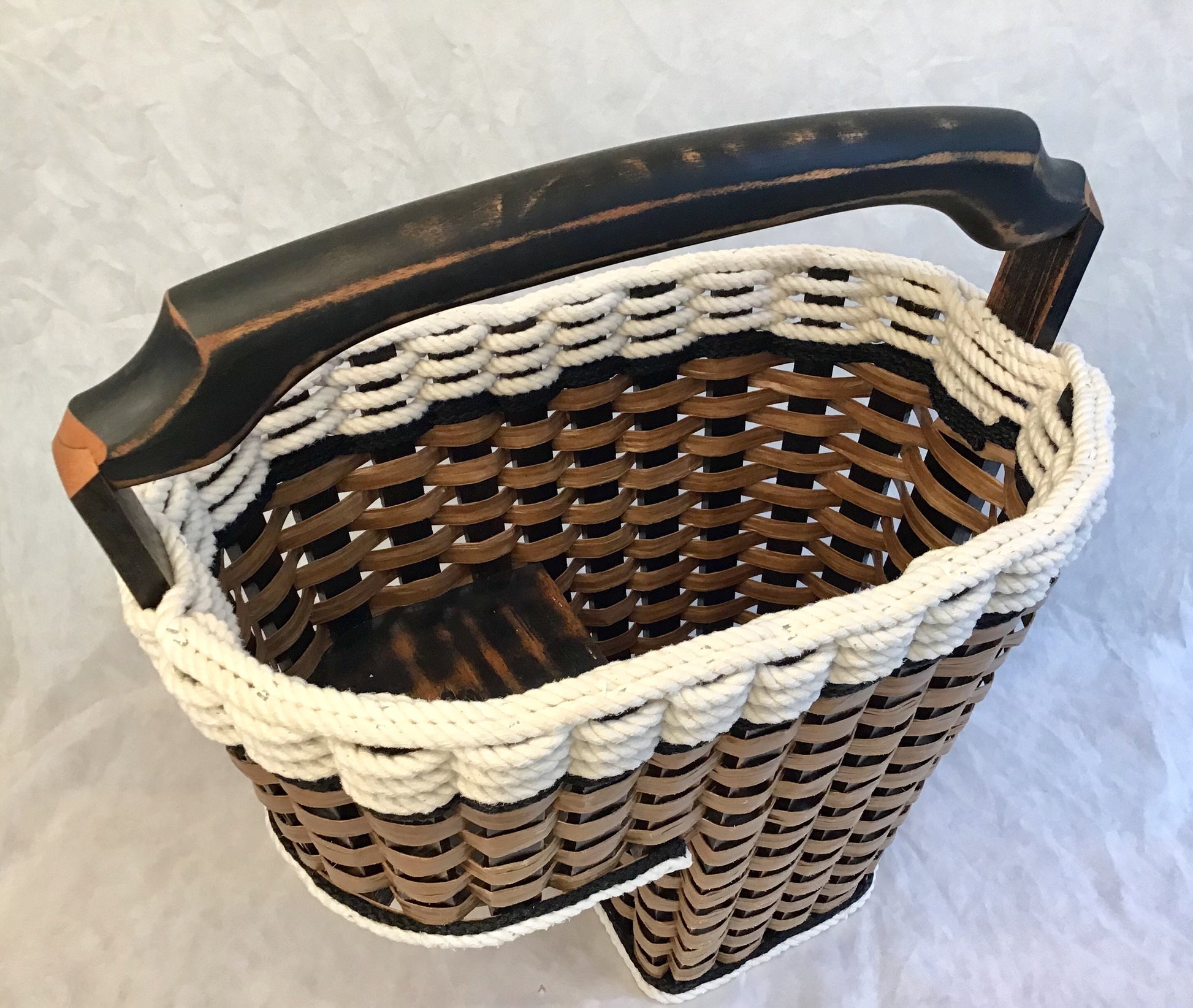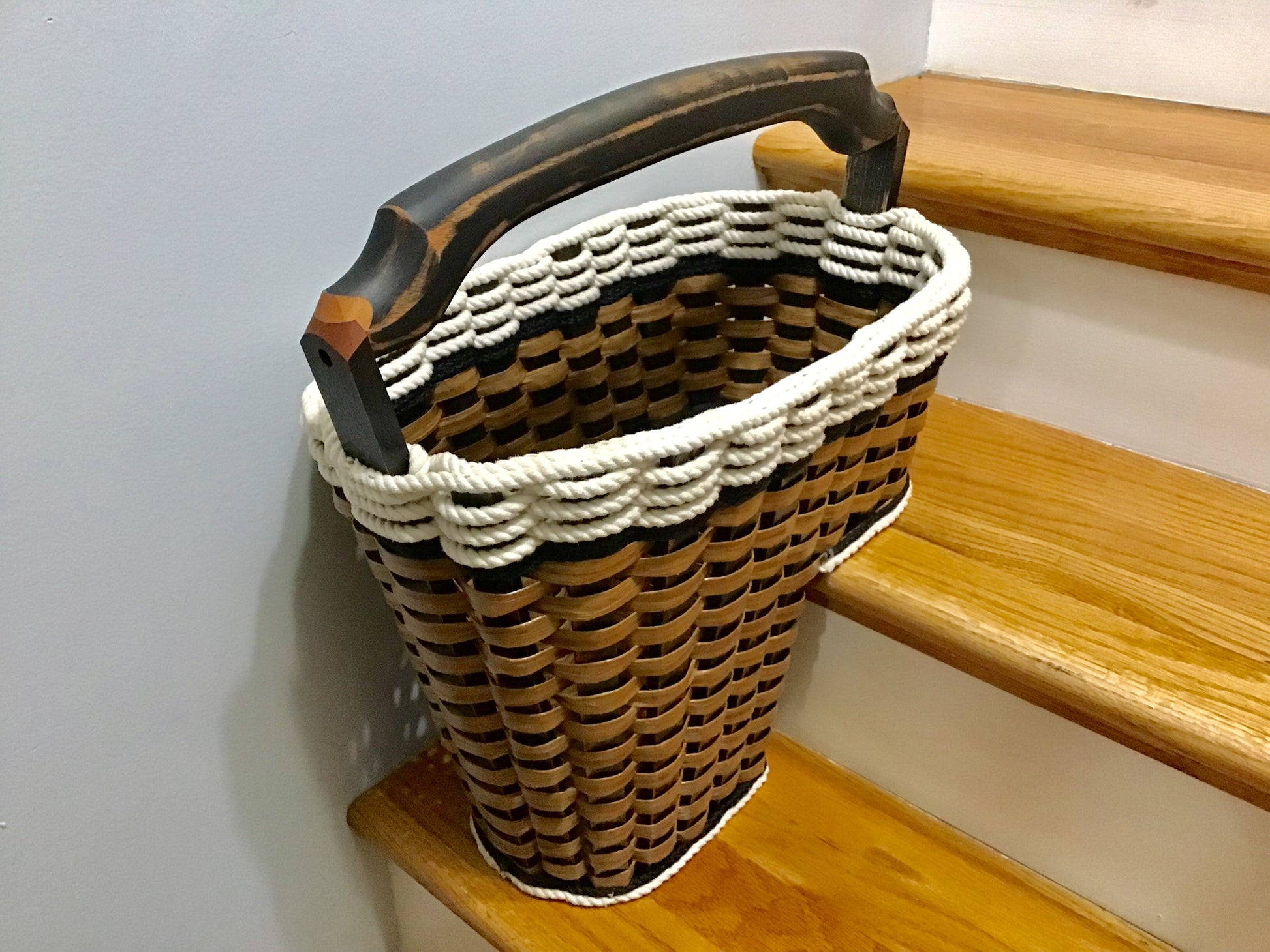 Do you have a two story home? If you do then our step basket will make your life easier and keep your stairs from becoming cluttered. Just put items that need to go upstairs in your basket and then when you are ready to climb those stairs, our large beautiful handle allows you to grab the basket easily so that it can be emptied. Our new Cottage Black Collection is so beautiful and clean looking with the large cotton braided cord. This basket will easily become one of your favorites!
