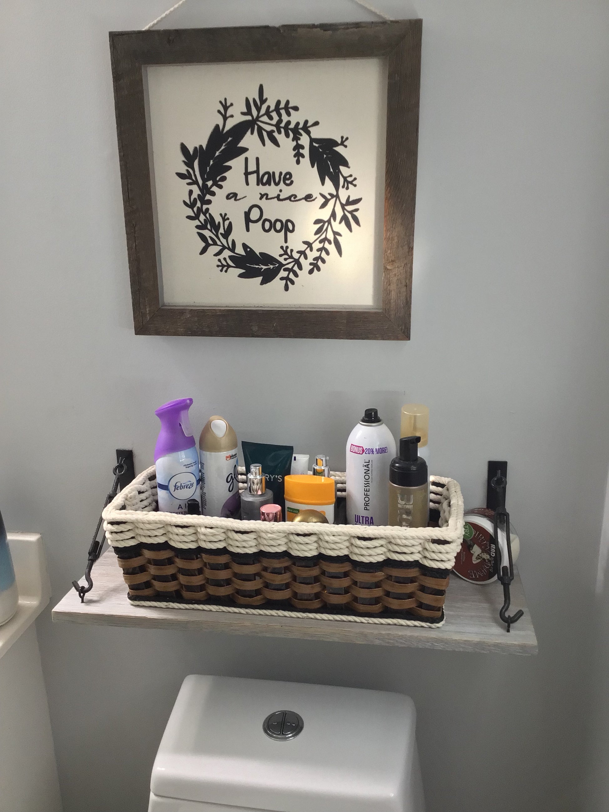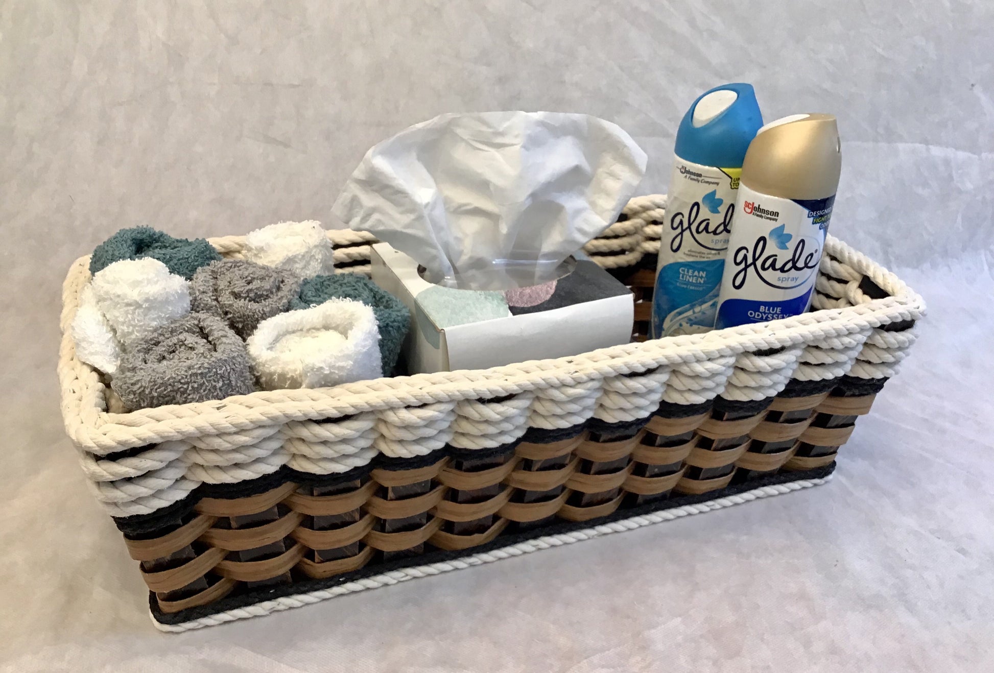 Do you need extra room in your bathroom? This basket is designed to fit on the back of your toilet for more storage. Great for small bathrooms, powder rooms, college dorm bathrooms. It will hold one box of Kleenex and or rolled washcloths, soaps, toilet paper, and your other bathroom needs. So it can be used as a decorative or functionable piece. And who doesn't need a air freshener handy!