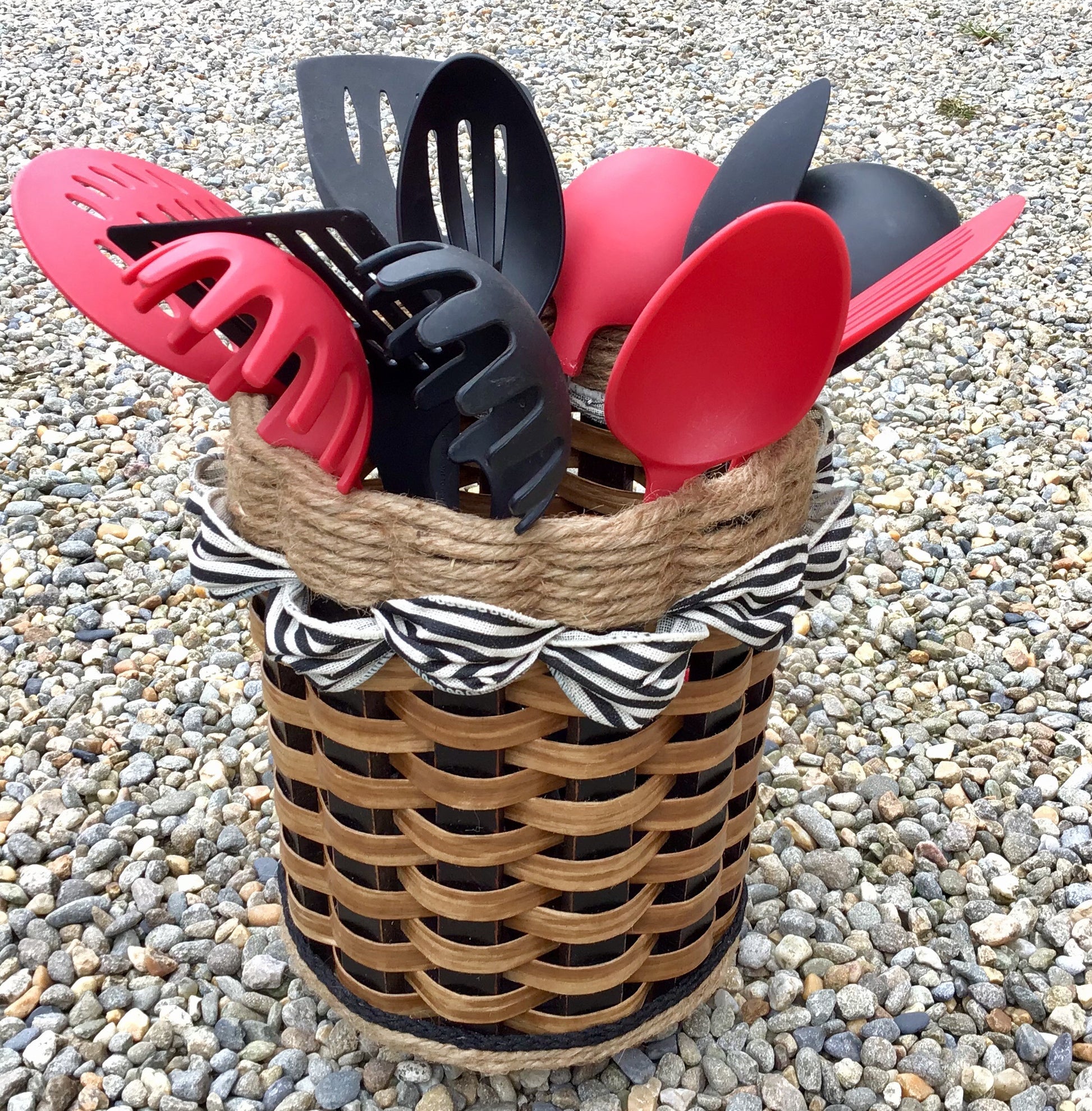 Are you tired of not being able to find the utensil you have crammed in your crock or drawer? Well this basket is on a Lazy Susan! So with our Utensil Lazy Susan basket there will be no need to pull the basket from the wall simply spin it around to get the one you want. We make this basket tall so that it can spin in a corner, otherwise your utensils would lean over the basket needing a larger circumference to spin. With our Shabby Chic Collection the wood in the basket is distressed black or white. Also you can choose ribbon or just cord.